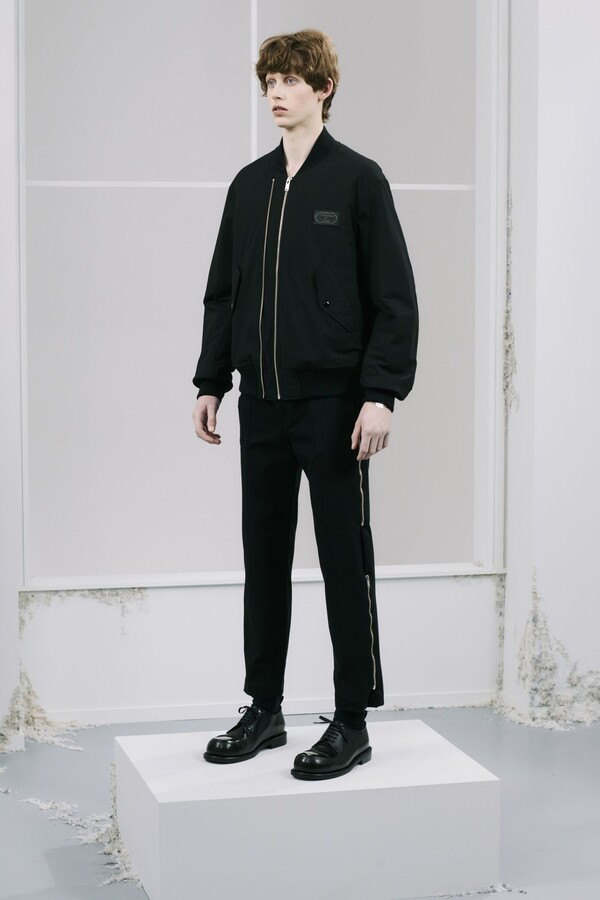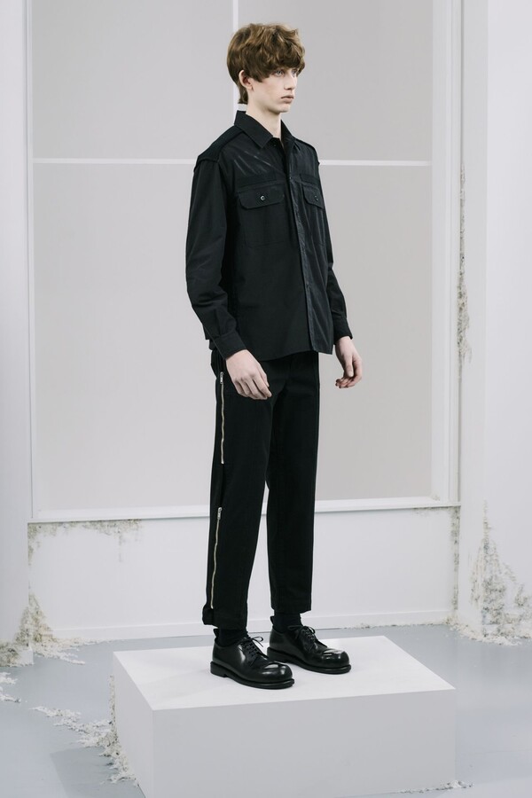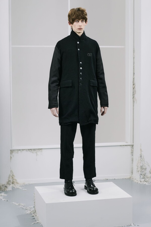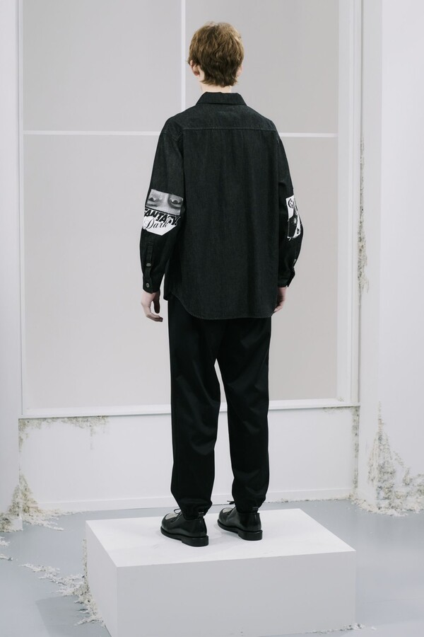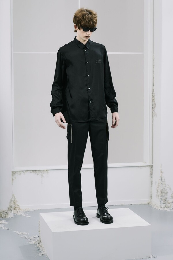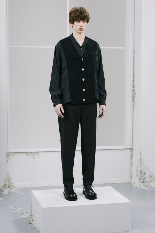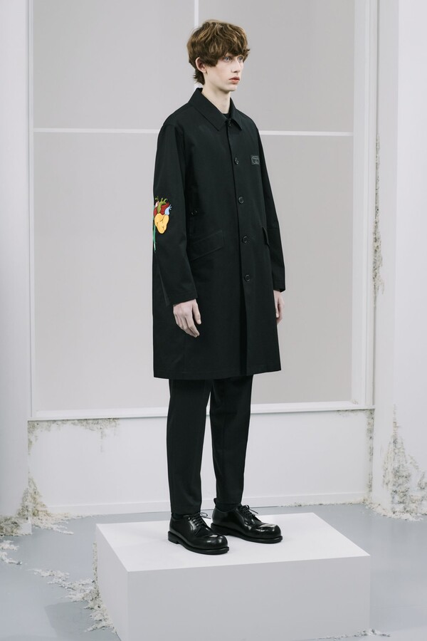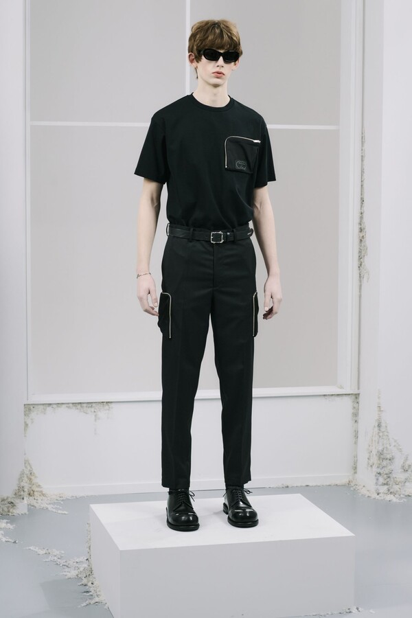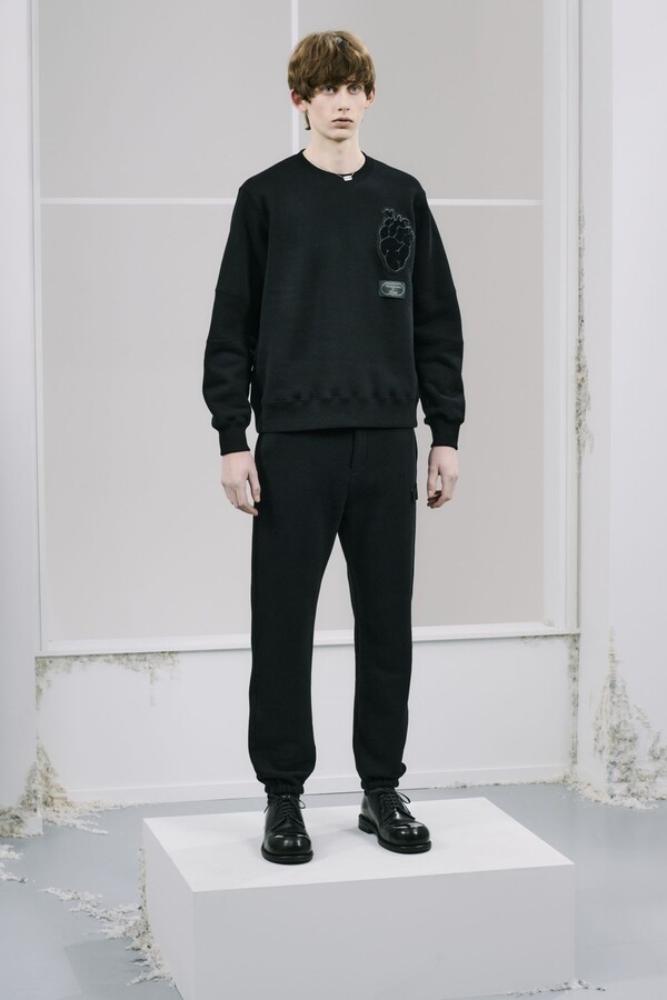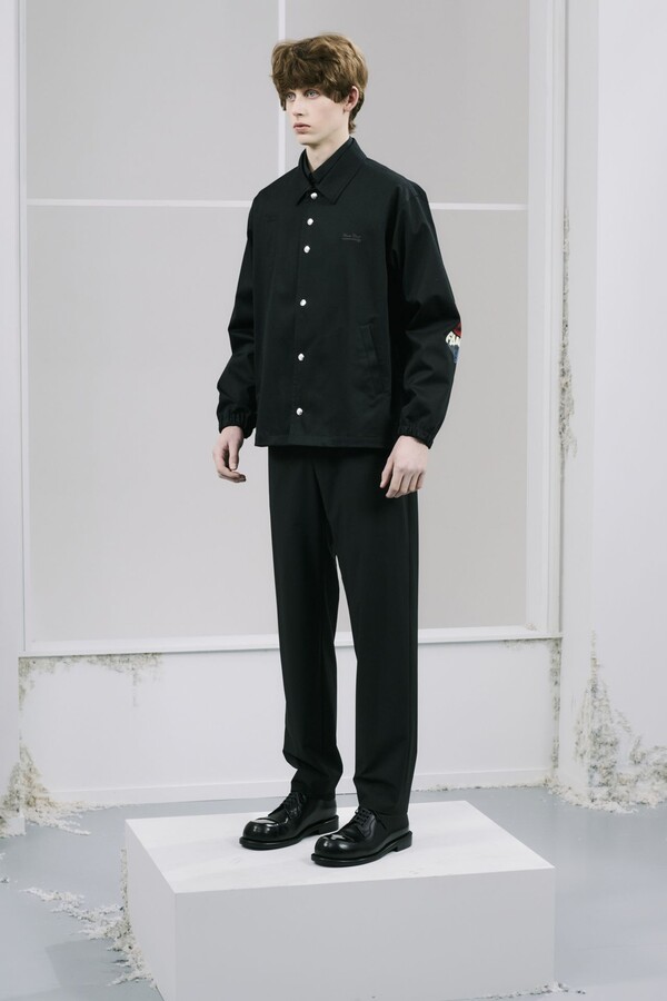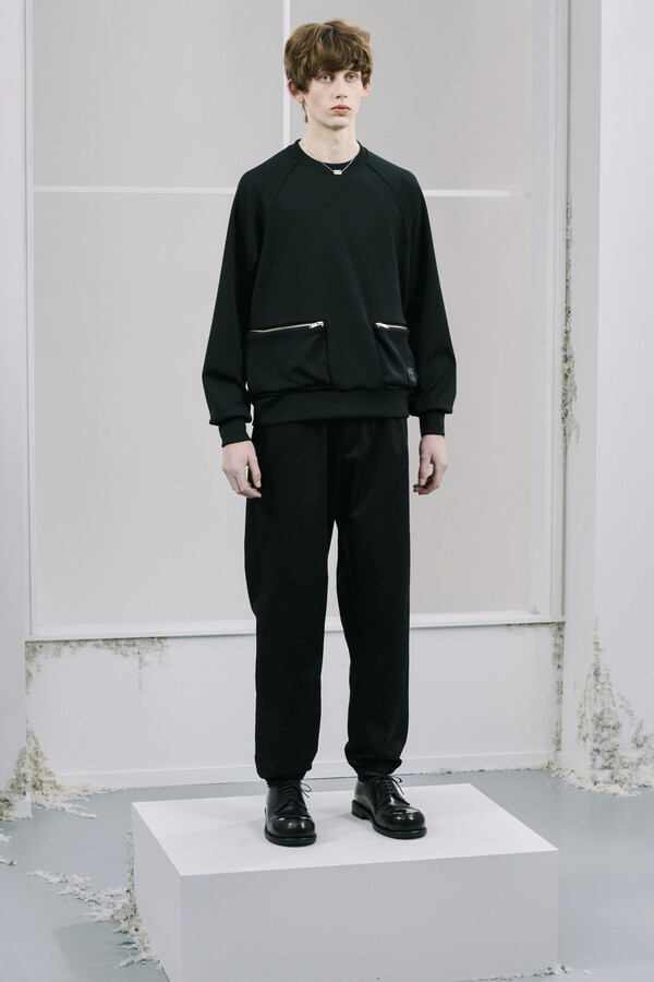 该系列几乎全部采用黑色,强化了 UNDERCOVER 一贯的暗黑风格,同时又让细节清晰可见。部分夹克的肘部绣有解剖学心形图案,营造出一种静谧的哥特式点缀。拉链作为一种统一的设计元素贯穿始终,兼具功能性和象征意义。方形拉链口袋出现在 T 恤、开衫和修身西裤上,为原本简约的服装注入了一丝实用主义和略带粗犷感。