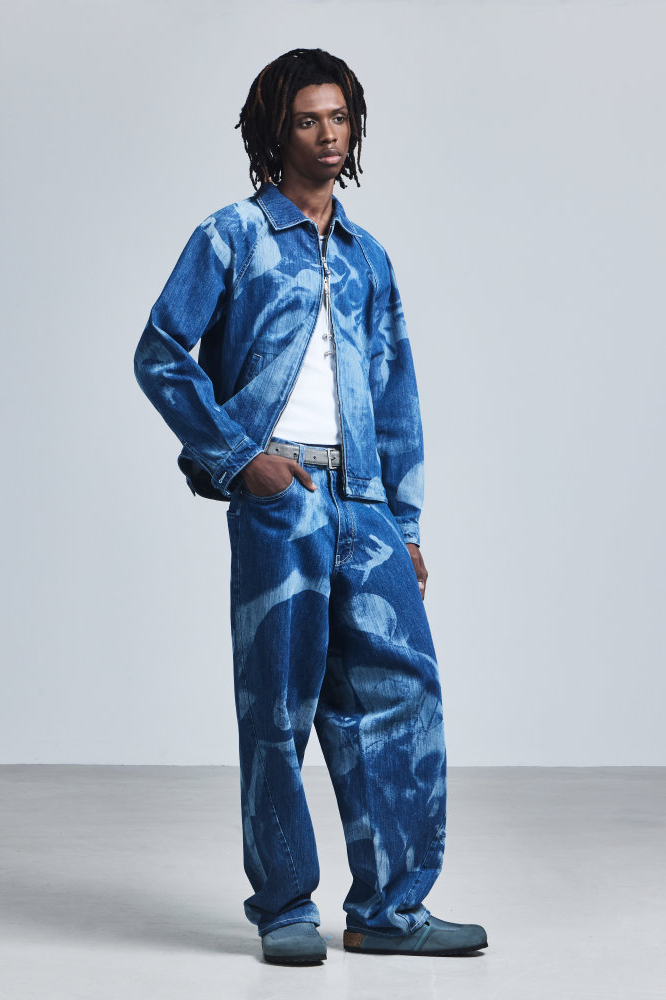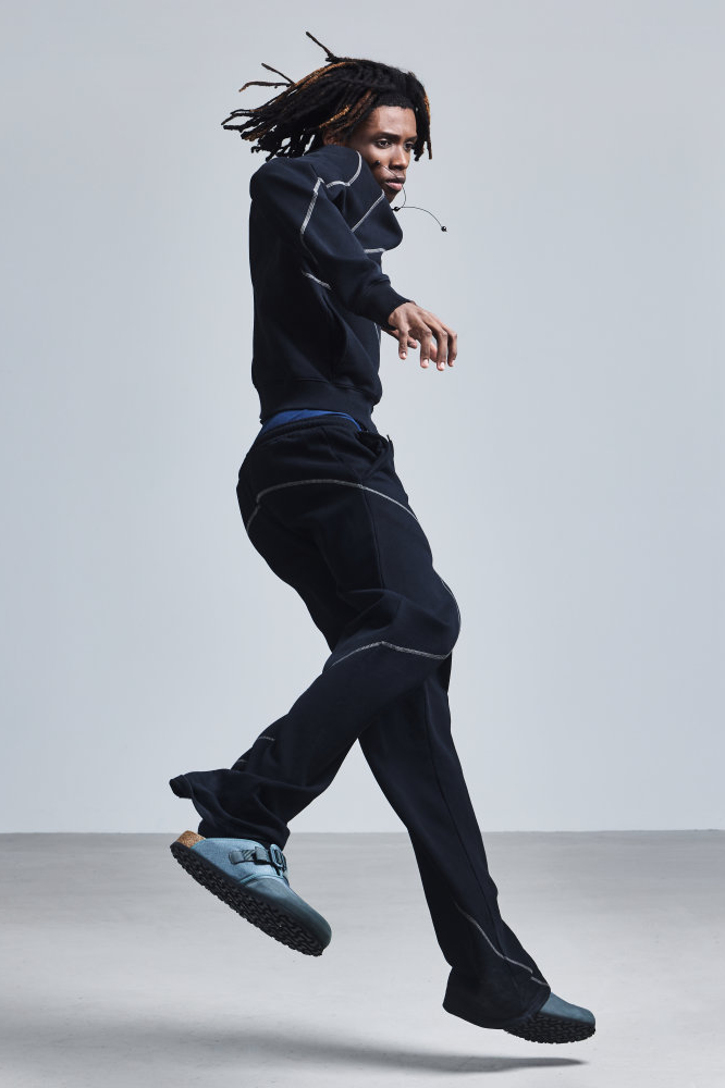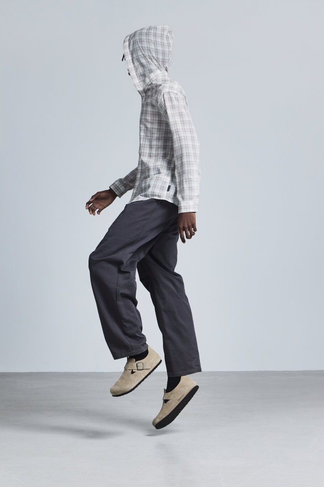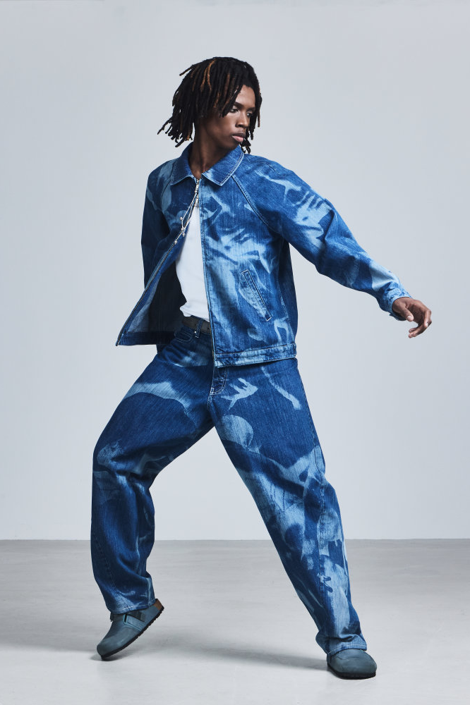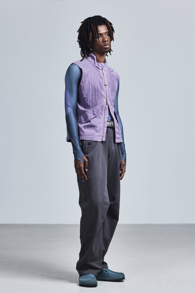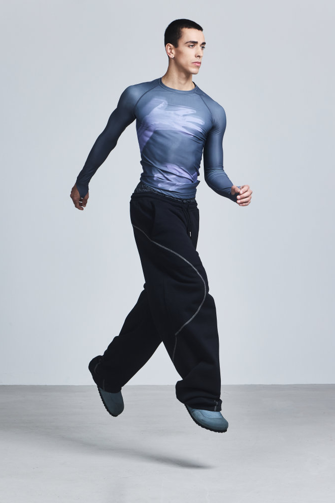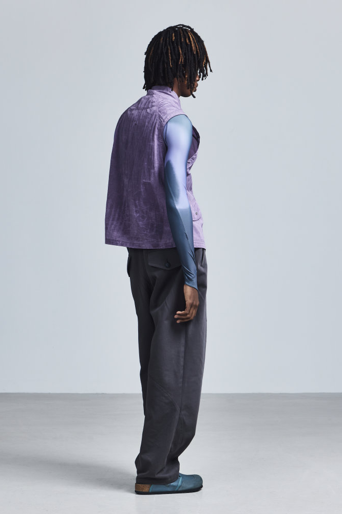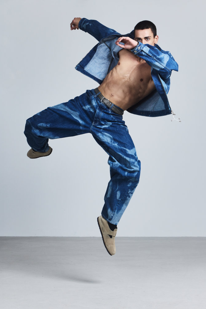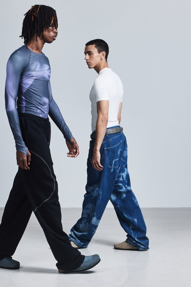 主打单品直接体现了这一点:弹力亨利领上衣紧贴身形,采用不对称的开合设计;紧身背心胸前印有拉伸的手印,象征被拥抱的感觉;厚重的牛仔套装上则激光雕刻着两个交缠人像的抽象图案。品牌标志性的动感剪裁飞行员夹克、运动套装和高性能背心也再次回归,同时还推出了以防水棉府绸面料制成的连帽牛津衬衫等更多剪裁精良的款式。色彩方面主打柔和的灰色、浅黄色和淡紫色,强调结构感与流动性之间的平衡。
