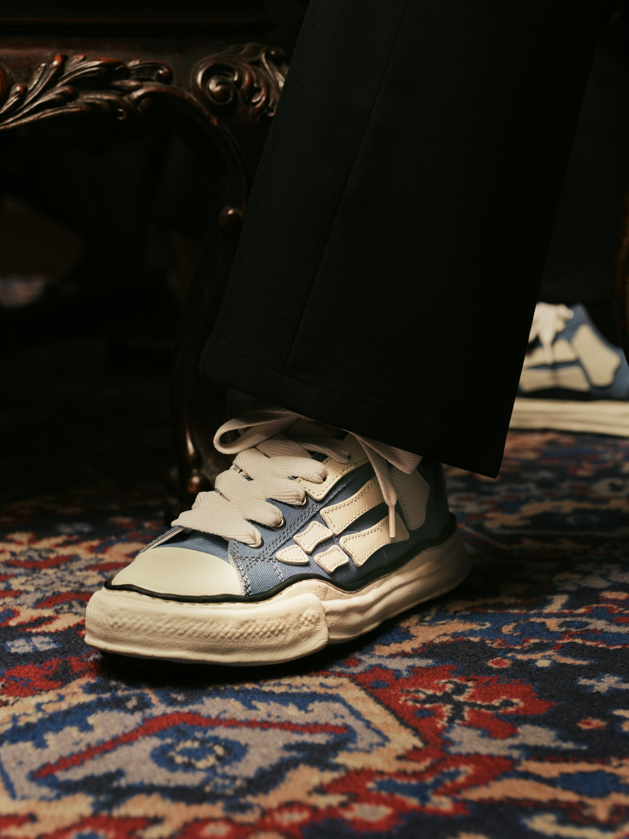 AMIRI 与 MAISON MIHARA YASUHIRO 近日发布联名系列第二弹。该系列以 Skel Top-Low 与 Peterson OG 为原型,将 AMIRI 标志性的纳帕皮革「骨骼」贴花与 MMY 独特的粘土手工模制鞋底完美融合,呈现出强烈的材质对比与雕塑美感,推出全新蓝白配色。