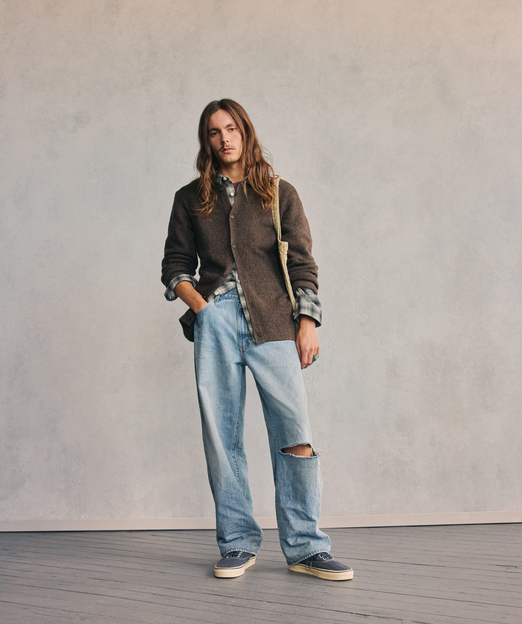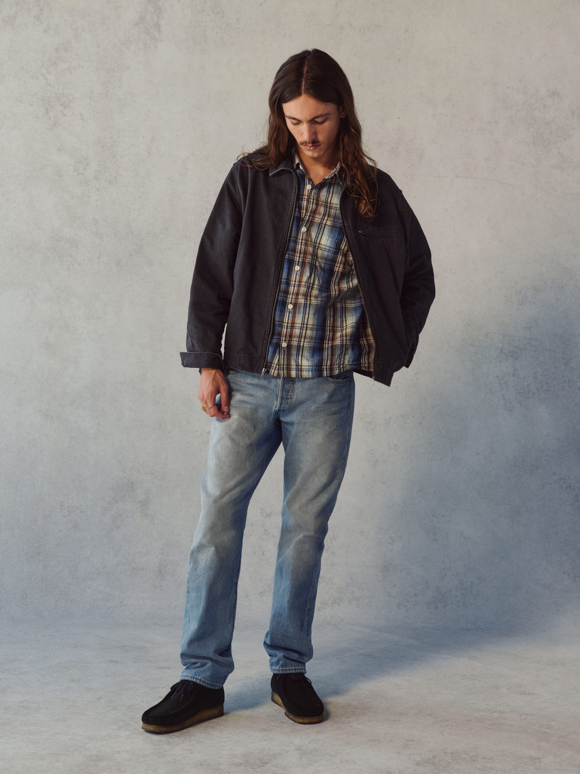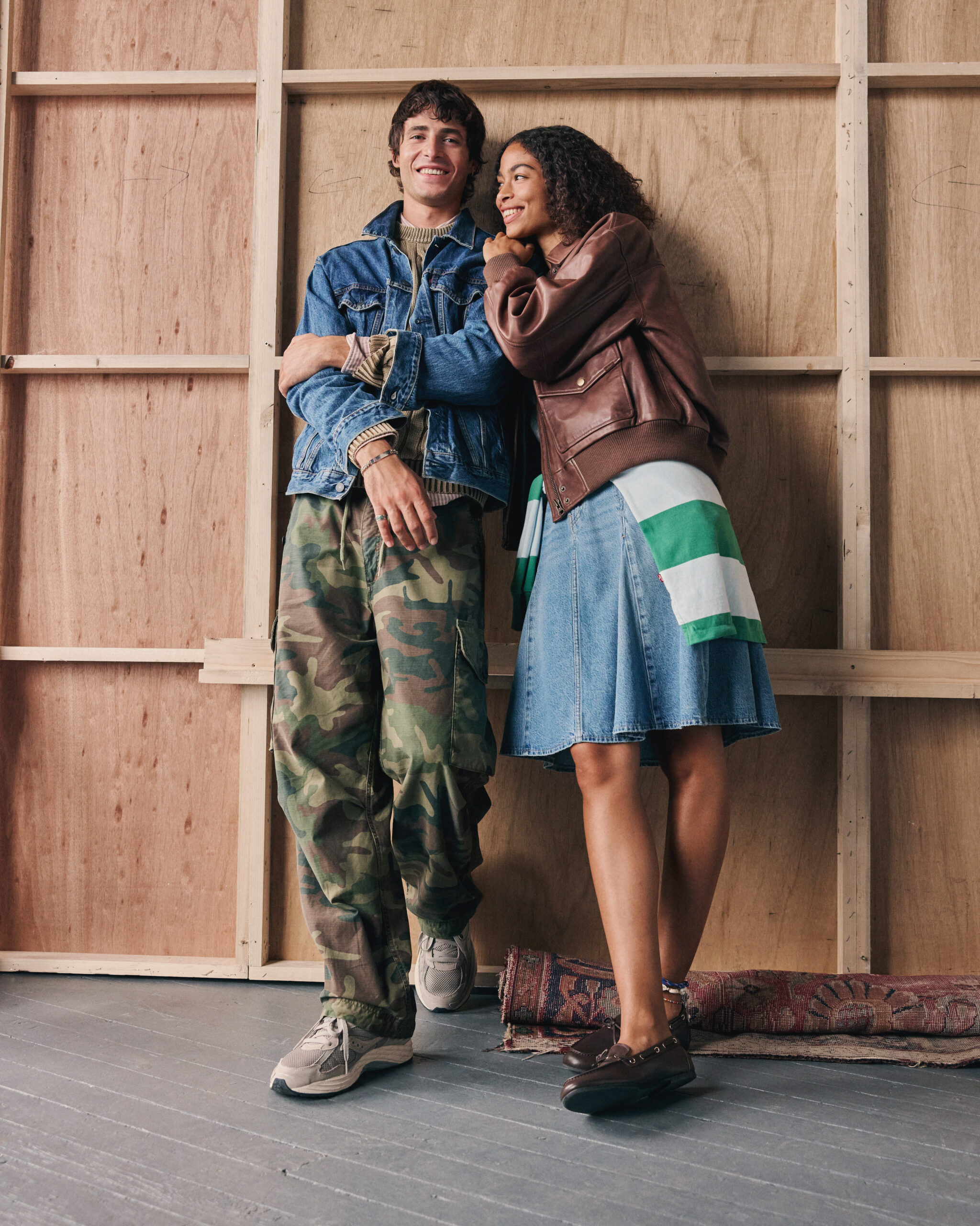本季男装系列深入诠释「废土学院风」的矛盾美学,以宽松廓形、复古水洗与粗砺质感为核心,重塑 90 年代不羁灵魂与现代精致感的融合。裤装以标志性的宽廓版型引领风格,578TM Baggy 牛仔裤以慵懒而不失结构的剪裁,搭配水洗丹宁与做旧细节;XX Chino Authentic 休闲裤则以柔软面料与流畅线条,为穿着体验增添一份闲适的优雅。同时,517TM Bootcut 与经典的 501® Original 则以标志性剪裁,致敬品牌档案。上装通过层次叠穿尽显风格巧思:纽扣格纹衬衫与拉链连帽外套进行碰撞,外套搭配 MA-1 飞行员夹克,进一步平衡硬朗气质与精致的视觉张力。绞花圆领针织衫以细腻纹理丰富整体造型的节奏感,搭配绿色双肩包,为造型融入自然率性的气息。