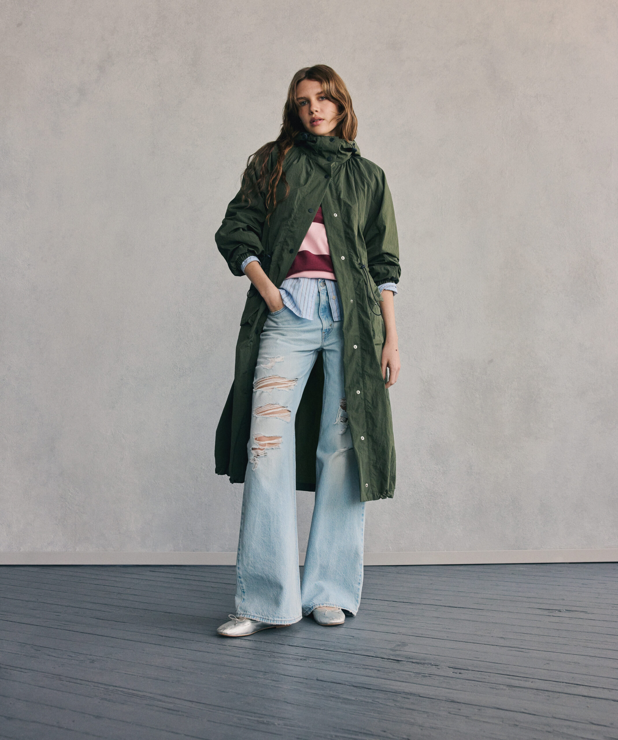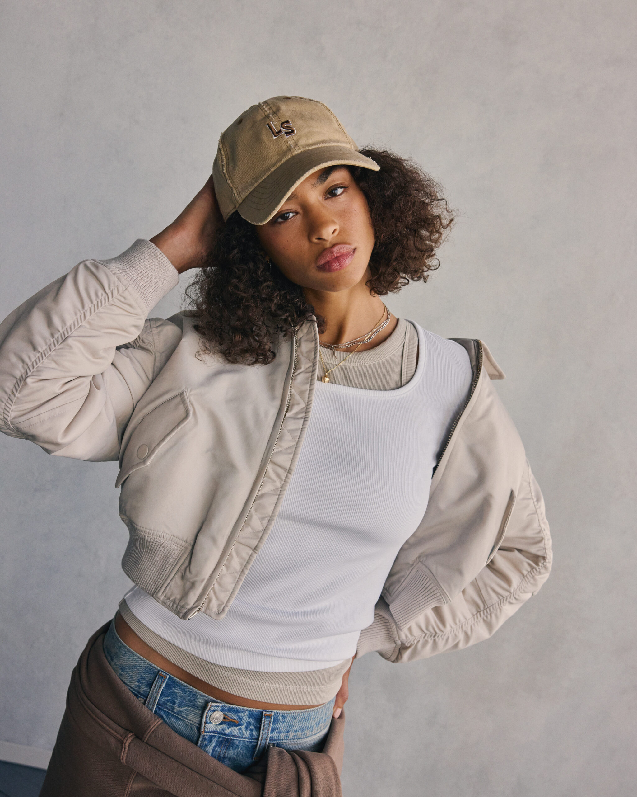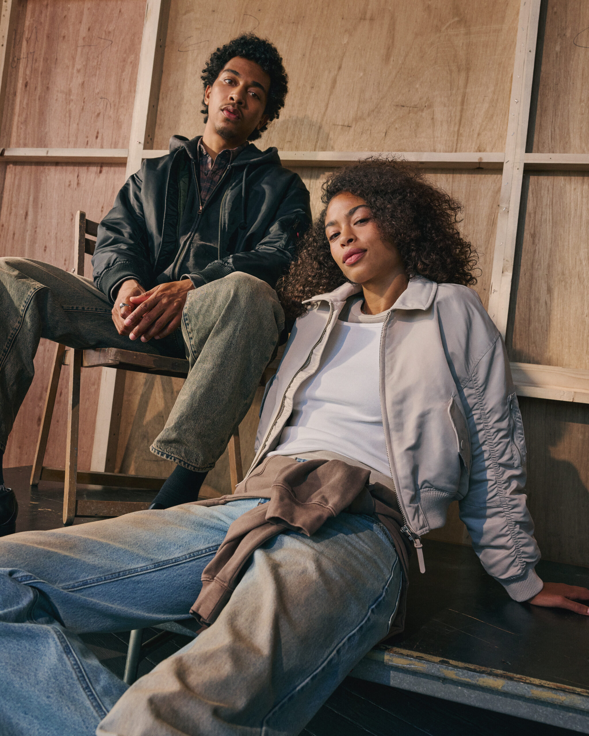 女装系列以松弛姿态解构复古美学,裤装主打多元的廓形表达:从展现自然线条的 Loose Boot,到极具造型感的 Baggy Dad Barrel,均以流畅剪裁和做旧处理,营造出慵懒而有力的女性轮廓。上装则强调层次与质感的趣味混搭:毛圈卫衣与运动背心叠穿;纹理多样的针织衫,为内搭提供更多细节;Balloon 牛仔夹克与白色长袖 T 恤则通过剪裁与细腻面料,赋予造型更多可能。此外,Bowie 短款飞行夹克为整体注入个性亮点,而 Simone Bubble 派克大衣则以军绿色调与蓬松廓形,诠释机能美学;点缀其中的橄榄球衫,则注入一抹运动活力。配以扭结手提包,彰显不经意间的精致态度。本系列鼓励女性打破穿搭边界,不刻意,却自有态度。