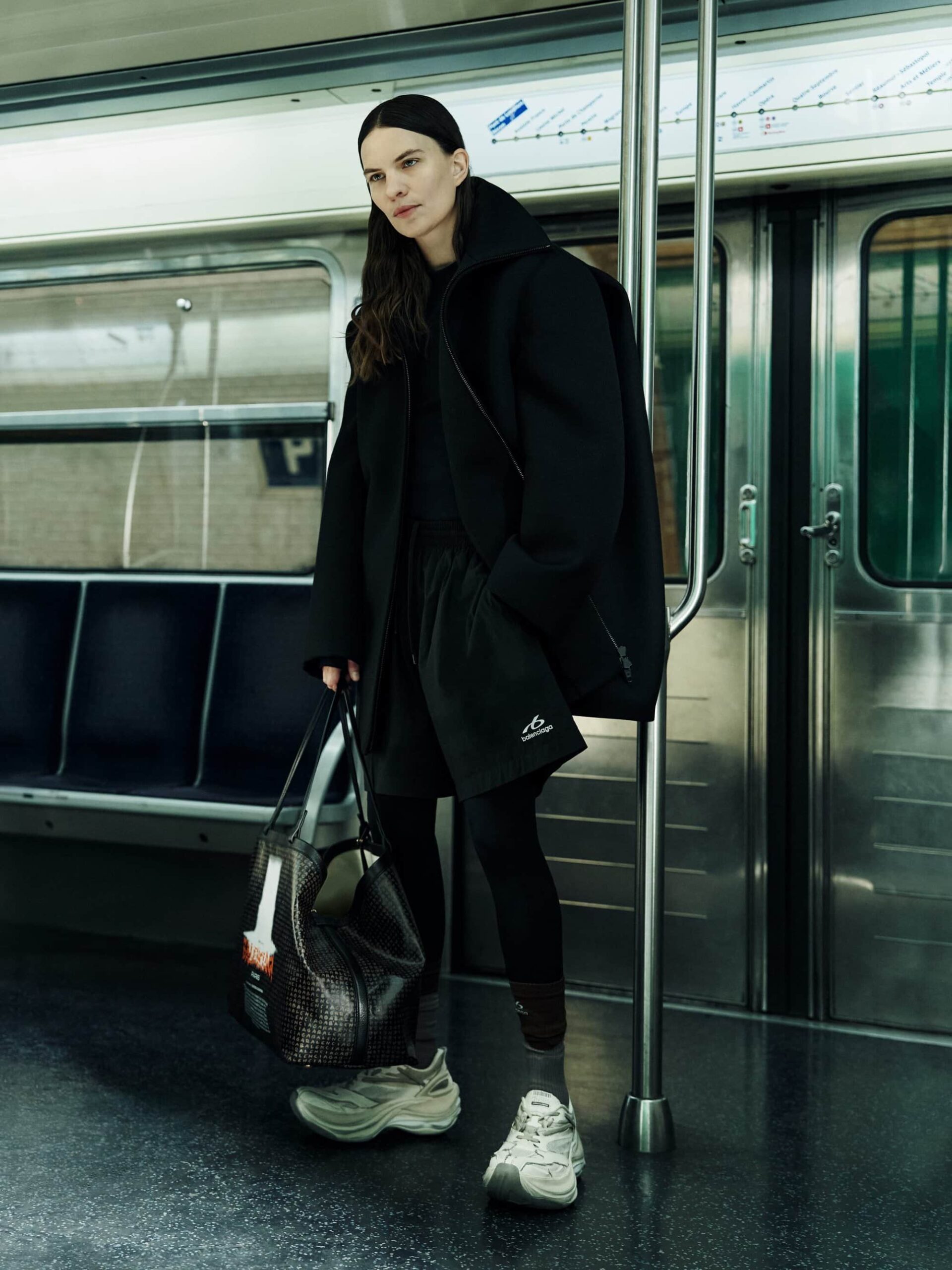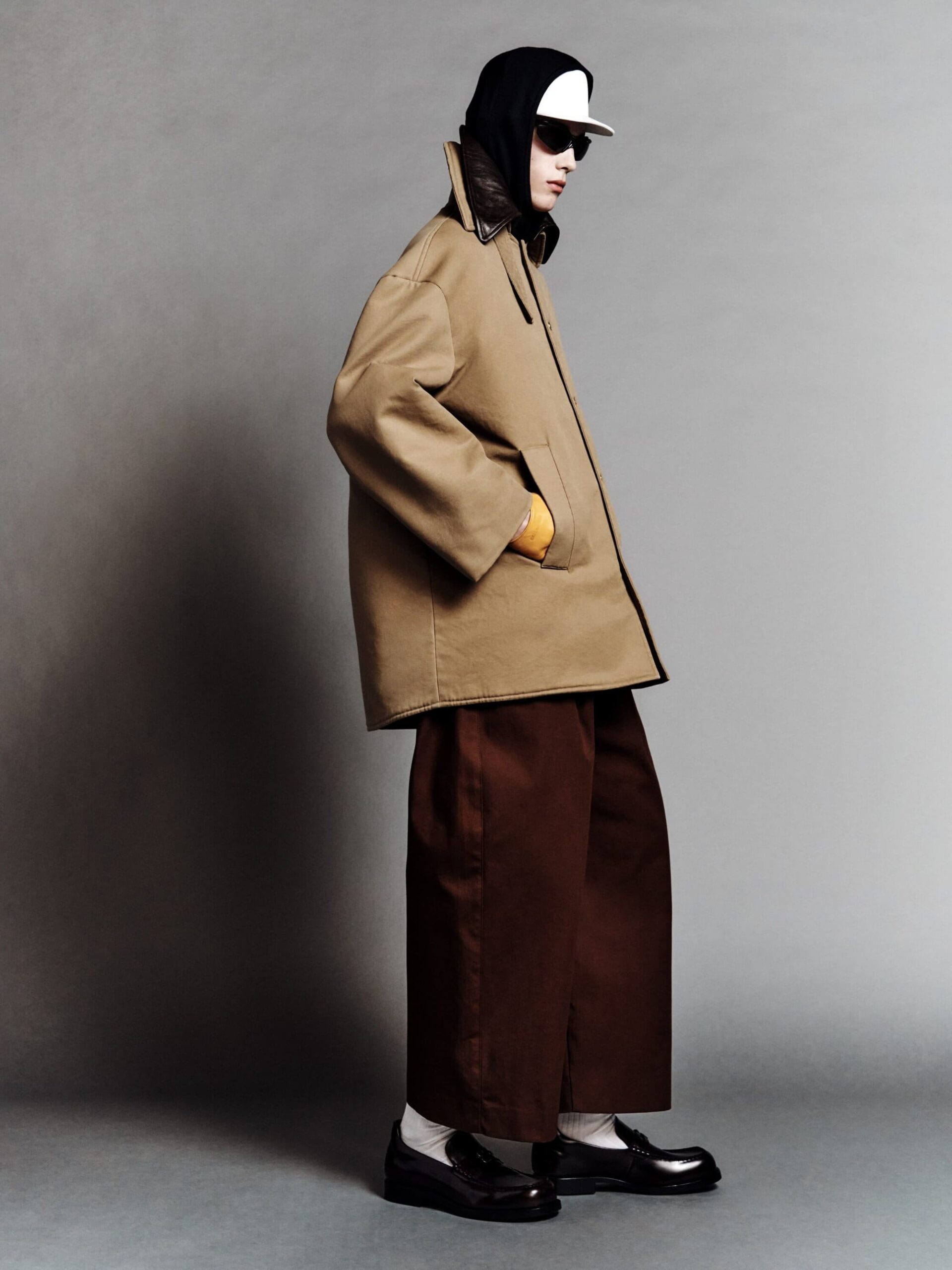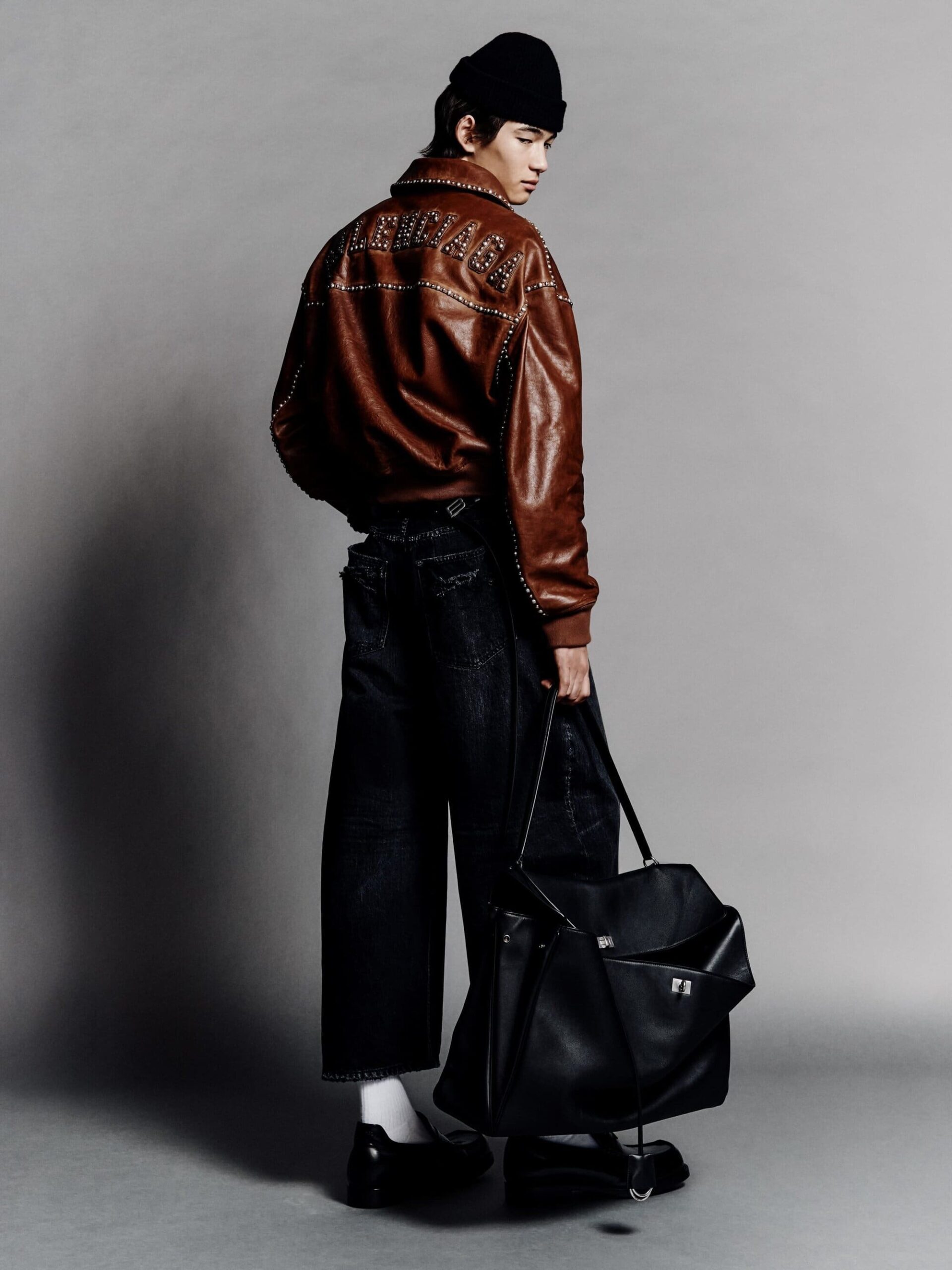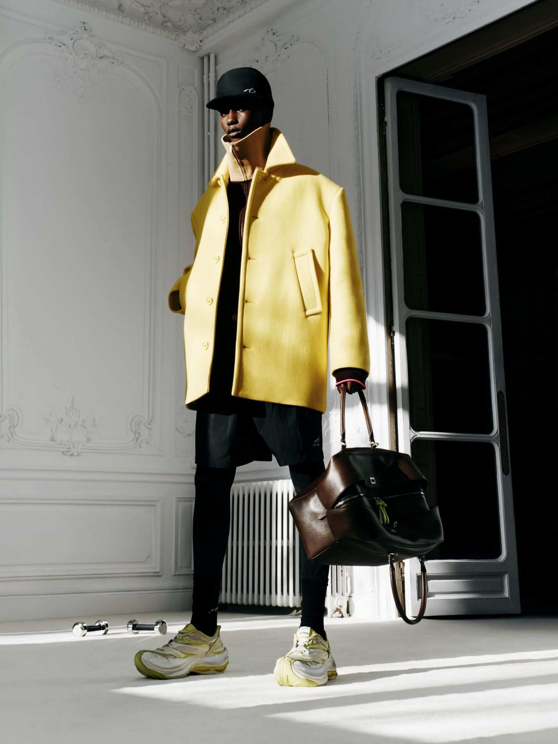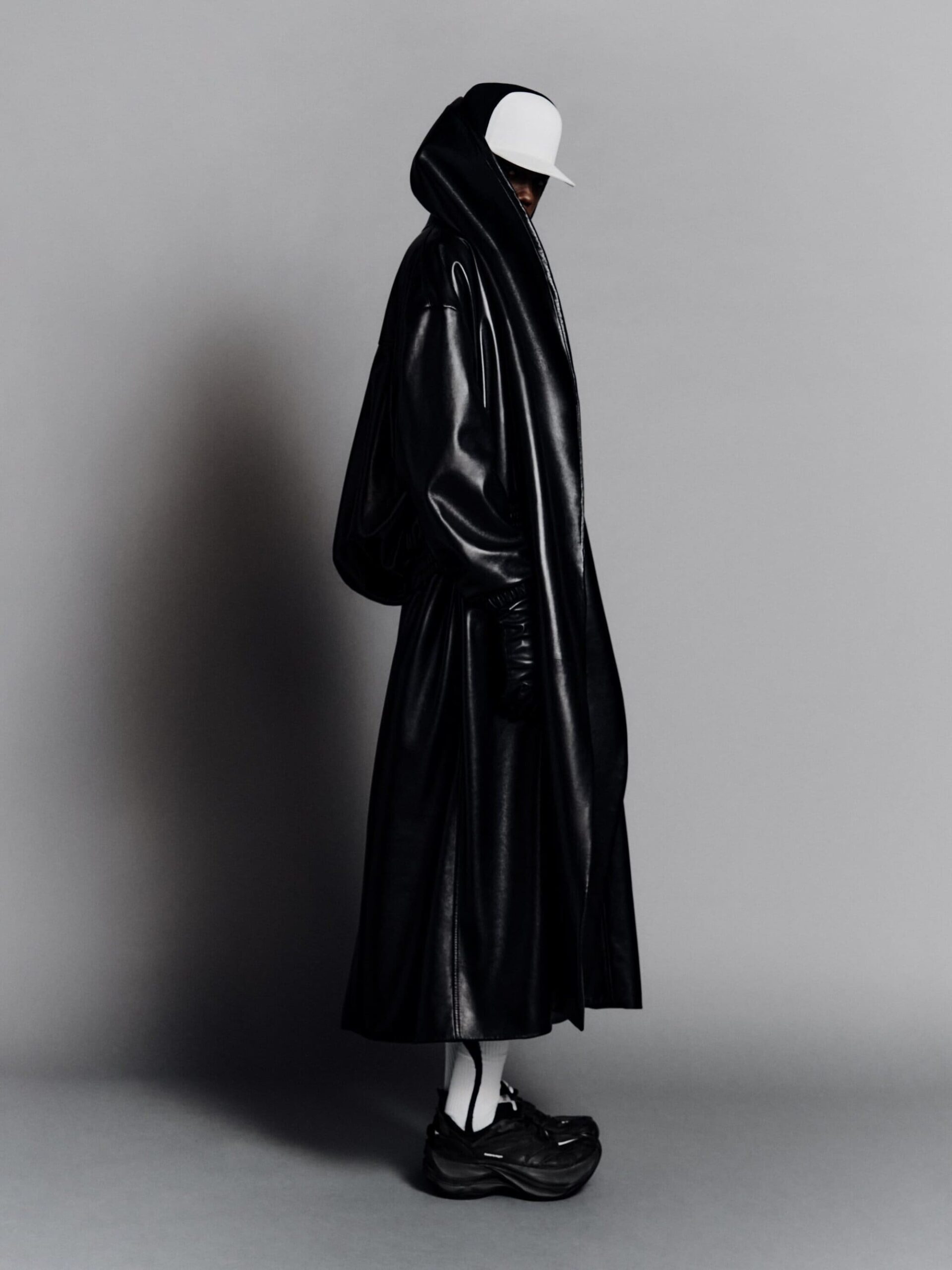 本系列将紧身连体衣与连裤袜定义为「科技服饰」,强调不仅具备装饰性,更拥有真正的运动表现力。品牌标志性的巨型运动鞋也迎来了轻量化革新,使其真正能够胜任跑步与运动。在致敬创始人 Cristobal 时,Piccioli 巧妙转化了经典廓形:男装骆驼绒大衣参考了创始人为自己裁剪的私人物品,而皮革夹克与流线型长裙则融入了标志性的露肩颈线与茧型剪裁。