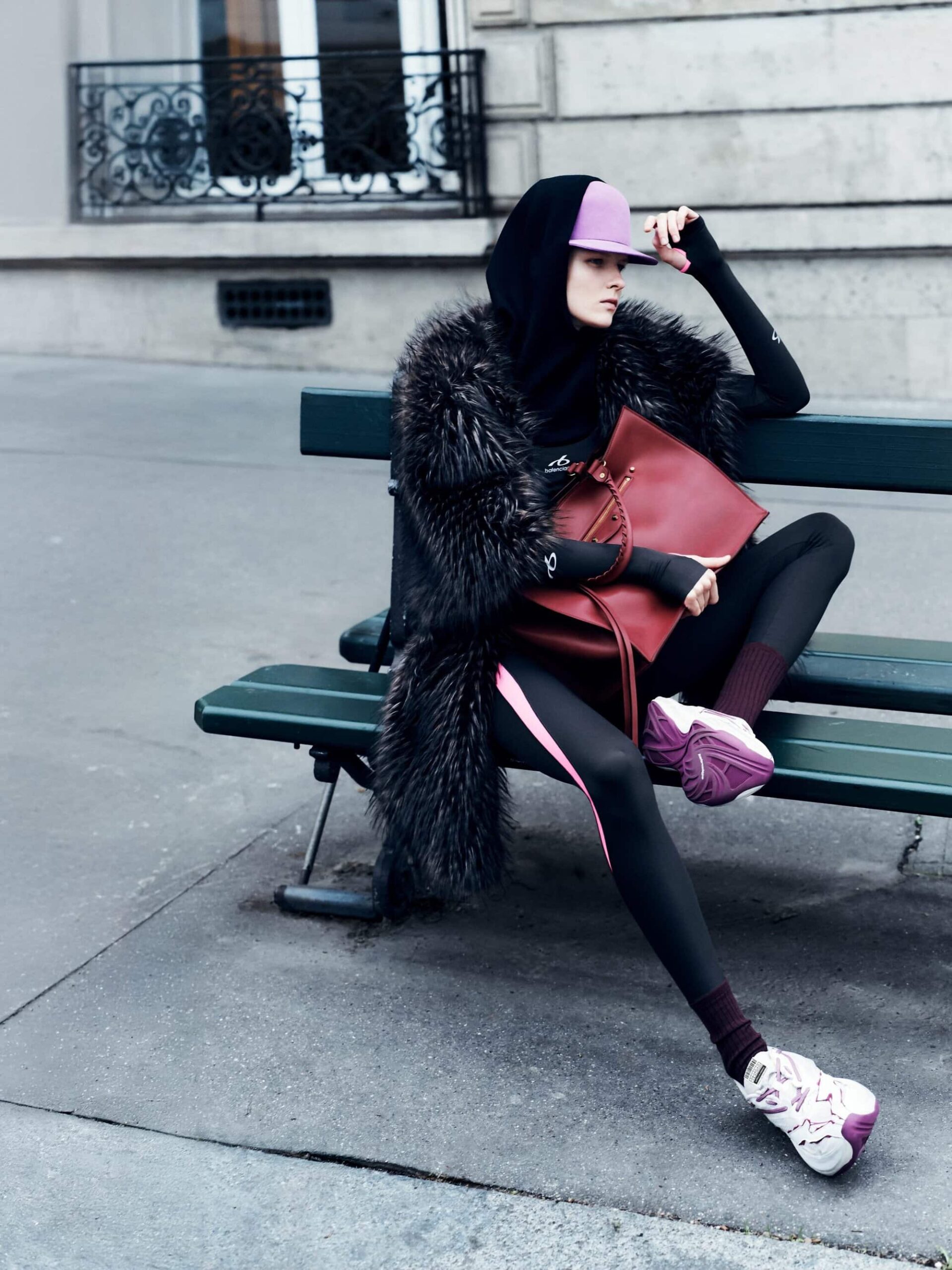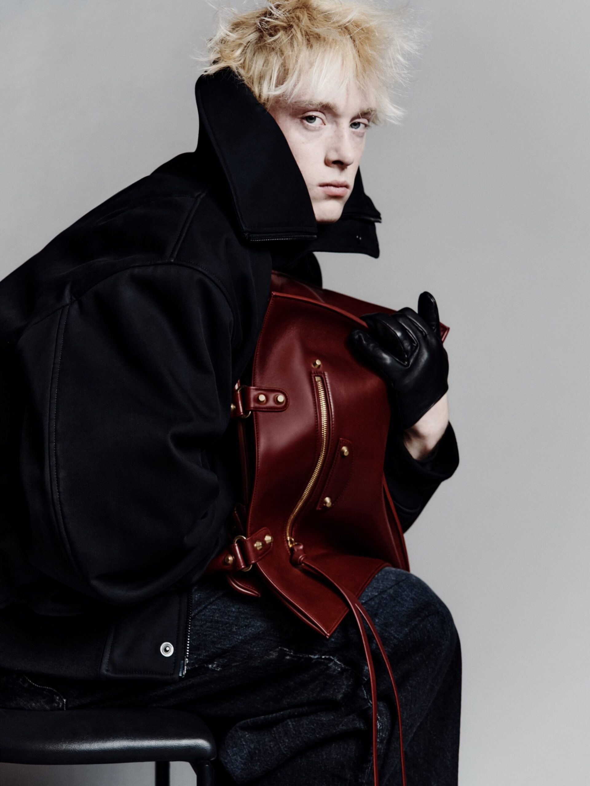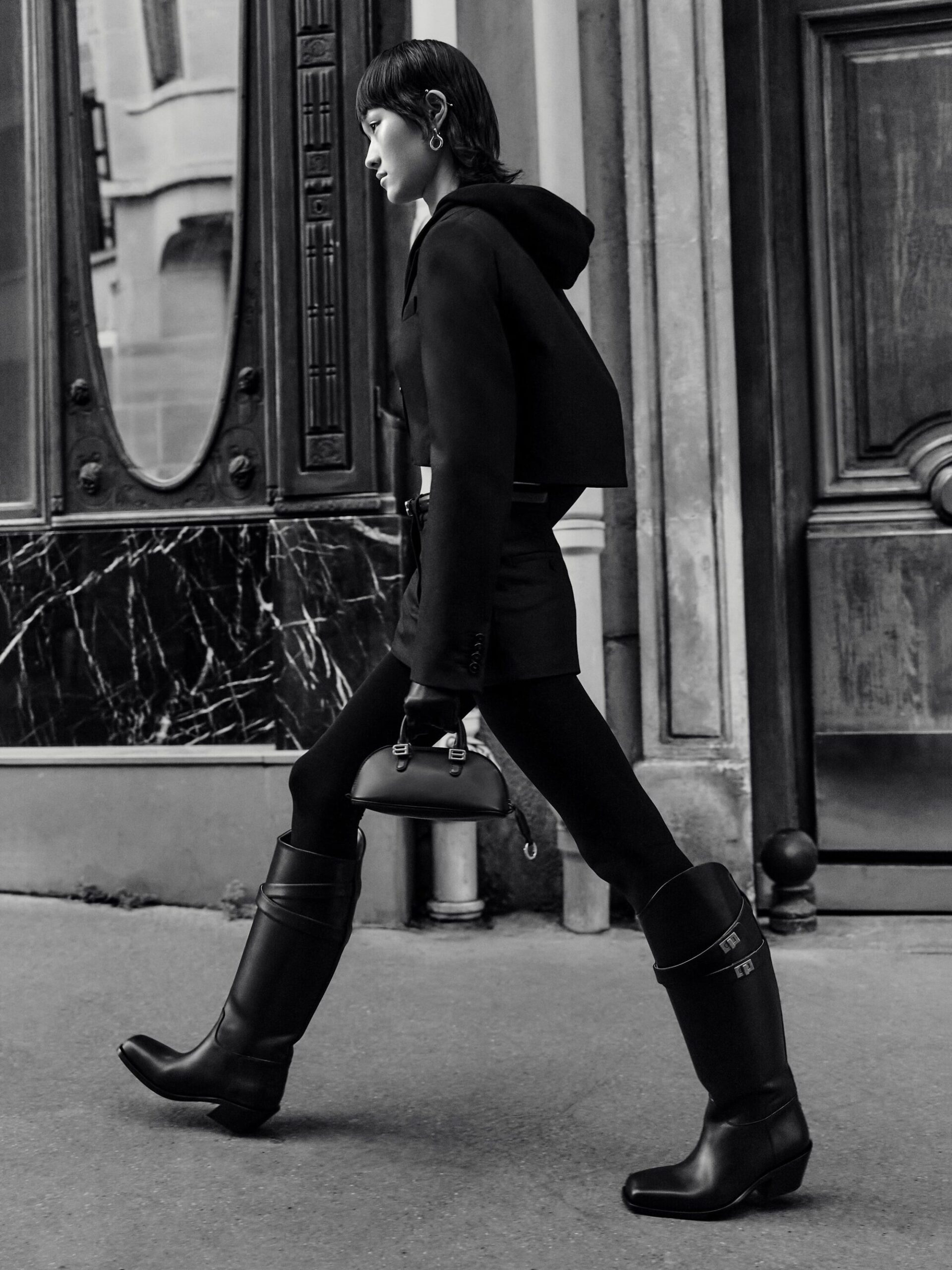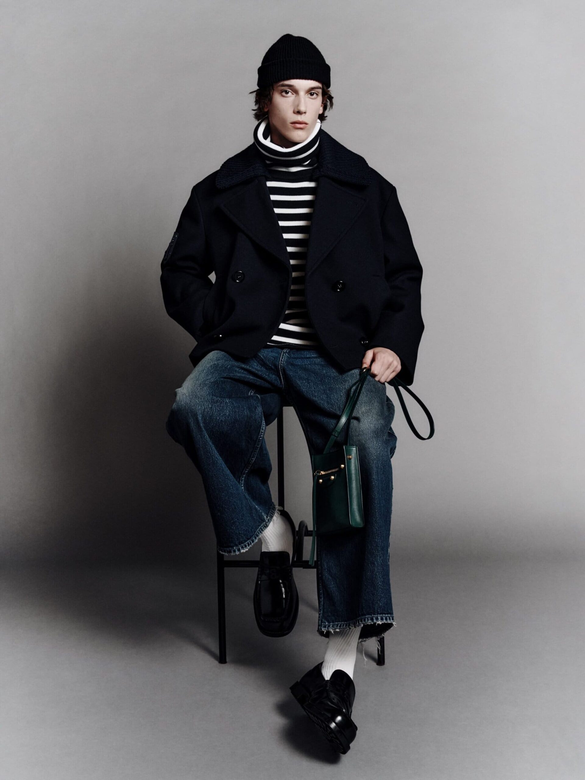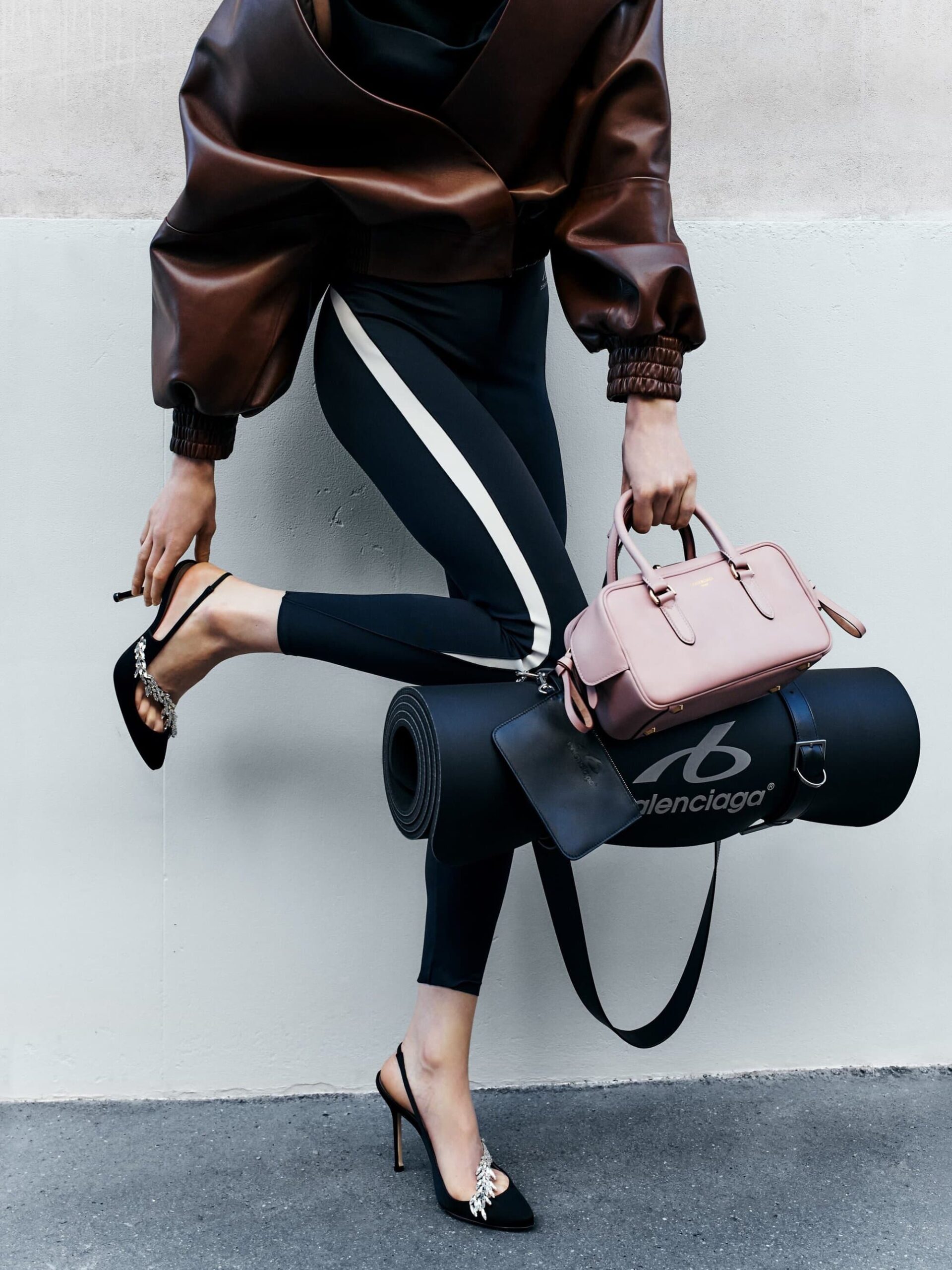 本系列将紧身连体衣与连裤袜定义为「科技服饰」,强调不仅具备装饰性,更拥有真正的运动表现力。品牌标志性的巨型运动鞋也迎来了轻量化革新,使其真正能够胜任跑步与运动。在致敬创始人 Cristobal 时,Piccioli 巧妙转化了经典廓形:男装骆驼绒大衣参考了创始人为自己裁剪的私人物品,而皮革夹克与流线型长裙则融入了标志性的露肩颈线与茧型剪裁。