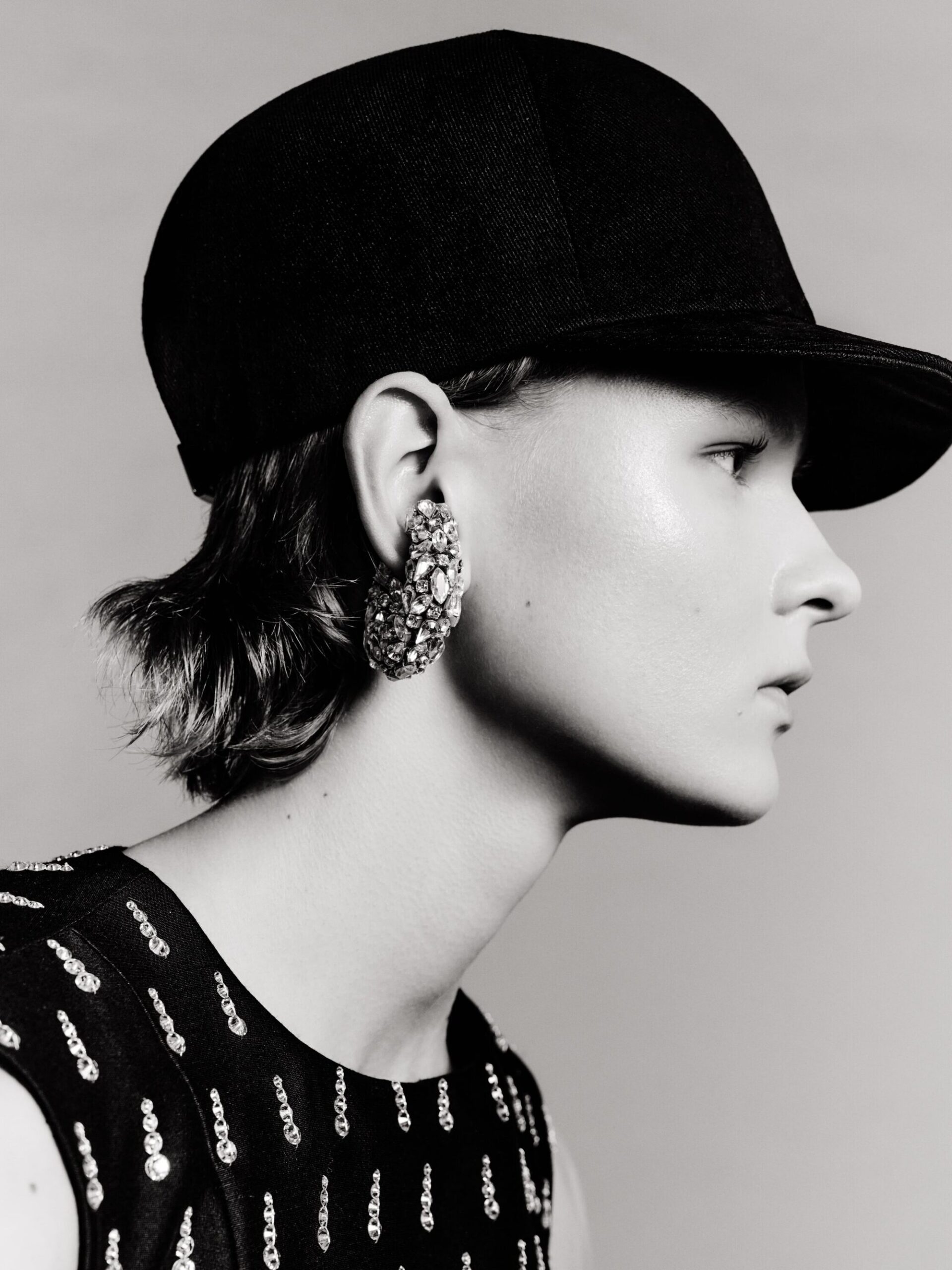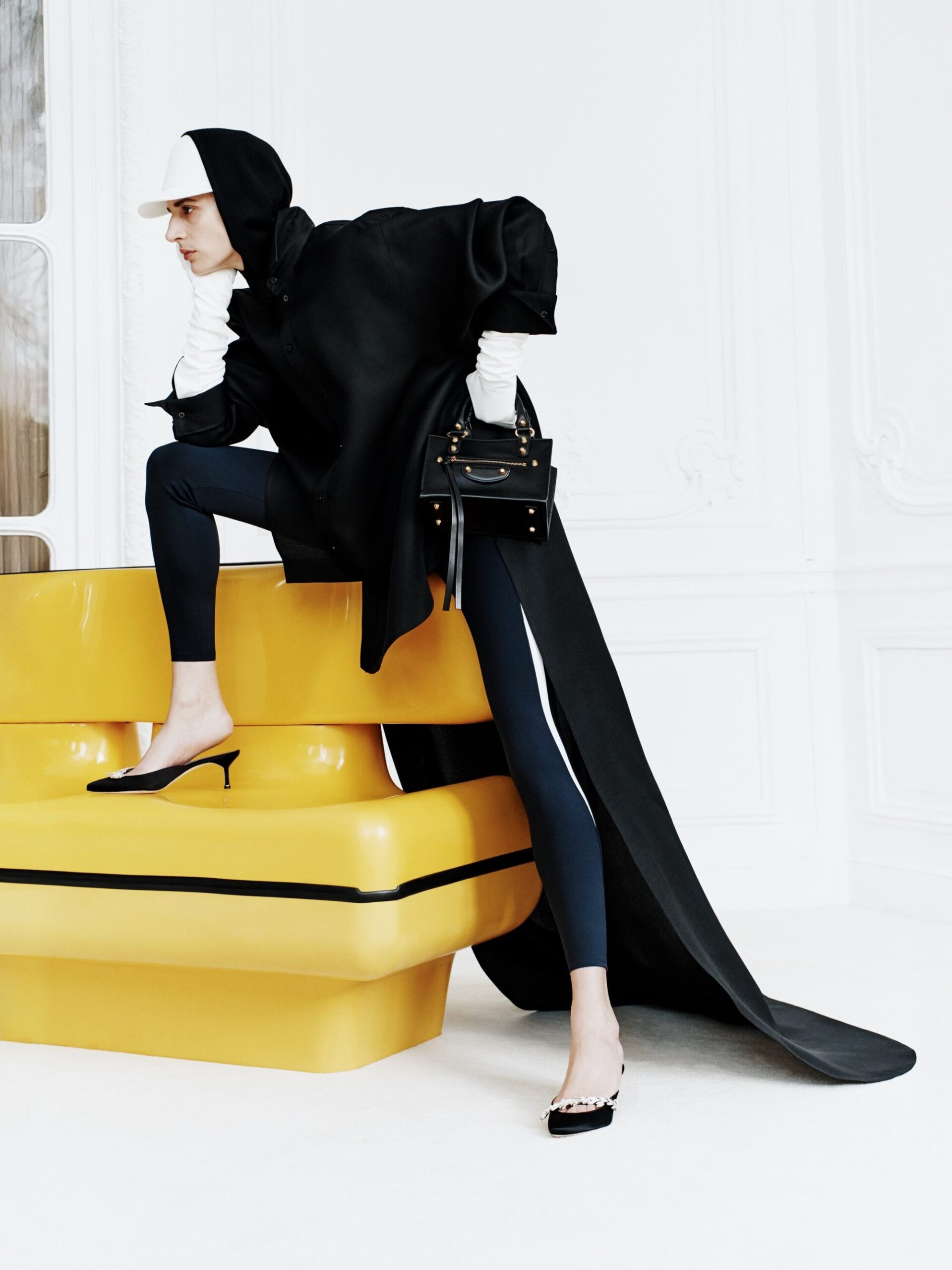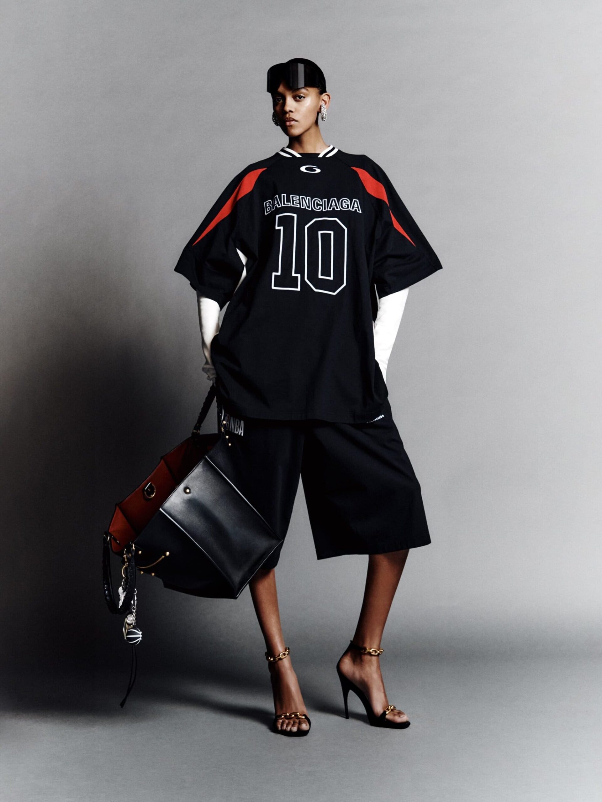 最引发热议的是对 2006 年经典「骑行帽」的复刻,Piccioli 将其与棒球帽构造结合,展现了高定逻辑与街头美学的概念碰撞。此外,系列还包含了与 MANOLO BLAHNIK 及 NBA 的跨界联名。Piccioli 试图证明,当下的 BALENCIAGA 既能承载在地铁里闪耀的亮片礼服,也能通过 jersey 面料让高定礼袍像 T 恤一样易于穿着。