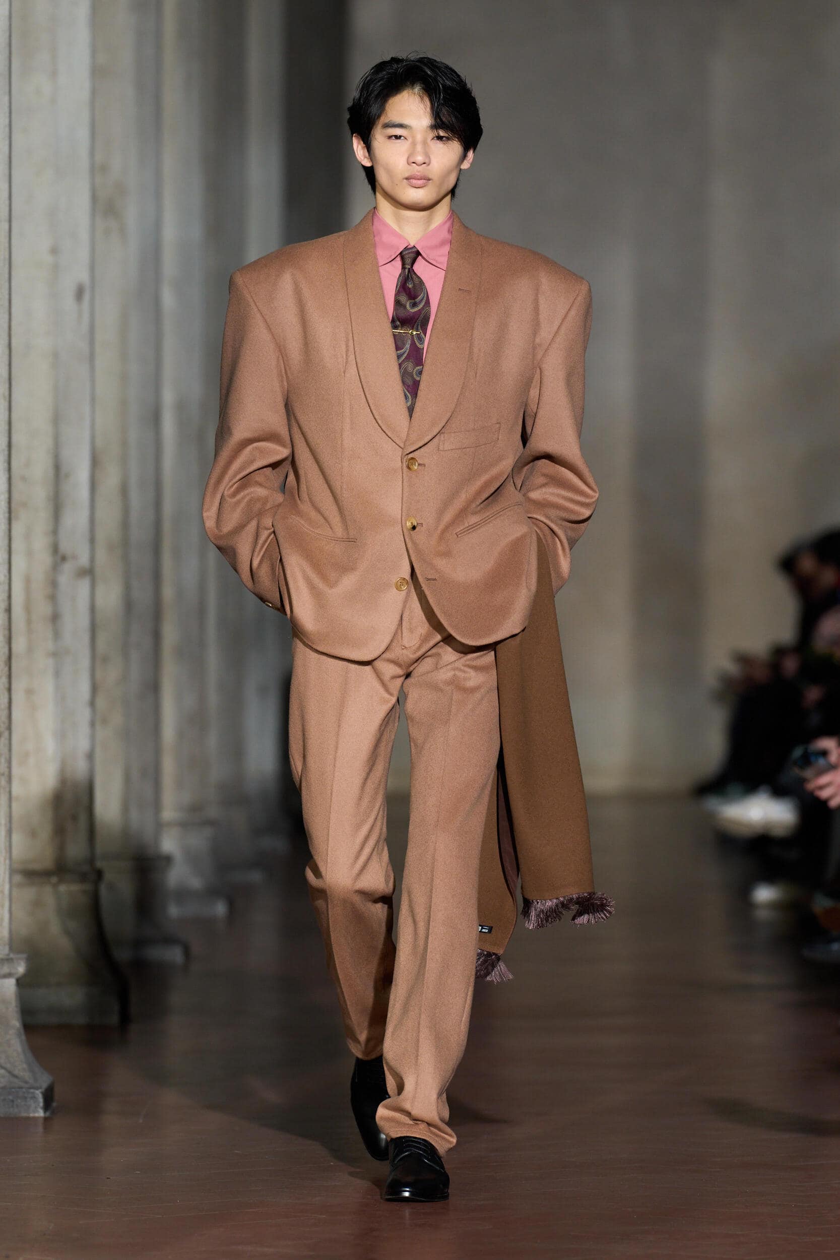 作为本届 Pitti Uomo 的受邀嘉宾,2025 年 LVMH 大奖得主大月壮士(Soshi Otsuki)在佛罗伦萨新圣母大殿的拱廊下,完成了其备受瞩目的同名品牌欧洲首秀。这场秀并未辜负全球的期待,他将标志性的慵懒剪裁带到了这个文艺复兴之城。大月壮士深受 Giorgio Armani 的影响,通过时装探讨了 80 与 90 年代日本经济鼎盛时期对「意大利制造」服装的痴迷。秀场弥漫着浓郁的怀旧气息,却又在解构与重组间,激发出一种令人振奋的现代性与新奇感。