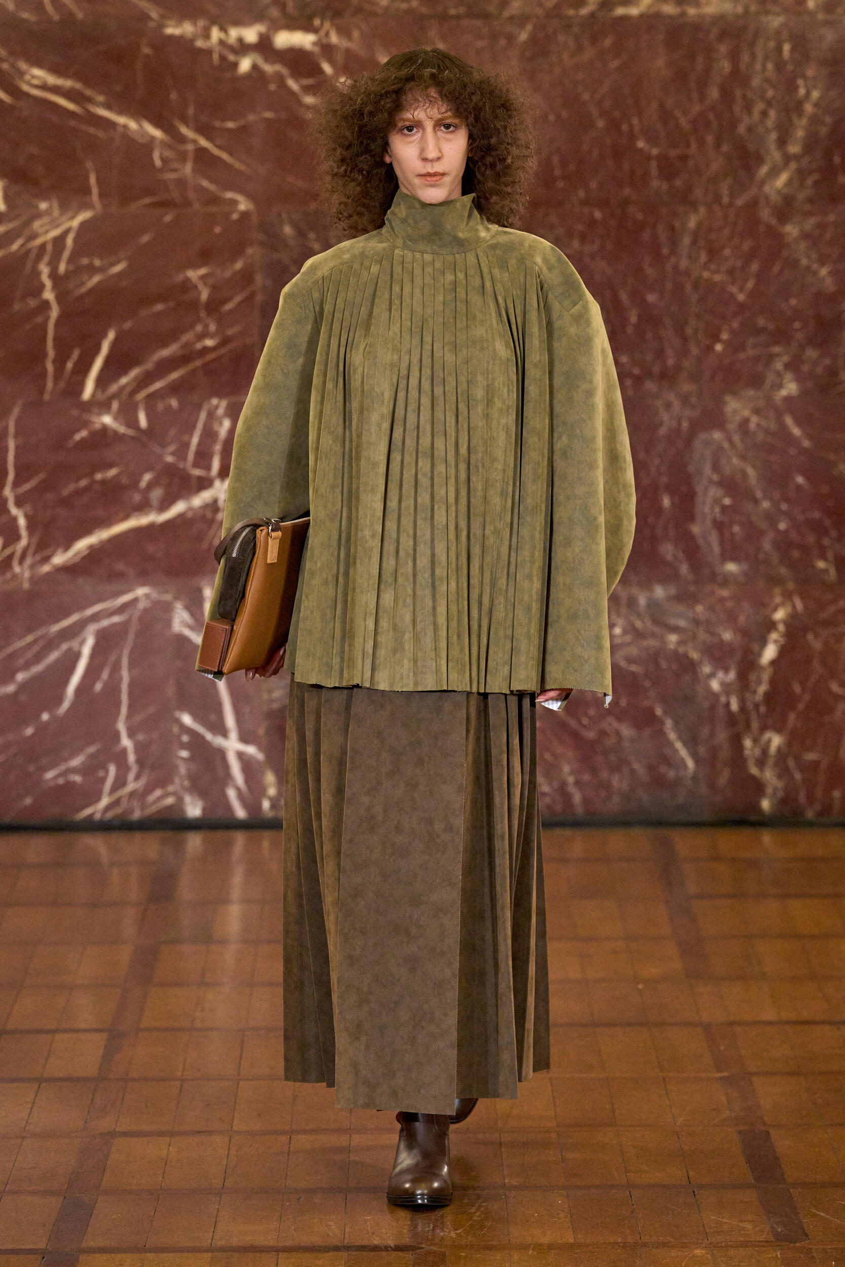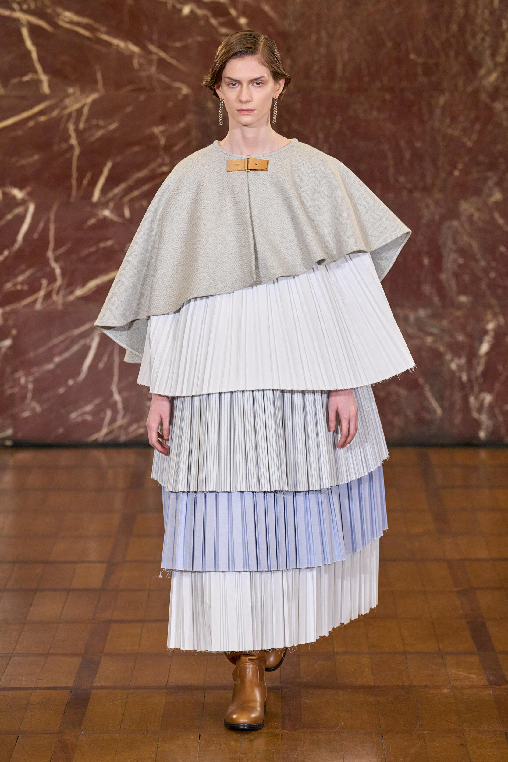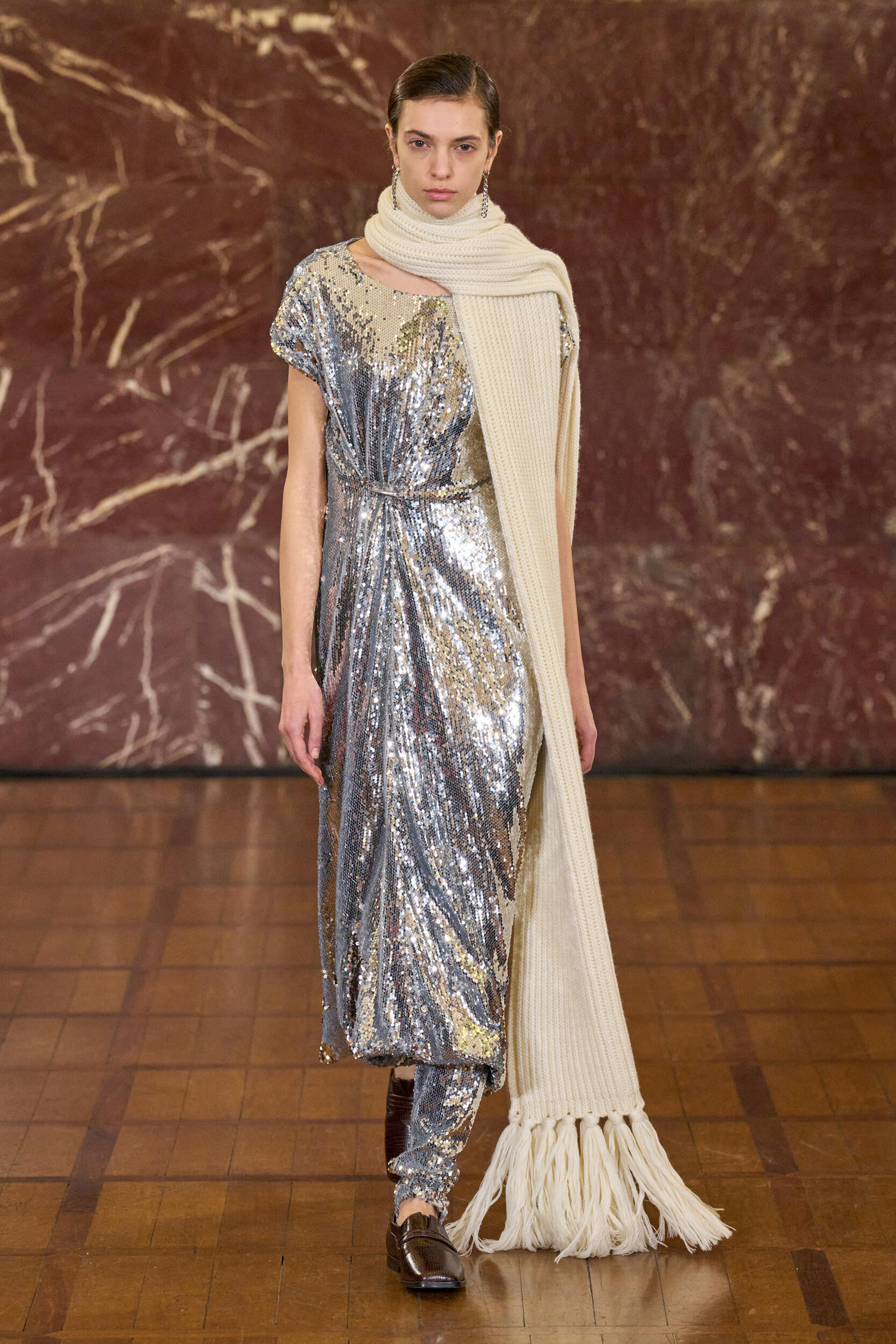 本季的面料运用展现了极强的视觉张力。传统苏格兰格纹与千鸟格在秀场穿梭,却转瞬与极具未来感的太空银箔、如装饰织物般的褶皱麂皮以及闪烁的银色亮片不期而遇。从压花丝绒挂脖裙到层叠的褶皱披风,再到极具分量感的马海毛毛衣,每件单品都在光影折射中扮演着独特角色。设计师巧妙地搭配了极其收紧的 Reebok 拳击运动鞋,与松弛的服装形成鲜明对比,如同指挥一场看似杂乱无章、实则和谐共鸣的材质交响乐。