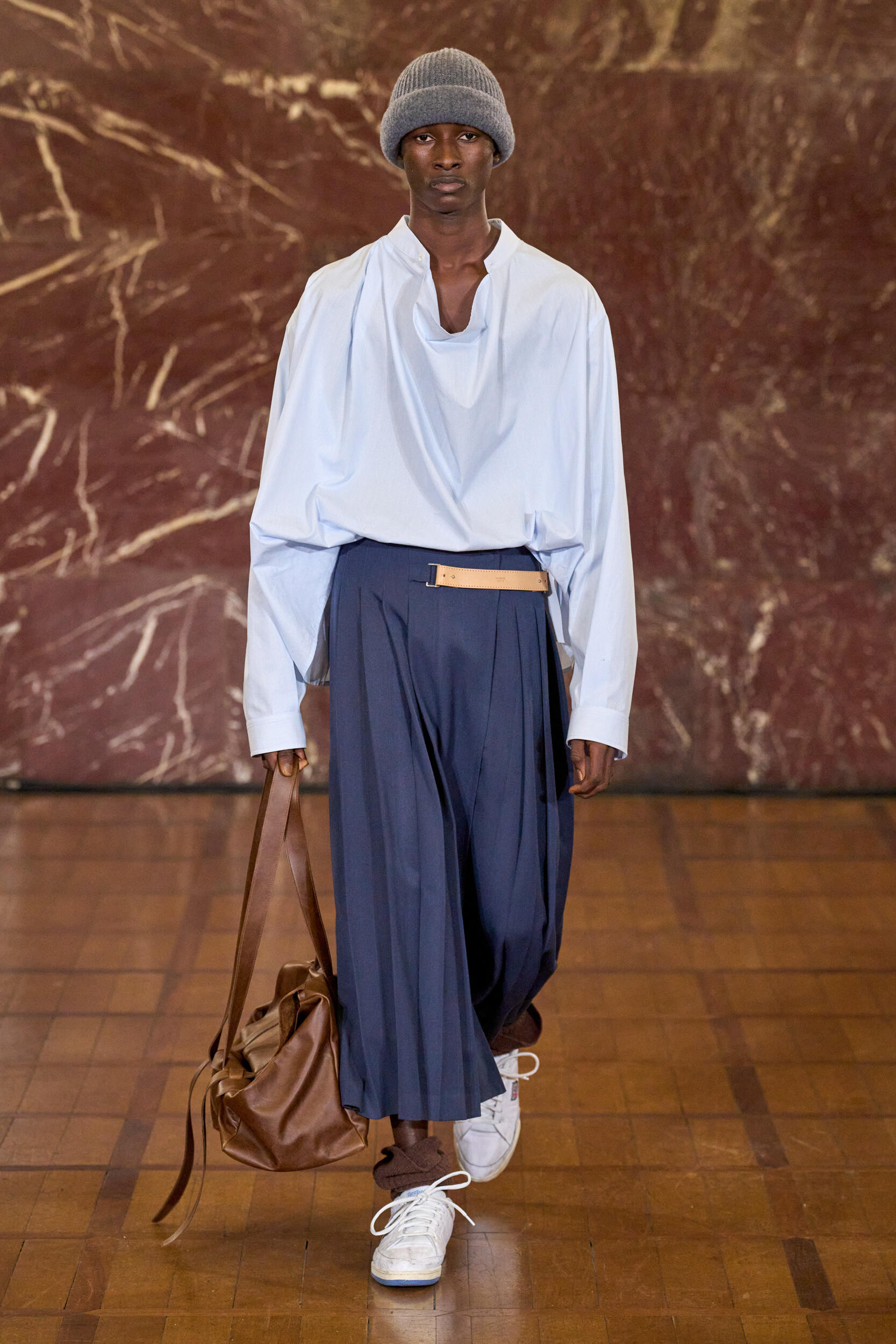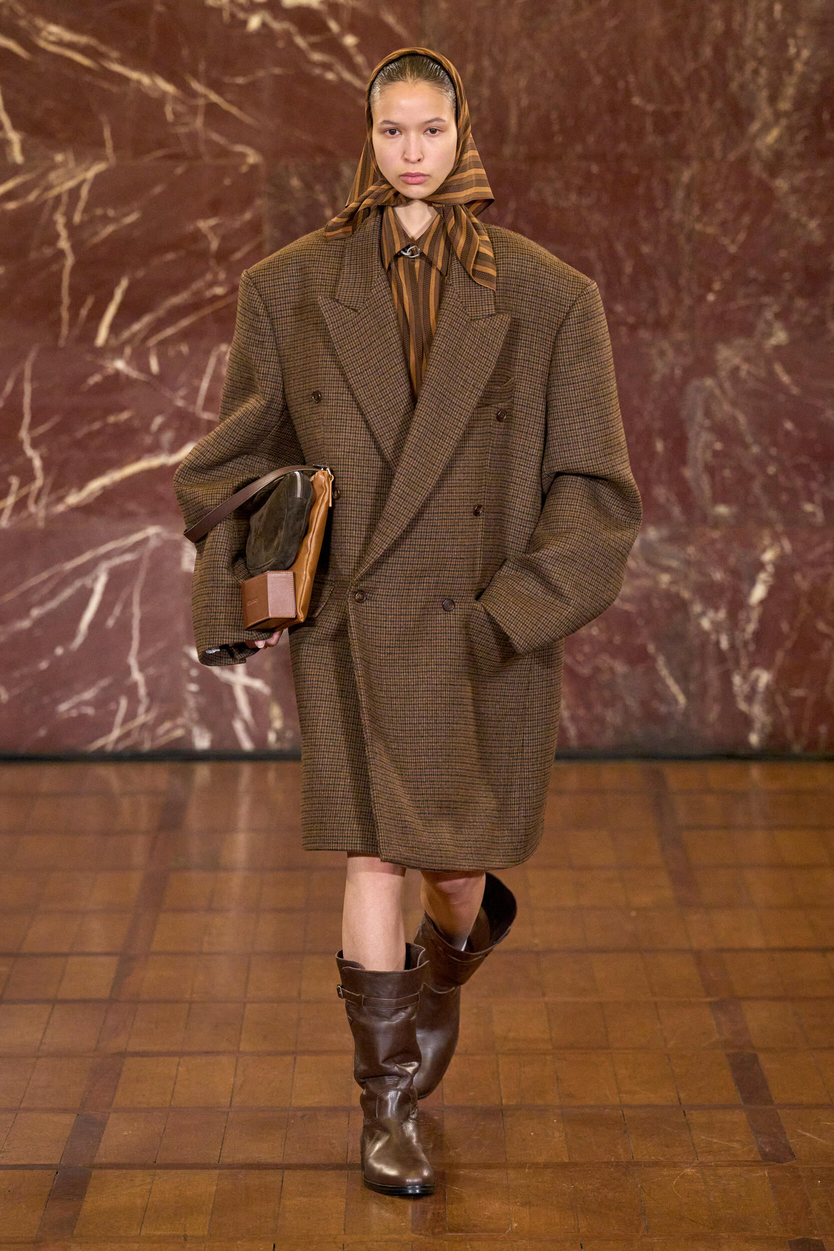 在佛罗伦萨 Pitti Uomo 首秀上,39 岁的巴黎设计师 Hed Mayner 对传统剪裁发起了挑战。当众人在追求西装极致的锋利感时,他却试图打破对身体的固有认知。他通过翻转袖管、前倾肩线,创造出如蚕茧般宽大且极具包裹感的廓形。这并非简单的服装堆砌,而是一场关于力量感的全新对话——不再盲从人体的自然线条,而是通过颠覆、夸张与扭曲,让时装在动态中呈现出照片难以捕捉的流动美学。