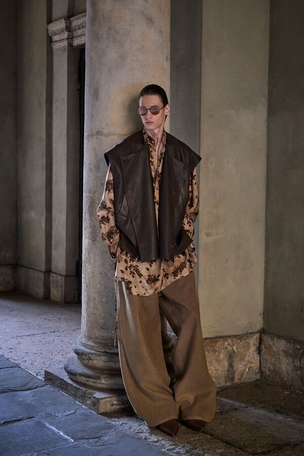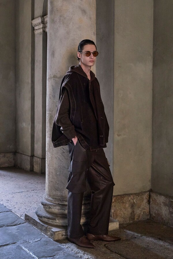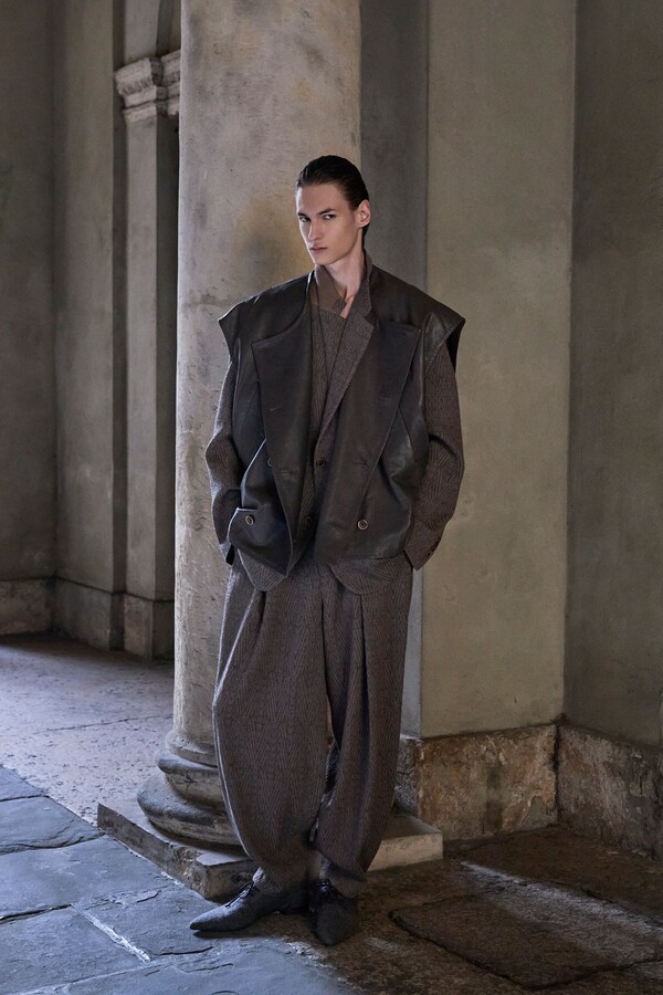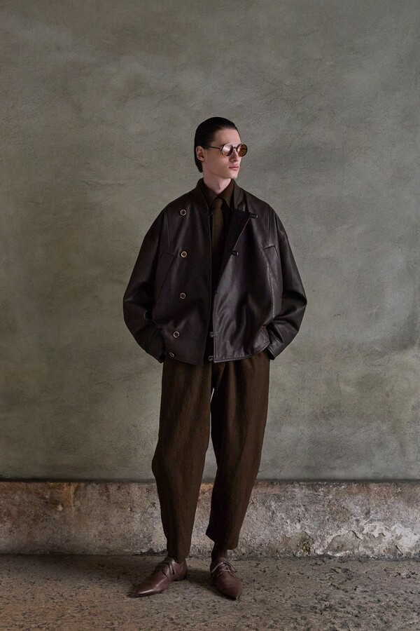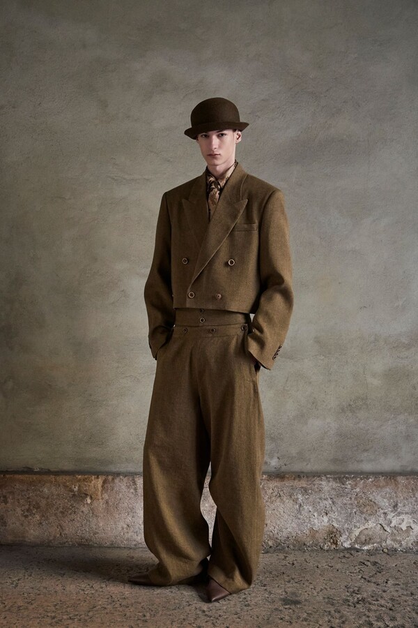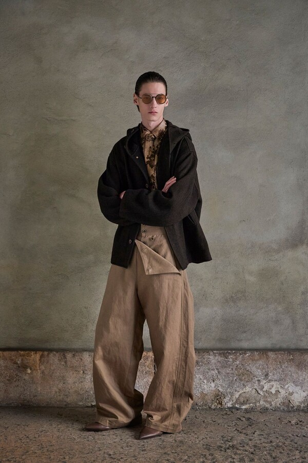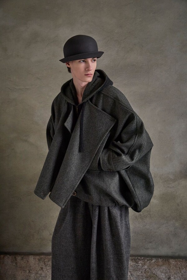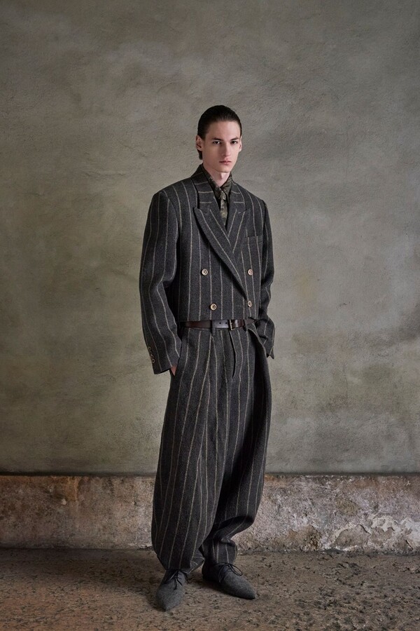 该系列在廓形和质感的运用上堪称精妙,它将双排扣西装的硬朗线条与水洗羊毛和羊绒混纺面料巧妙融合,赋予其柔和之美。比例上进行了大胆创新:夹克短款设计的长度远超臀部,搭配裤脚低至脚踝的长裤,营造出一种别具一格、近乎扭曲的廓形,挑战了传统男装的比例。做旧羊毛工装上的盘扣、衬衫上的不对称手工系结等东方元素的运用,都与结构感更强的单品形成了有趣的对比。