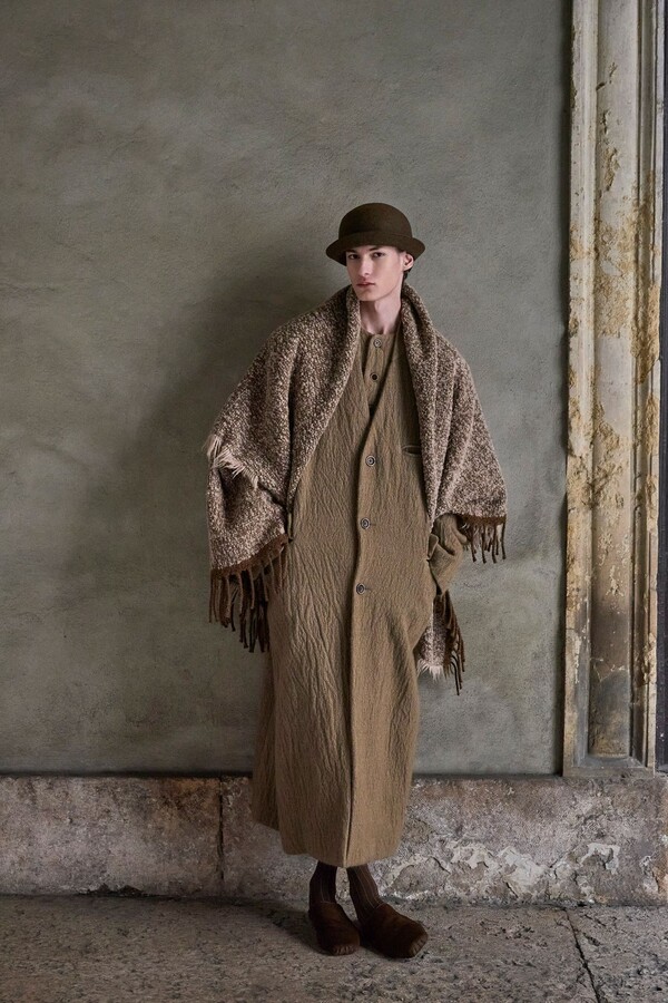 UMA WANG 2026 秋冬系列在米兰男装周上以型录的形式全新呈现。本季以上世纪 30 年代上海的活力与创意为灵感,游走于东西方之间。设计师运用了诸如粉笔条纹和双排扣等西方剪裁元素,并以饱经风霜、略带「褶皱」的东方韵味加以解构,将西方现代性与东方古典文化巧妙地融合在了一起。