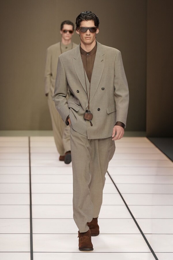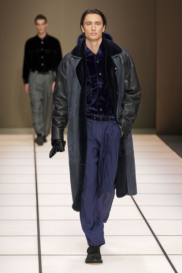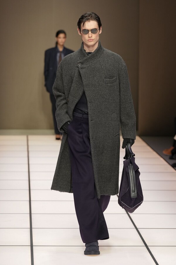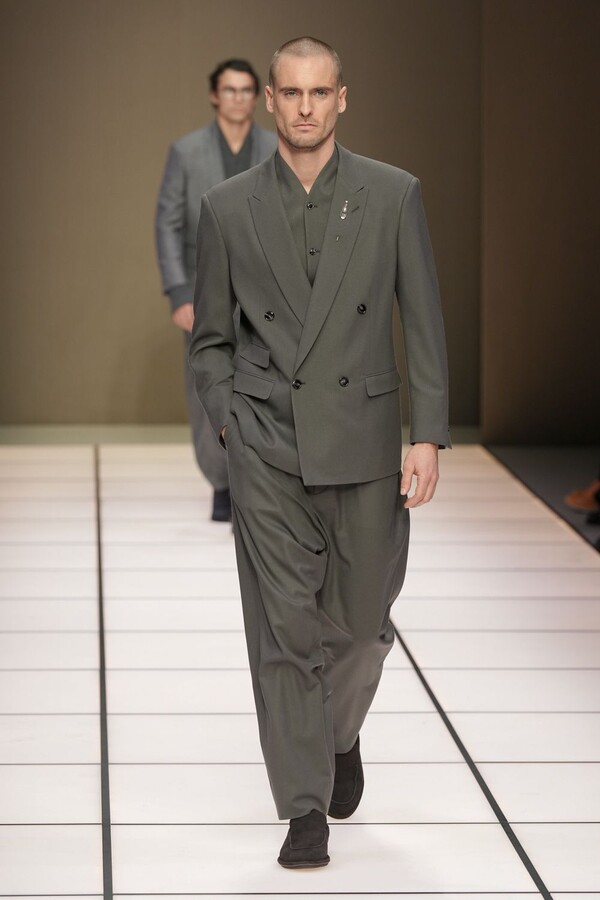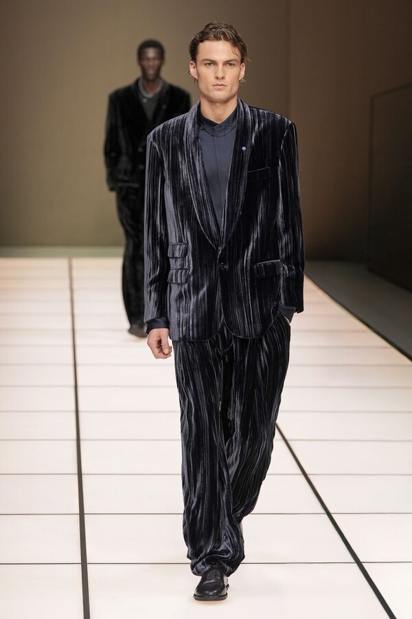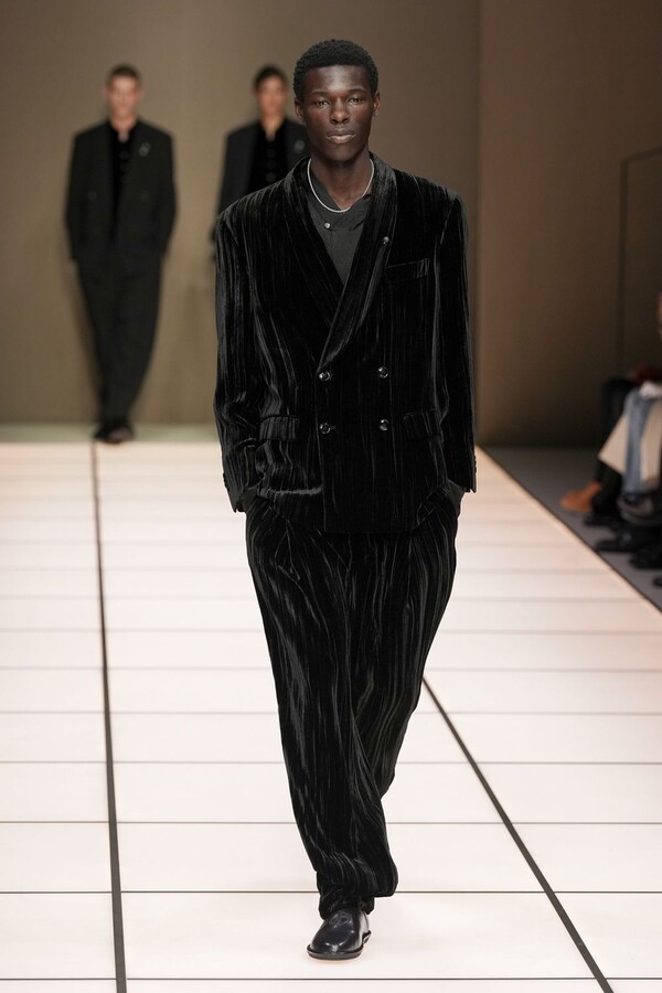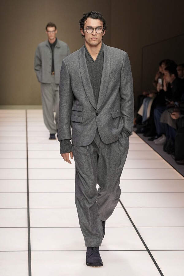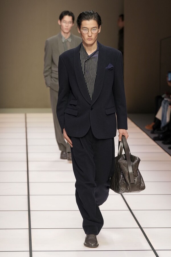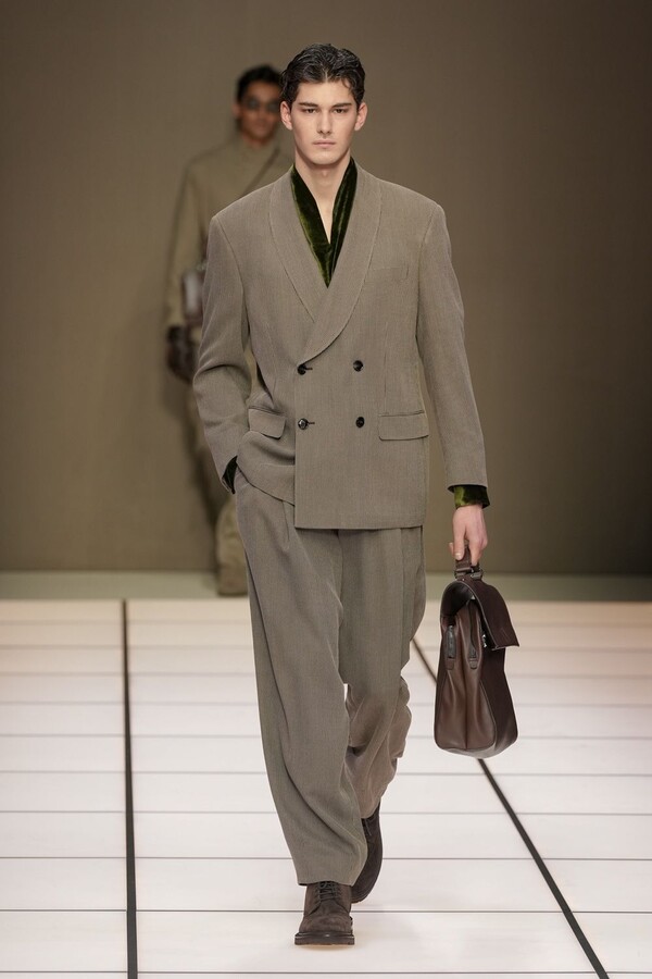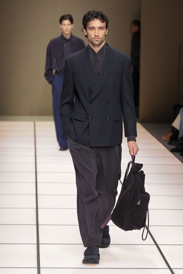 标志性的西装廓形大量出现在秀场上,从宽松版型到线条简洁精致的廓形,多种款式应有尽有。与此同时,双排扣西装外套、宽肩大衣与垂坠感十足的针织衫相得益彰。整季都贯穿着平衡的原则:哑光皮革、磨毛羊绒和柔软羊毛以对称的方式搭配出现,服装廓形本身也比例完美,剪裁精湛。最终呈现出的该系列既展现了 Armani 男装的经典视觉元素,又预示着品牌未来的发展方向,整体风格浑然一体。