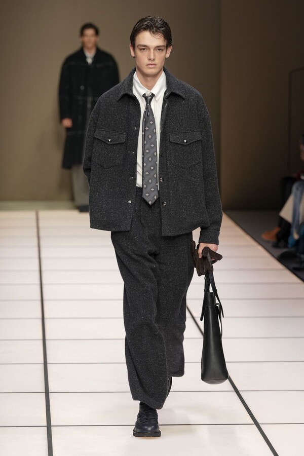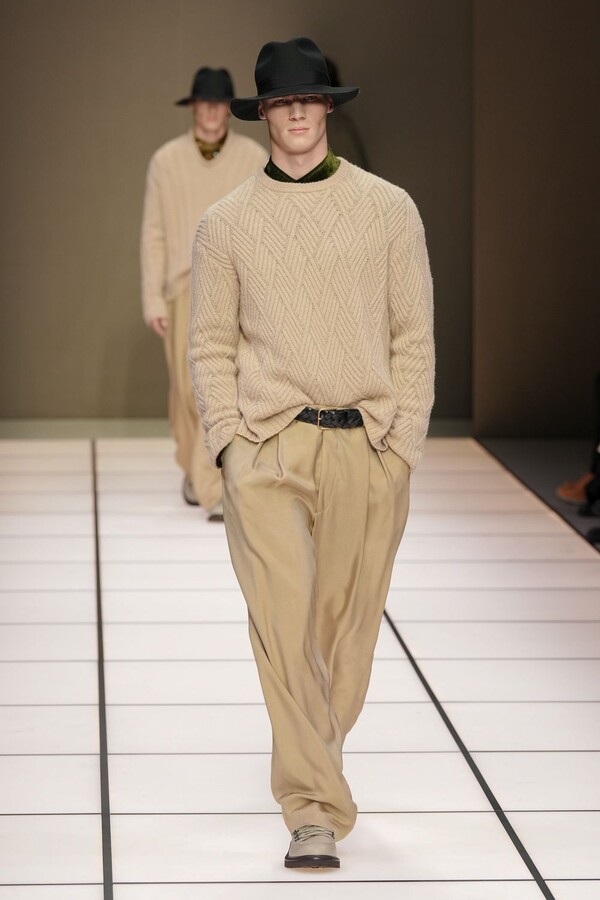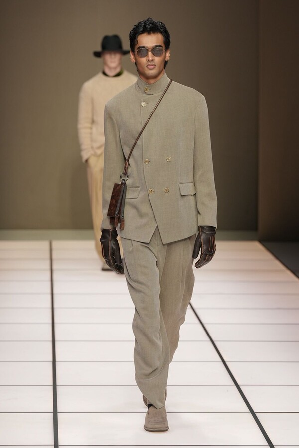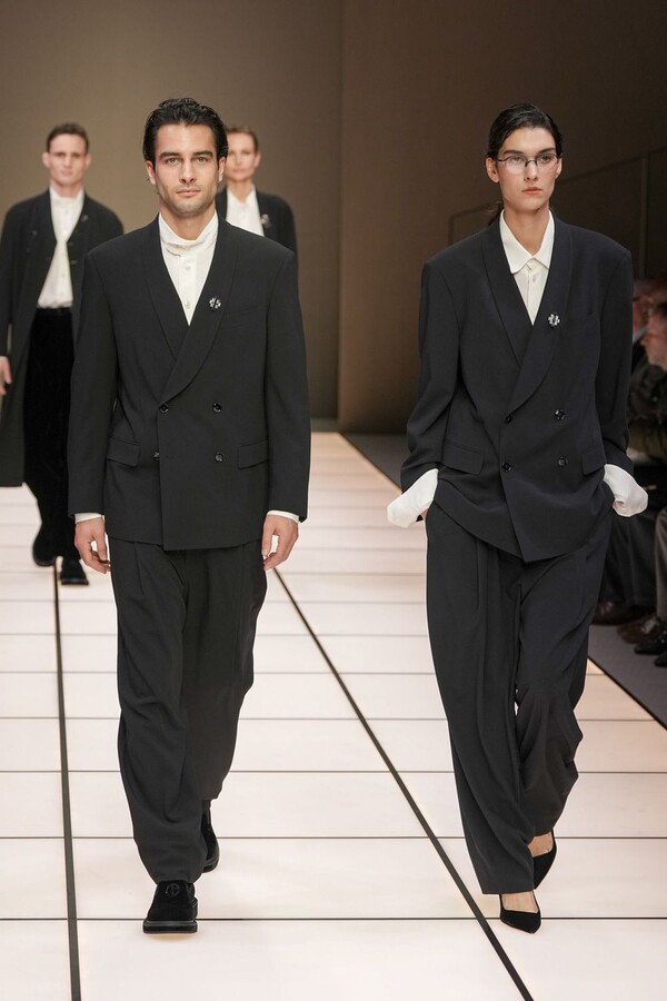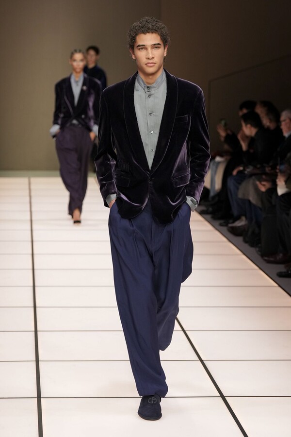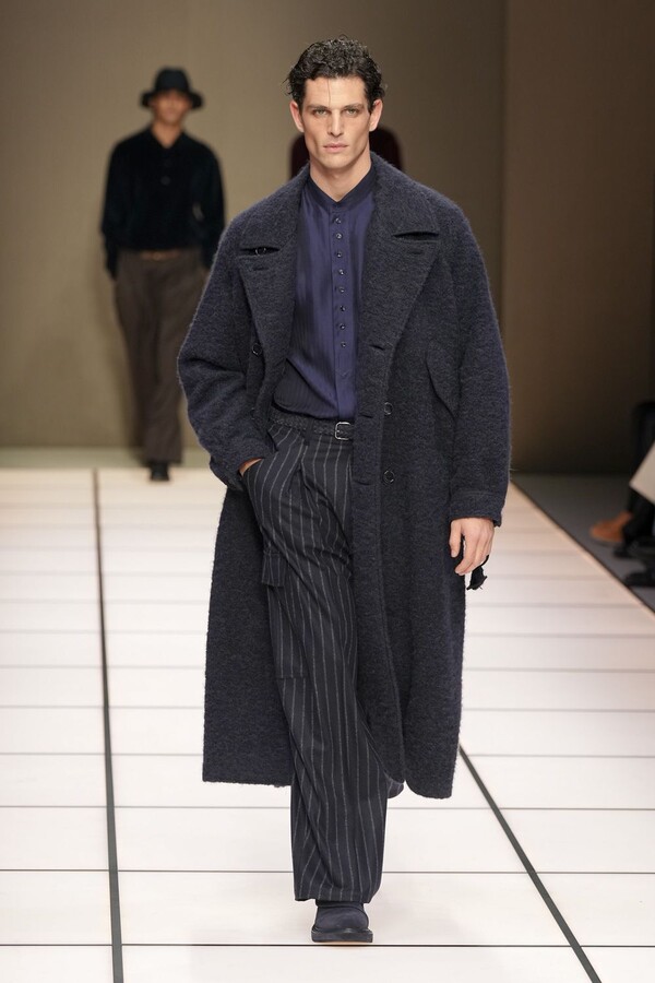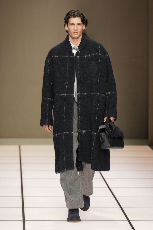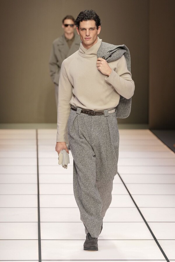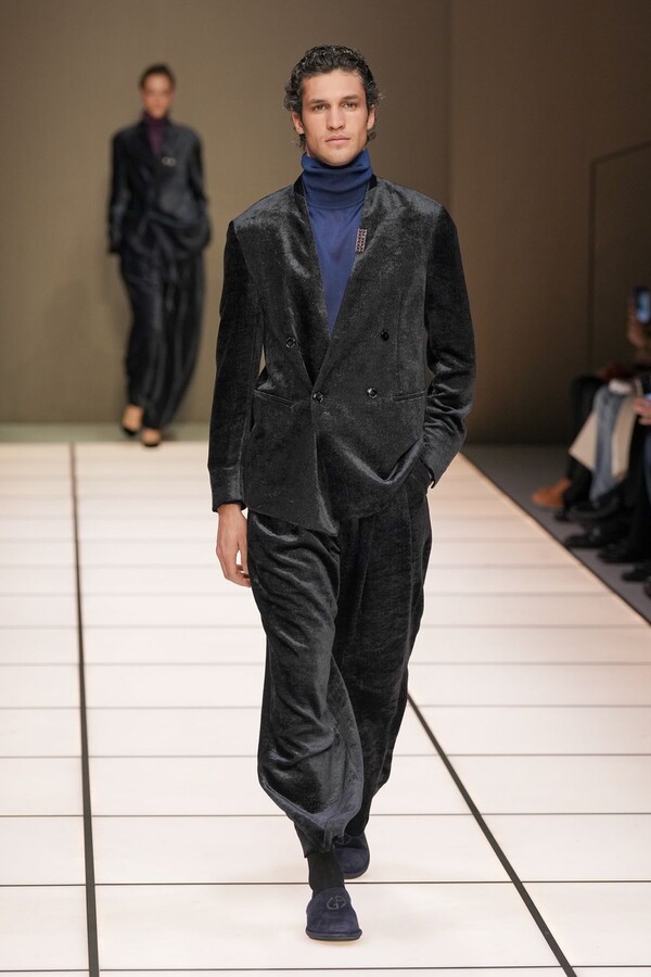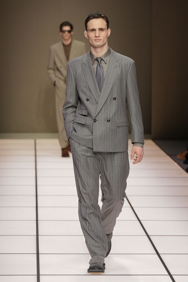 标志性的西装廓形大量出现在秀场上,从宽松版型到线条简洁精致的廓形,多种款式应有尽有。与此同时,双排扣西装外套、宽肩大衣与垂坠感十足的针织衫相得益彰。整季都贯穿着平衡的原则:哑光皮革、磨毛羊绒和柔软羊毛以对称的方式搭配出现,服装廓形本身也比例完美,剪裁精湛。最终呈现出的该系列既展现了 Armani 男装的经典视觉元素,又预示着品牌未来的发展方向,整体风格浑然一体。