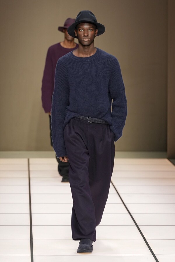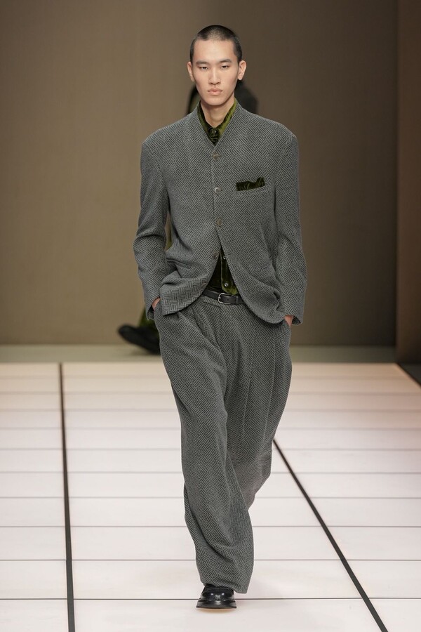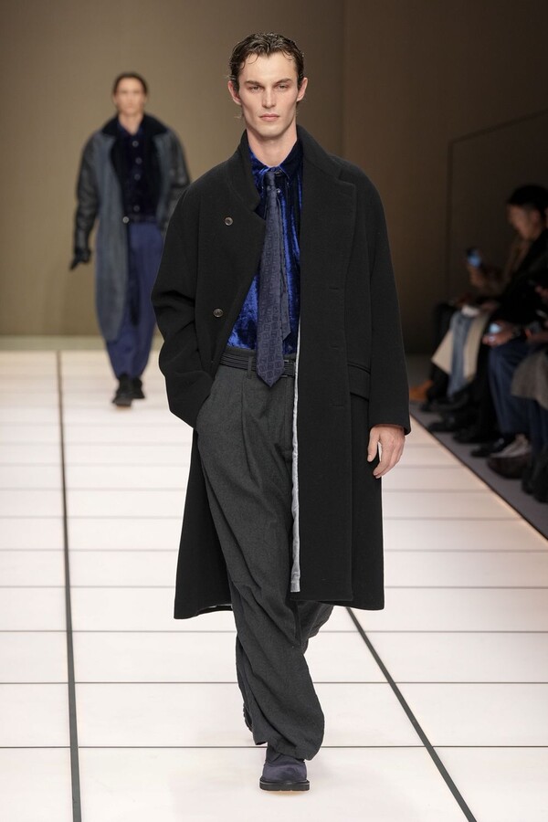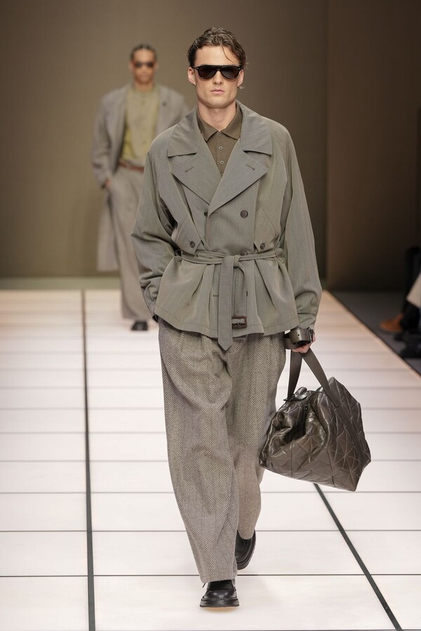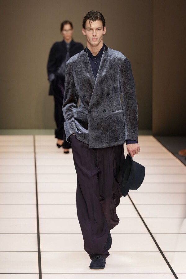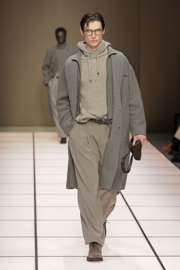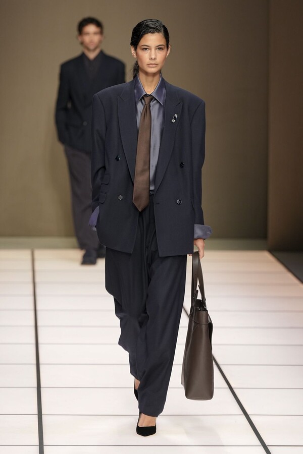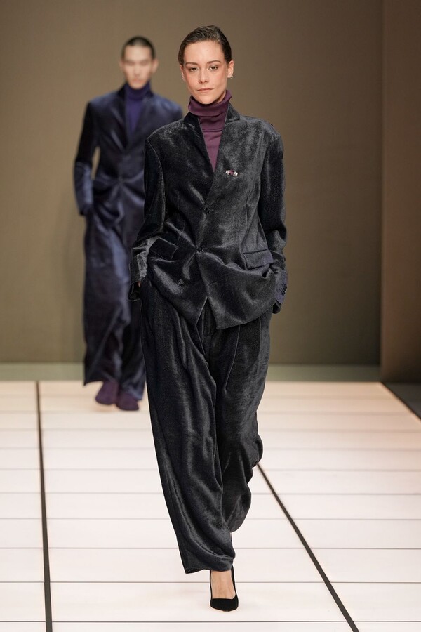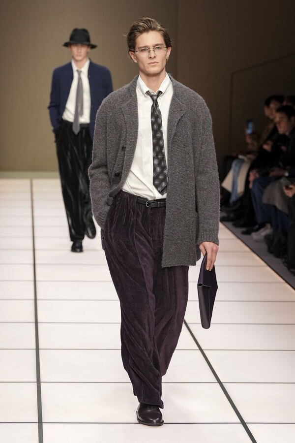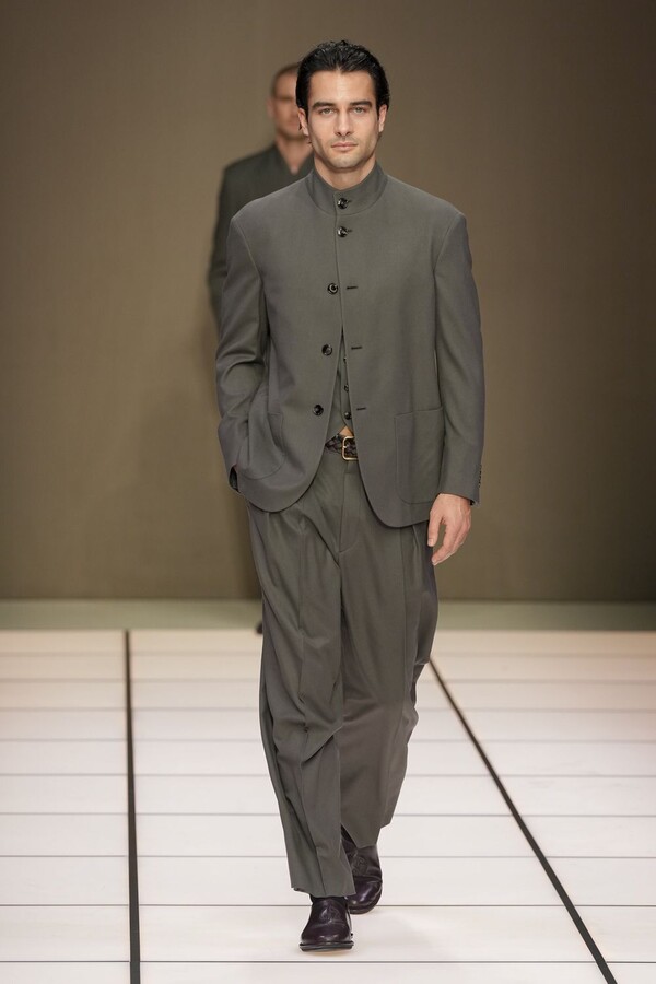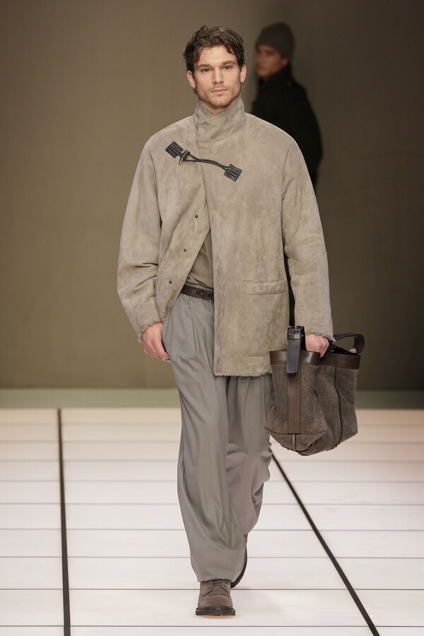 标志性的西装廓形大量出现在秀场上,从宽松版型到线条简洁精致的廓形,多种款式应有尽有。与此同时,双排扣西装外套、宽肩大衣与垂坠感十足的针织衫相得益彰。整季都贯穿着平衡的原则:哑光皮革、磨毛羊绒和柔软羊毛以对称的方式搭配出现,服装廓形本身也比例完美,剪裁精湛。最终呈现出的该系列既展现了 Armani 男装的经典视觉元素,又预示着品牌未来的发展方向,整体风格浑然一体。