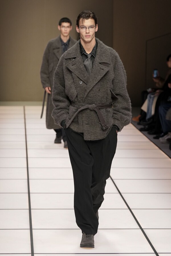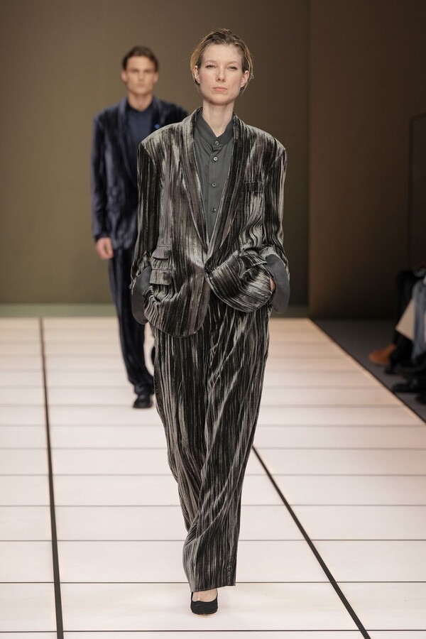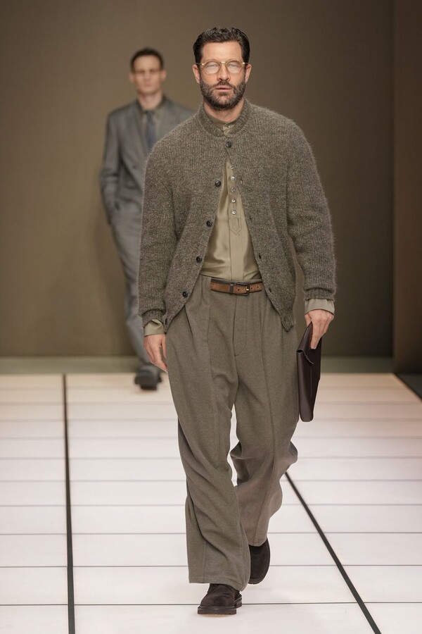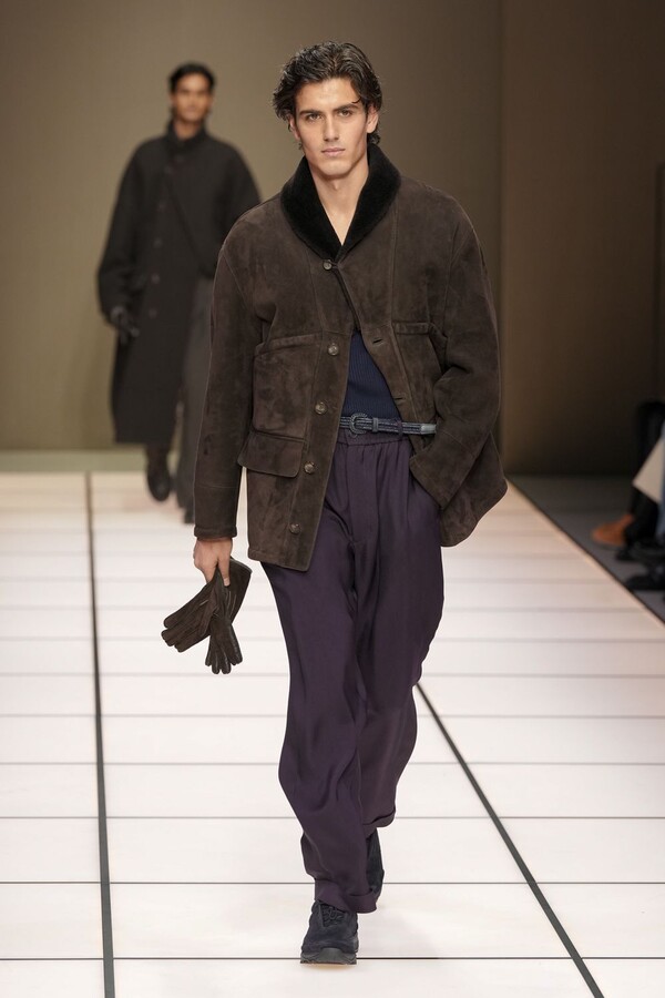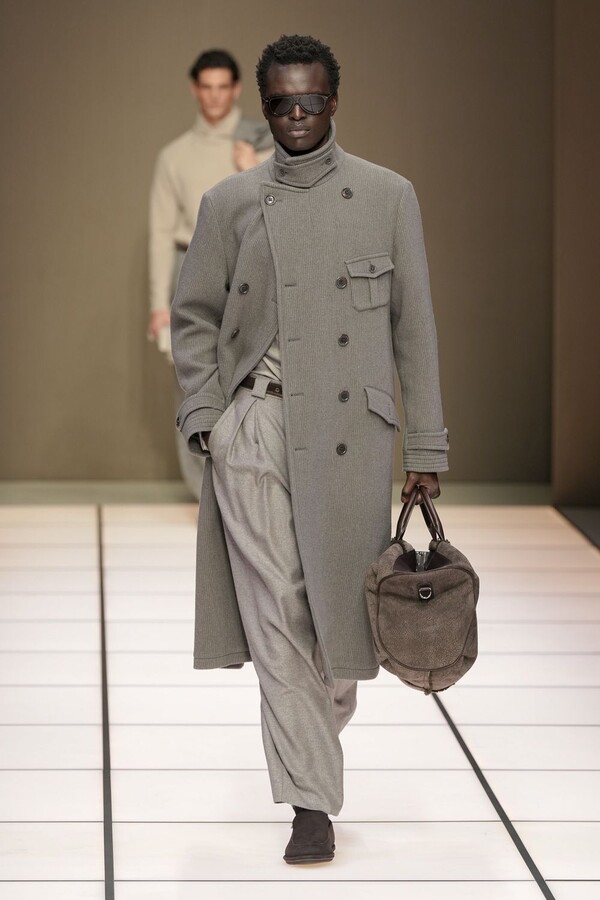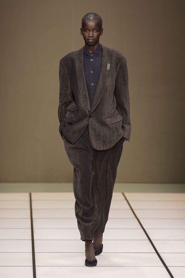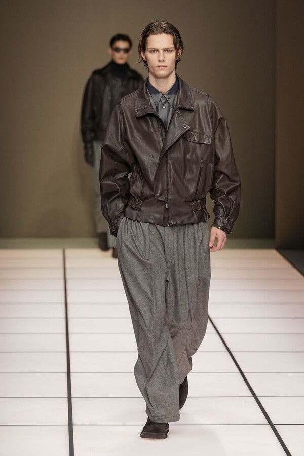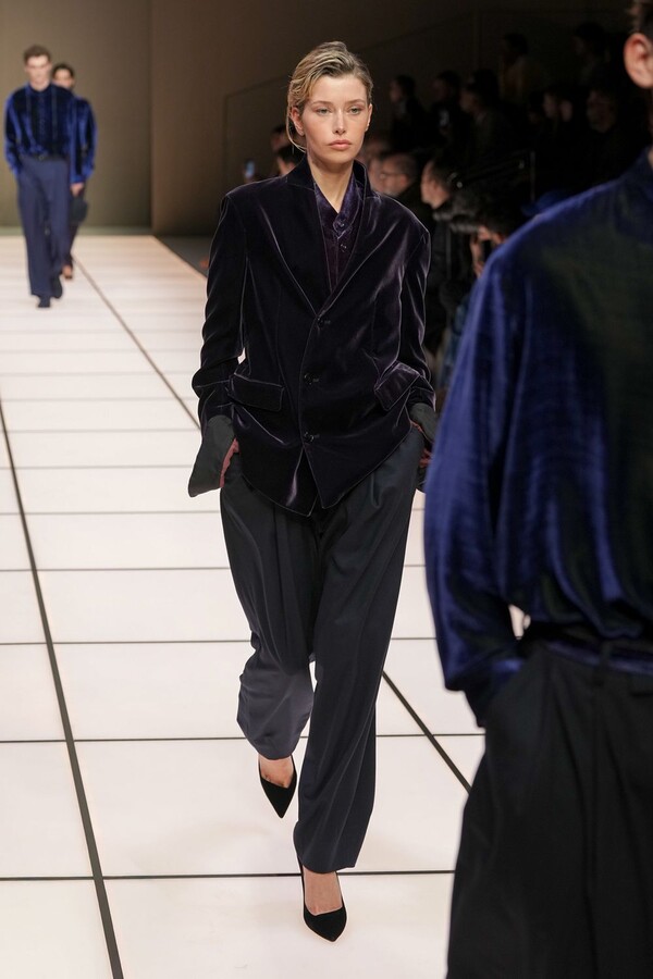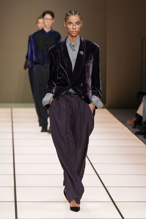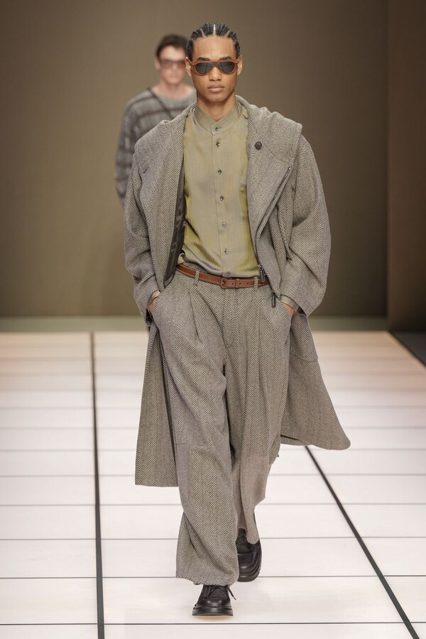 标志性的西装廓形大量出现在秀场上,从宽松版型到线条简洁精致的廓形,多种款式应有尽有。与此同时,双排扣西装外套、宽肩大衣与垂坠感十足的针织衫相得益彰。整季都贯穿着平衡的原则:哑光皮革、磨毛羊绒和柔软羊毛以对称的方式搭配出现,服装廓形本身也比例完美,剪裁精湛。最终呈现出的该系列既展现了 Armani 男装的经典视觉元素,又预示着品牌未来的发展方向,整体风格浑然一体。