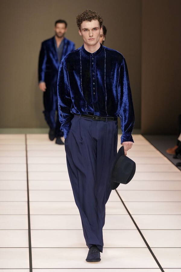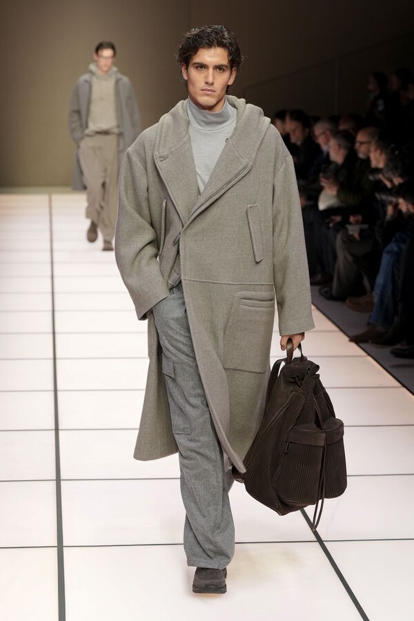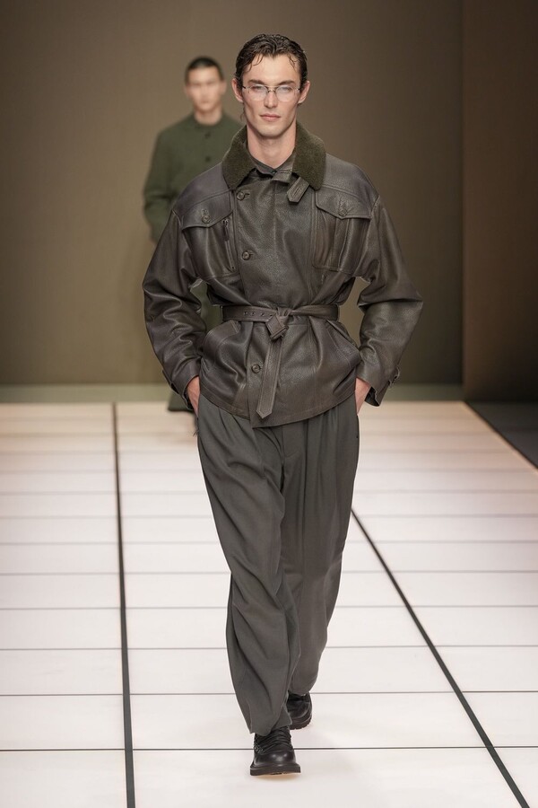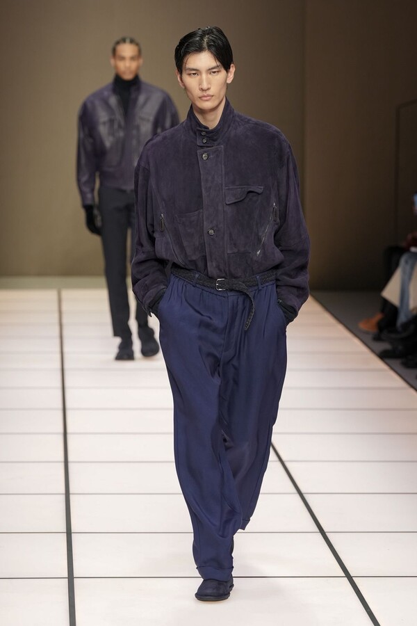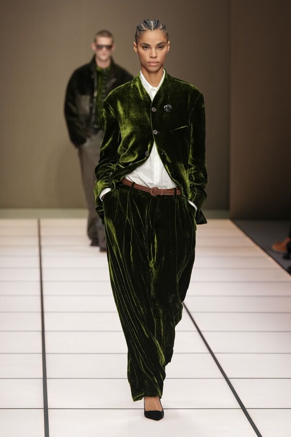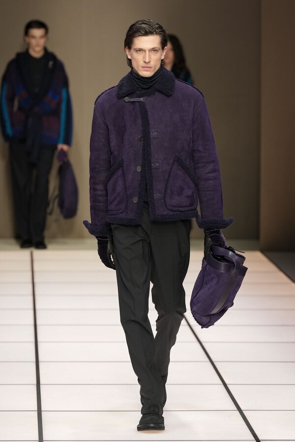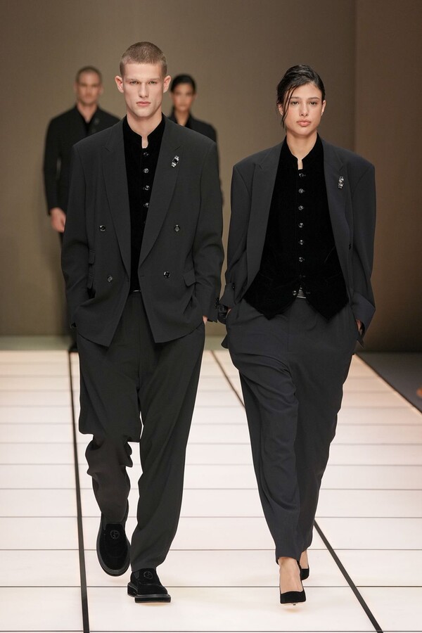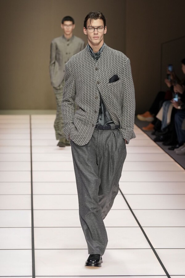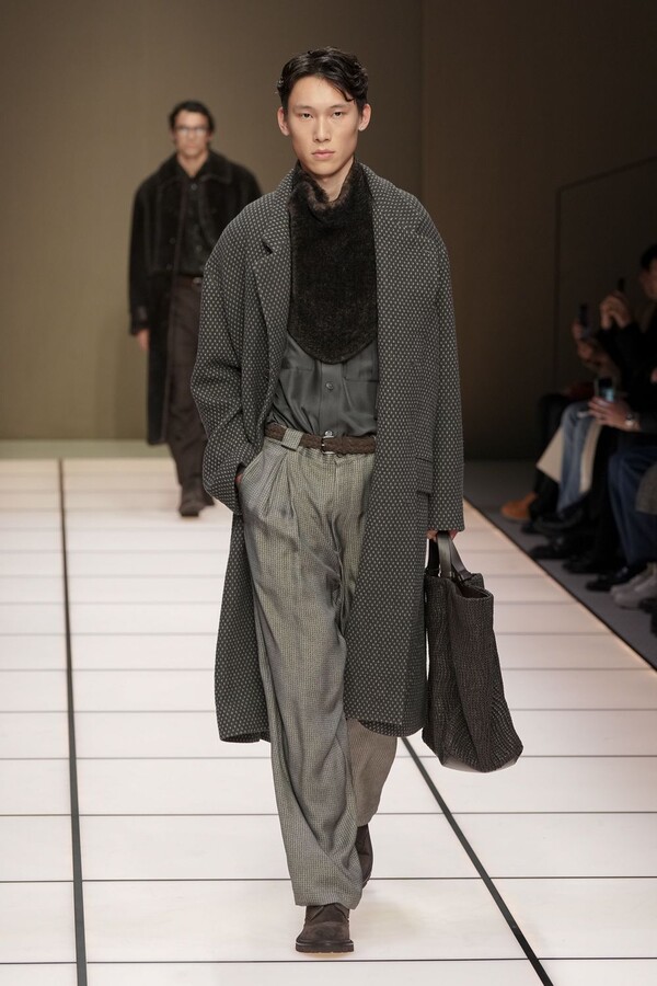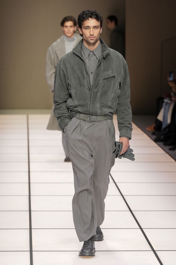 标志性的西装廓形大量出现在秀场上,从宽松版型到线条简洁精致的廓形,多种款式应有尽有。与此同时,双排扣西装外套、宽肩大衣与垂坠感十足的针织衫相得益彰。整季都贯穿着平衡的原则:哑光皮革、磨毛羊绒和柔软羊毛以对称的方式搭配出现,服装廓形本身也比例完美,剪裁精湛。最终呈现出的该系列既展现了 Armani 男装的经典视觉元素,又预示着品牌未来的发展方向,整体风格浑然一体。