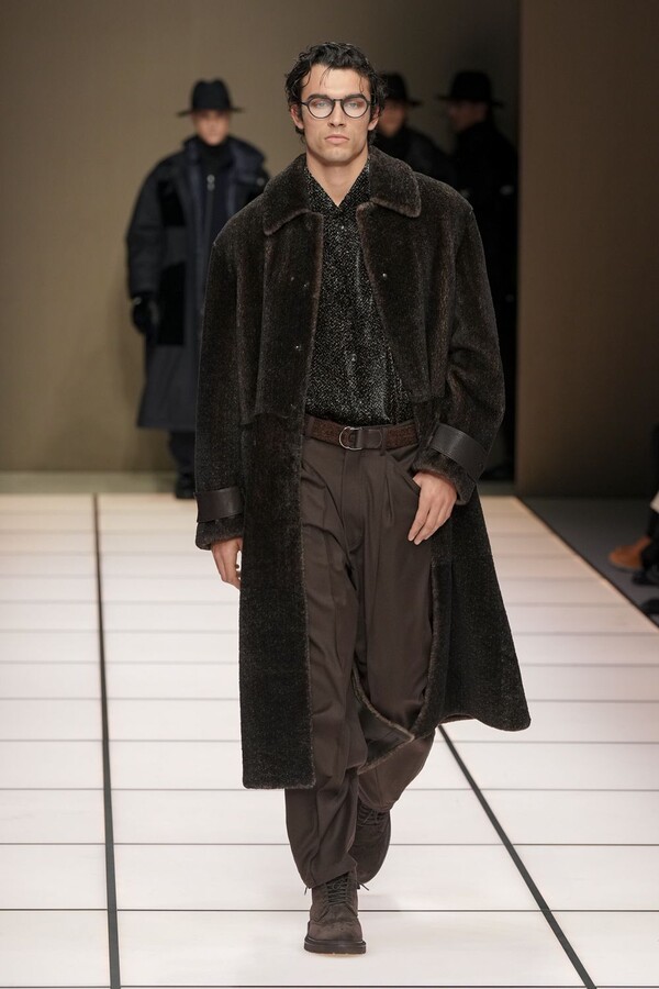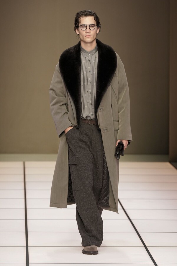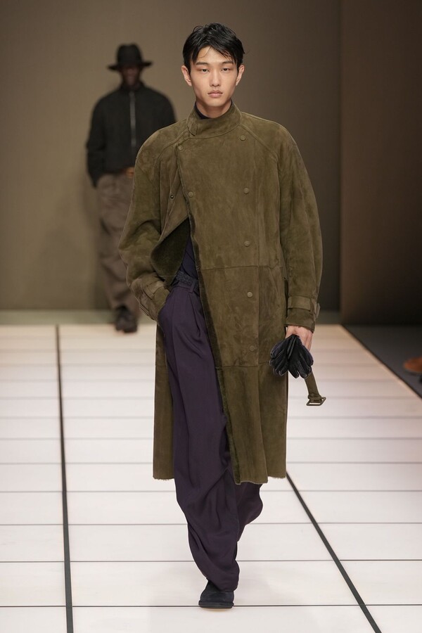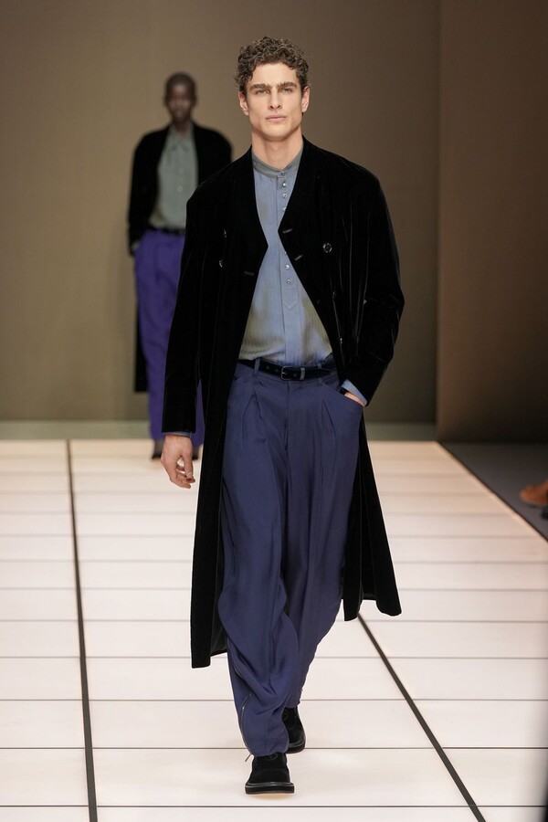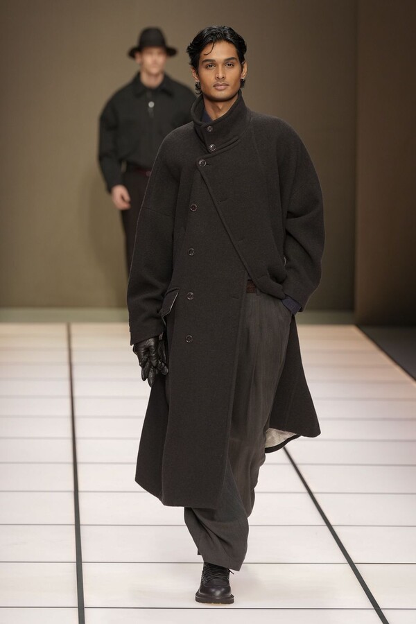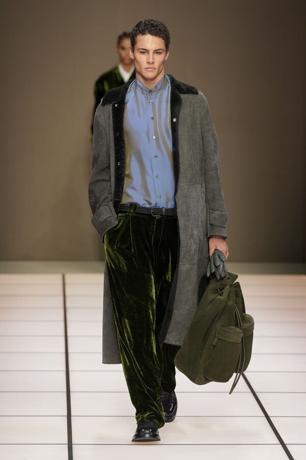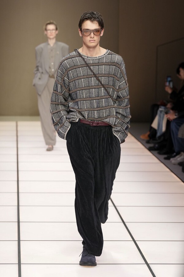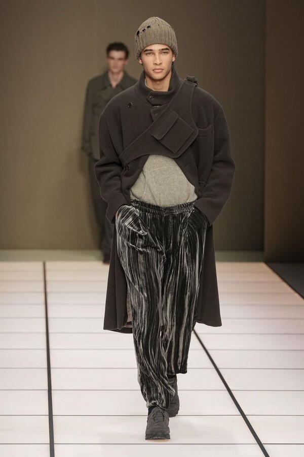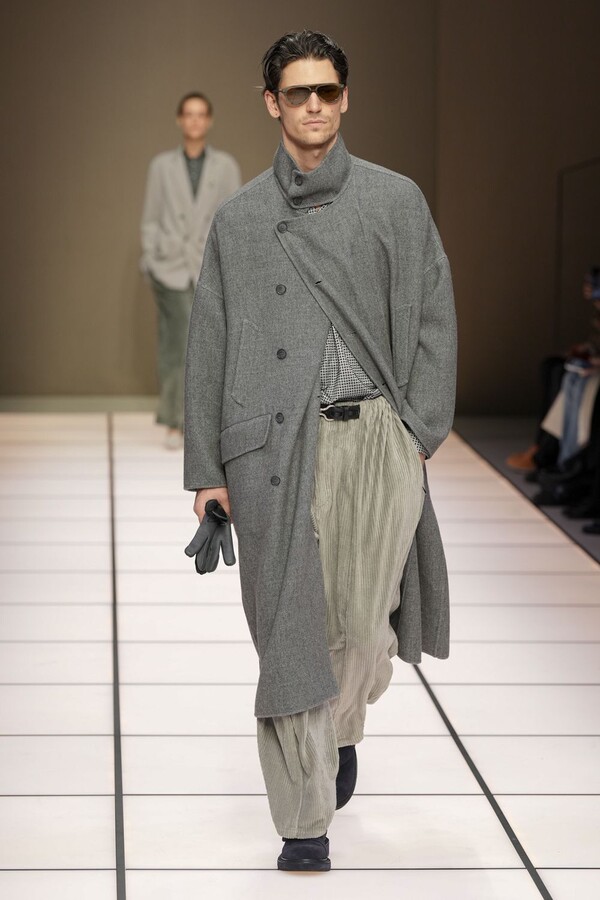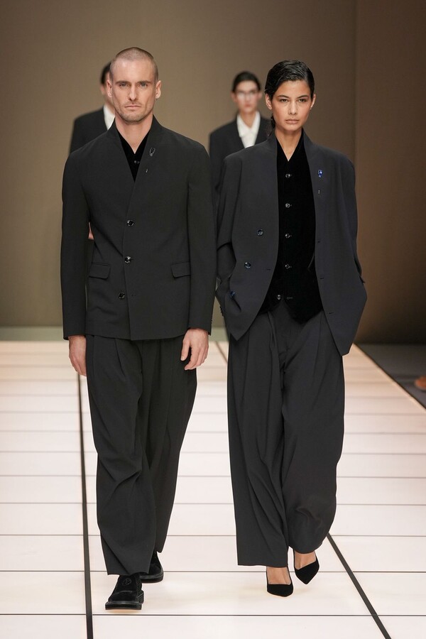 标志性的西装廓形大量出现在秀场上,从宽松版型到线条简洁精致的廓形,多种款式应有尽有。与此同时,双排扣西装外套、宽肩大衣与垂坠感十足的针织衫相得益彰。整季都贯穿着平衡的原则:哑光皮革、磨毛羊绒和柔软羊毛以对称的方式搭配出现,服装廓形本身也比例完美,剪裁精湛。最终呈现出的该系列既展现了 Armani 男装的经典视觉元素,又预示着品牌未来的发展方向,整体风格浑然一体。