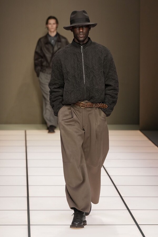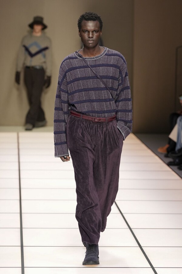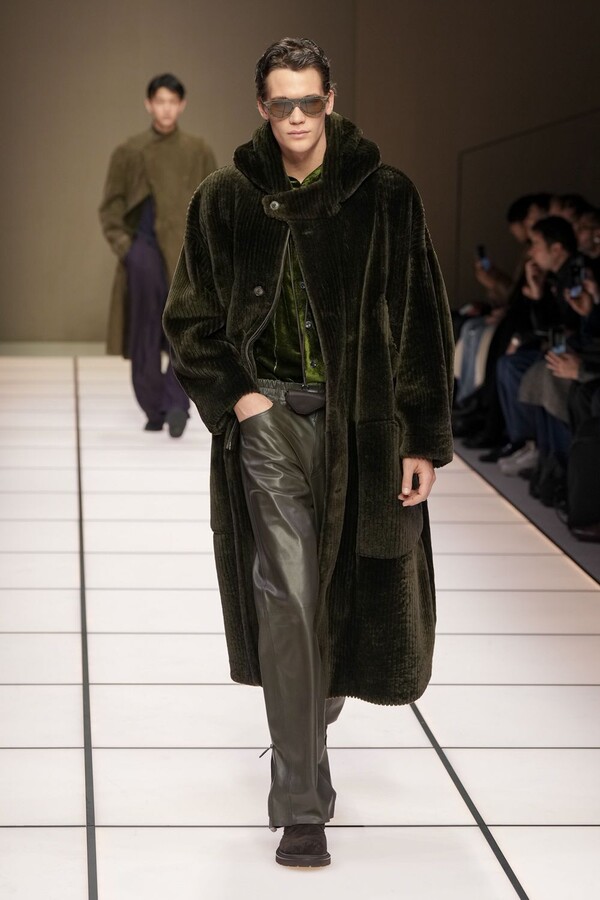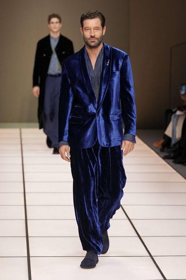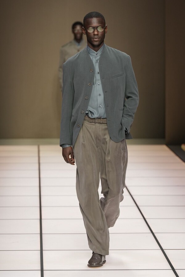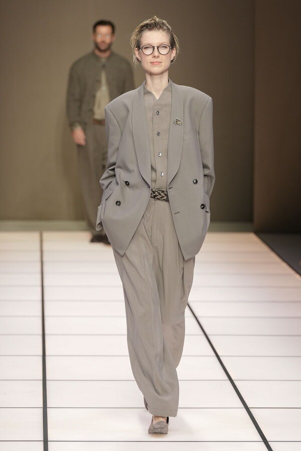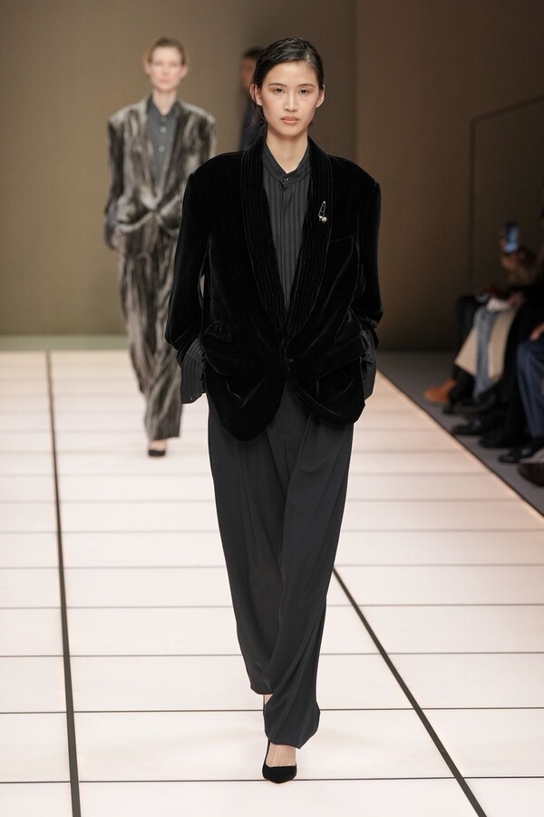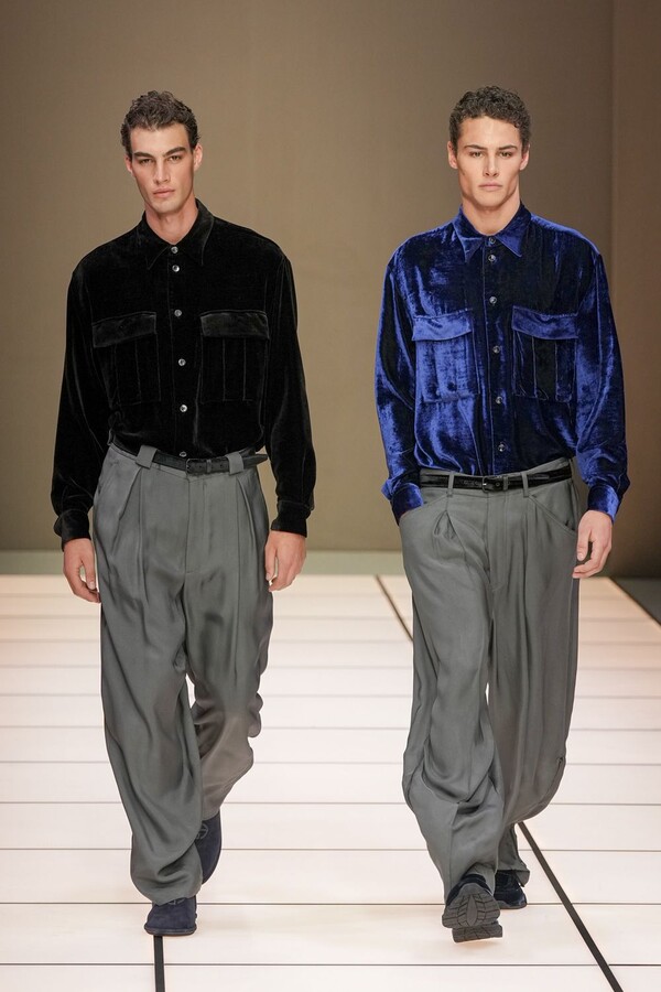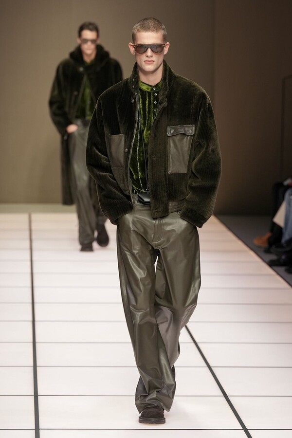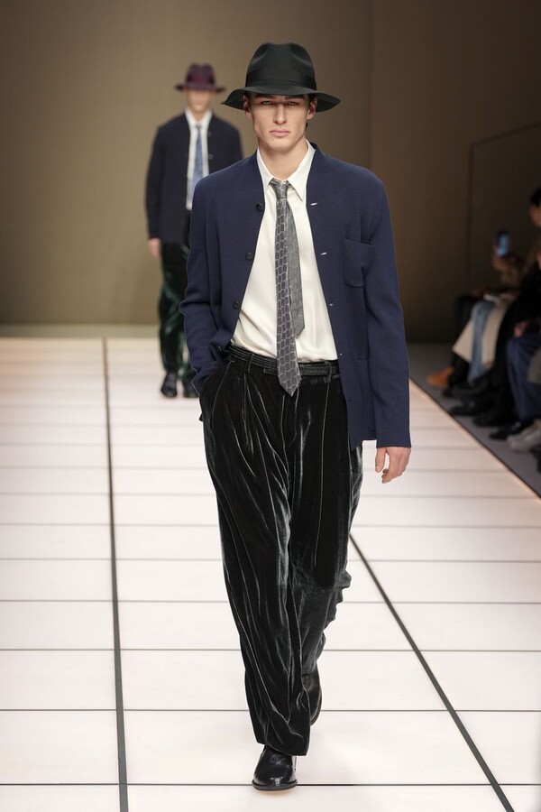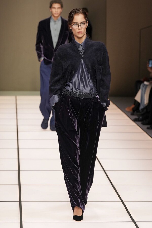 标志性的西装廓形大量出现在秀场上,从宽松版型到线条简洁精致的廓形,多种款式应有尽有。与此同时,双排扣西装外套、宽肩大衣与垂坠感十足的针织衫相得益彰。整季都贯穿着平衡的原则:哑光皮革、磨毛羊绒和柔软羊毛以对称的方式搭配出现,服装廓形本身也比例完美,剪裁精湛。最终呈现出的该系列既展现了 Armani 男装的经典视觉元素,又预示着品牌未来的发展方向,整体风格浑然一体。