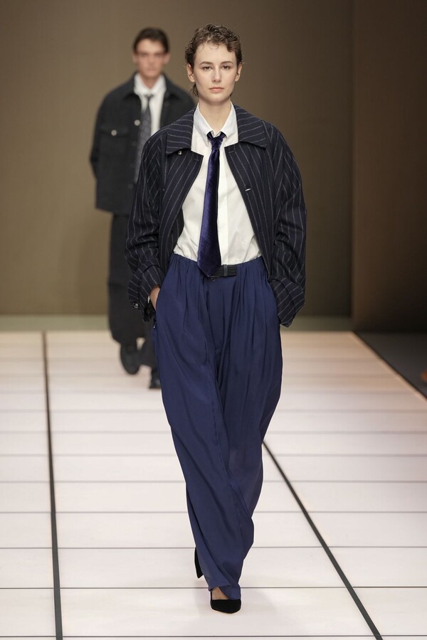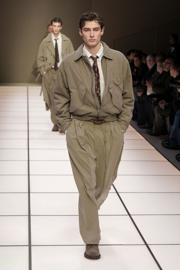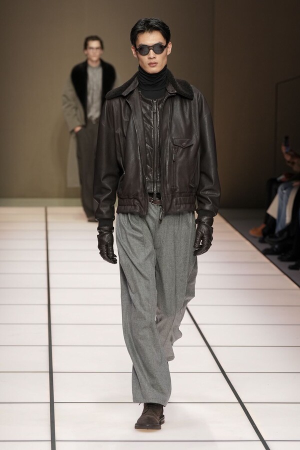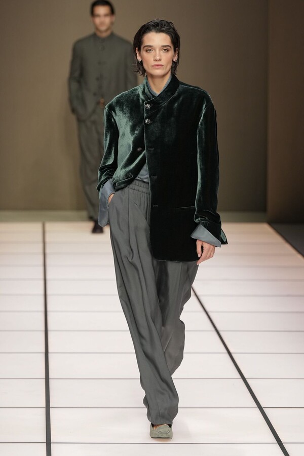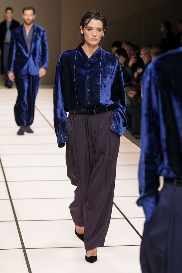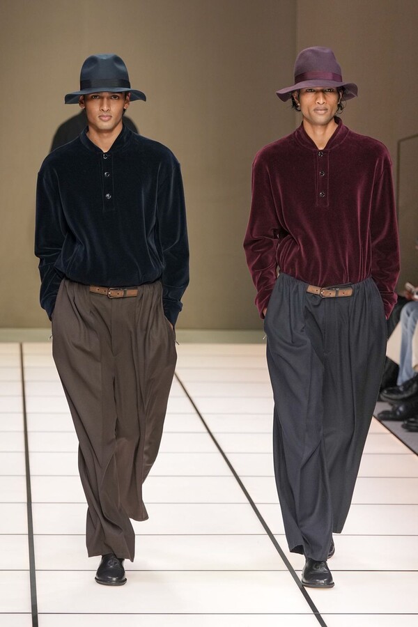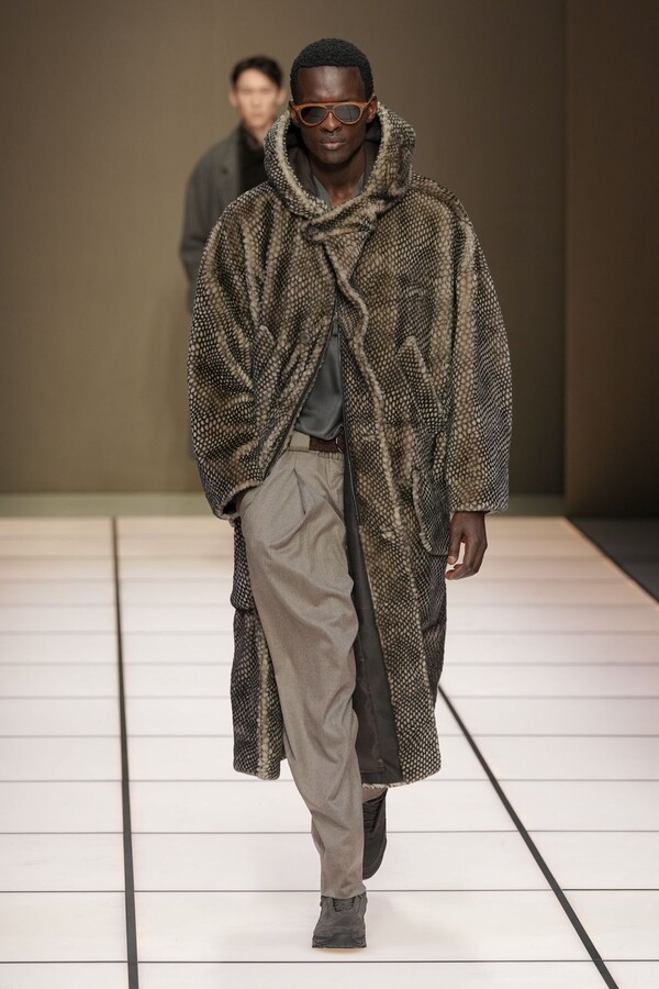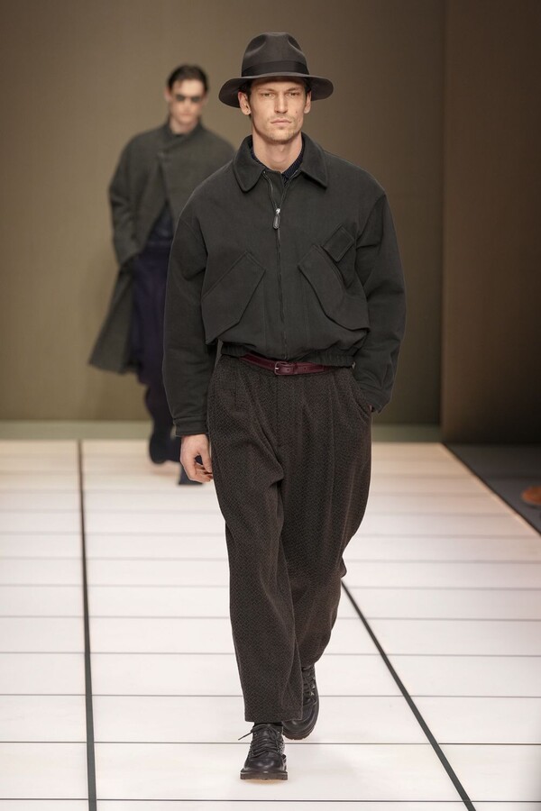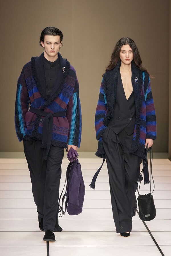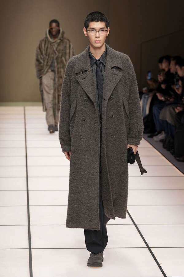 标志性的西装廓形大量出现在秀场上,从宽松版型到线条简洁精致的廓形,多种款式应有尽有。与此同时,双排扣西装外套、宽肩大衣与垂坠感十足的针织衫相得益彰。整季都贯穿着平衡的原则:哑光皮革、磨毛羊绒和柔软羊毛以对称的方式搭配出现,服装廓形本身也比例完美,剪裁精湛。最终呈现出的该系列既展现了 Armani 男装的经典视觉元素,又预示着品牌未来的发展方向,整体风格浑然一体。