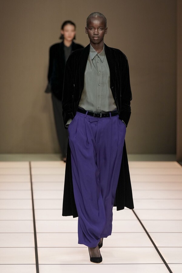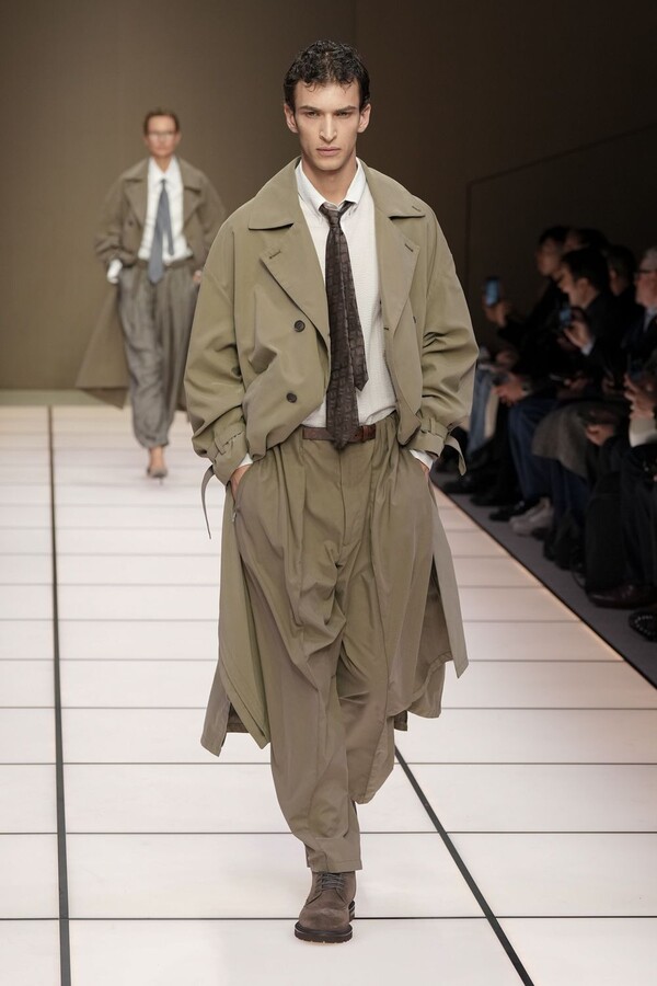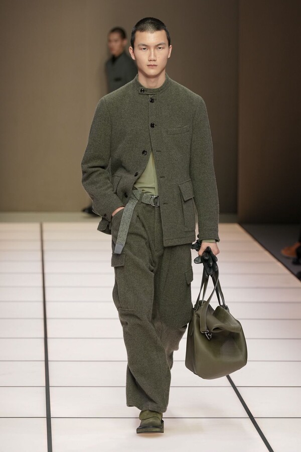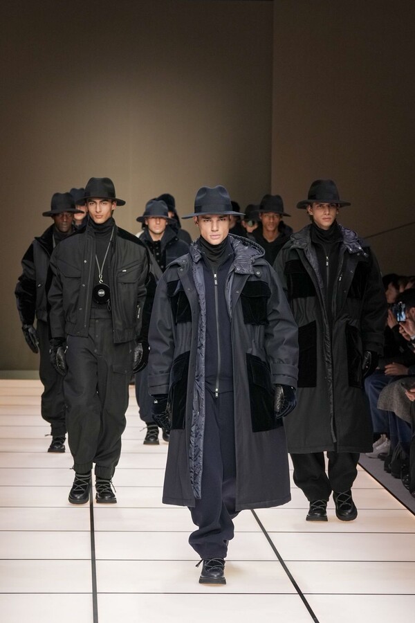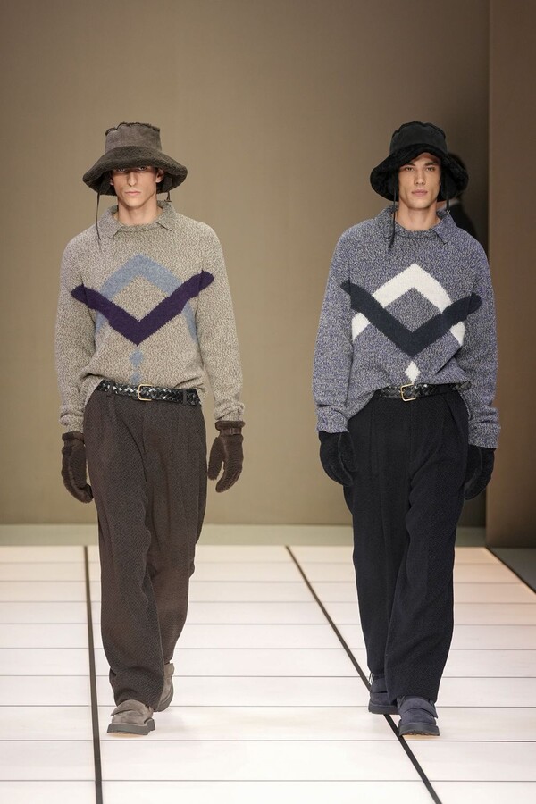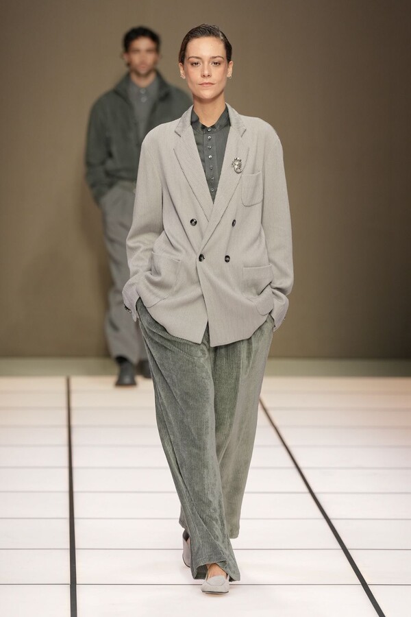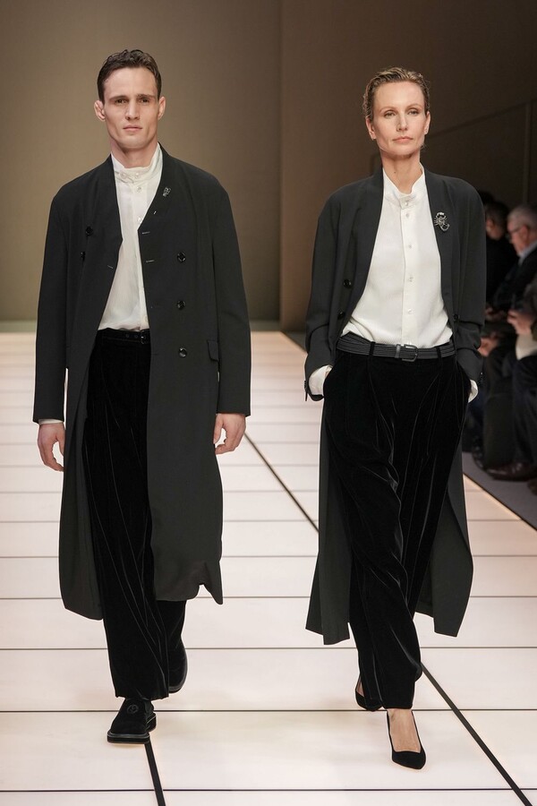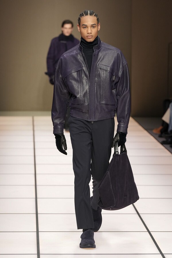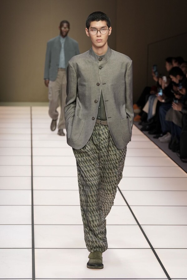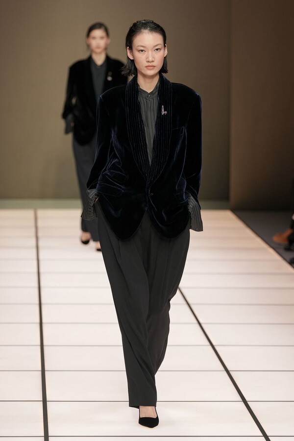 标志性的西装廓形大量出现在秀场上,从宽松版型到线条简洁精致的廓形,多种款式应有尽有。与此同时,双排扣西装外套、宽肩大衣与垂坠感十足的针织衫相得益彰。整季都贯穿着平衡的原则:哑光皮革、磨毛羊绒和柔软羊毛以对称的方式搭配出现,服装廓形本身也比例完美,剪裁精湛。最终呈现出的该系列既展现了 Armani 男装的经典视觉元素,又预示着品牌未来的发展方向,整体风格浑然一体。