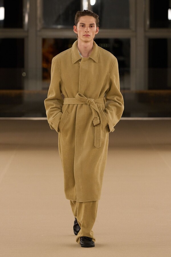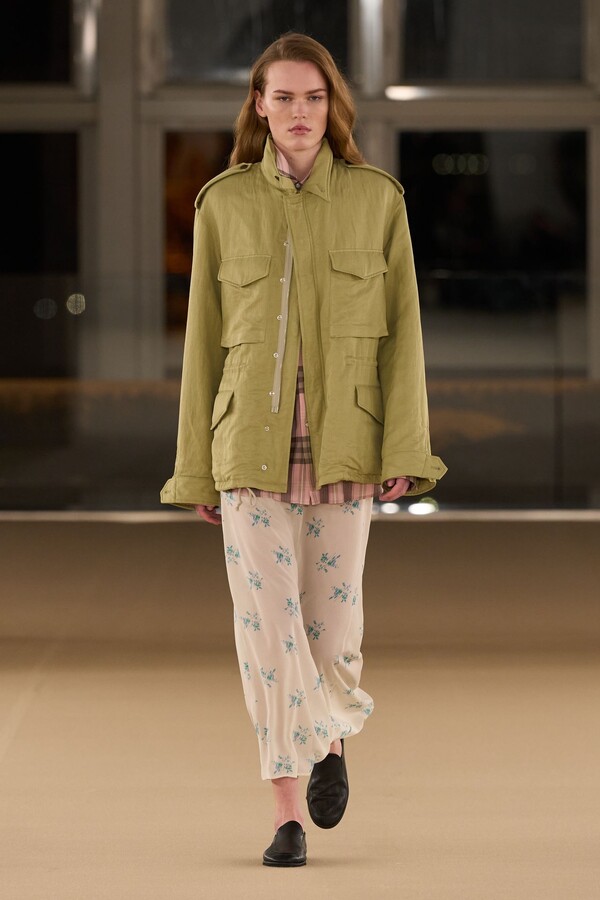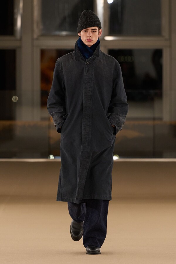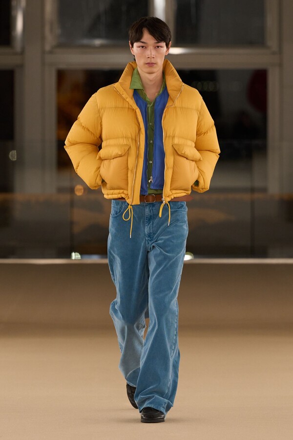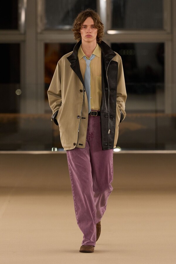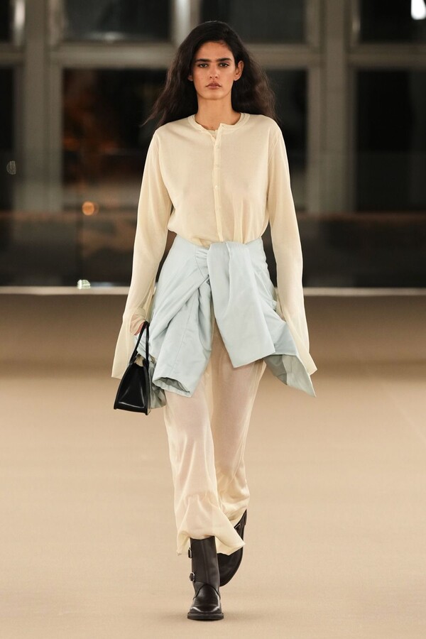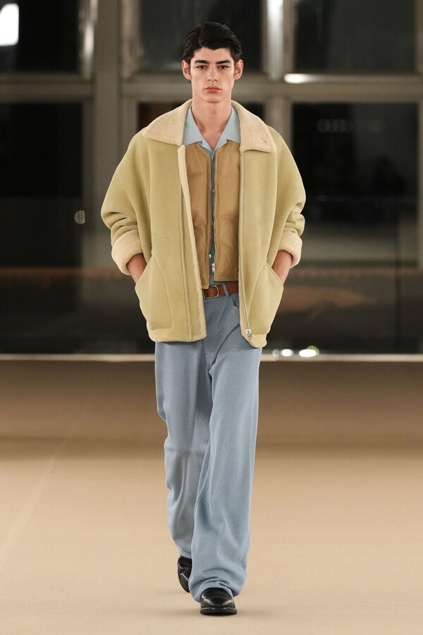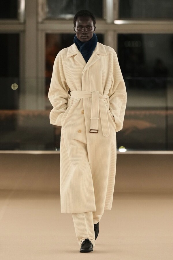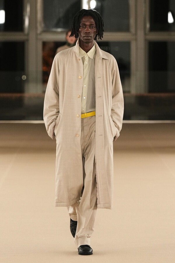 Ryota Iwai 深谙如何用最简约的廓形营造出令人向往的风格。他以色彩为主要沟通媒介,该秀的开场以及结尾造型他都运用了奶油色和米色来营造舒缓的氛围——但这并非极简主义,粗灯芯绒和短款飞行员夹克内衬的厚实皮草等反差设计证明了这一点。Ryota Iwai 认为半透明面料更适合夏季,便将其运用在薄外套和衬衫上。他还创造了一种巧妙的色彩融合方式,例如用一件黄色衬衫搭配豌豆绿风衣,再配上与之呼应的冬季格纹围巾,两者搭配相得益彰,完美和谐。
