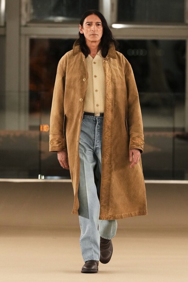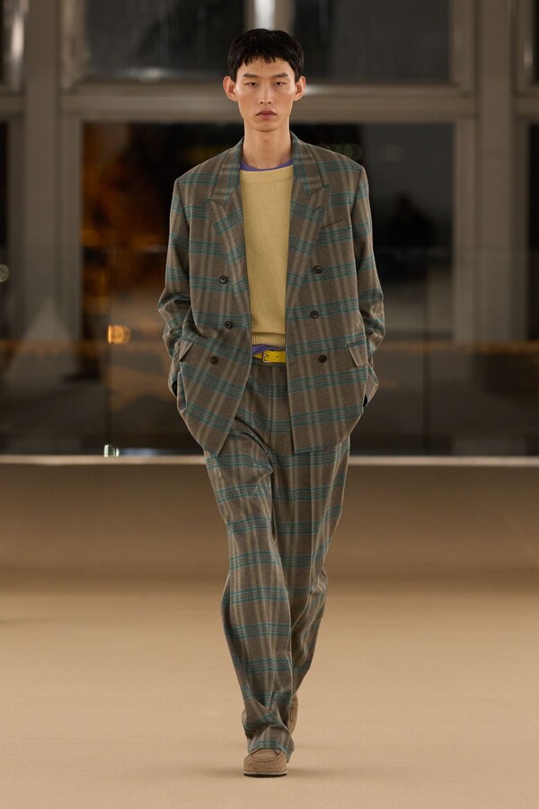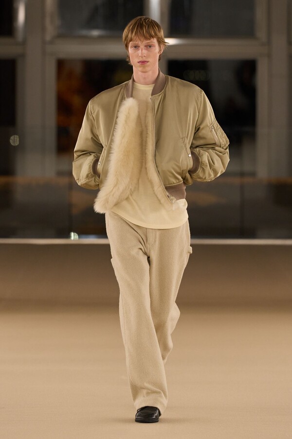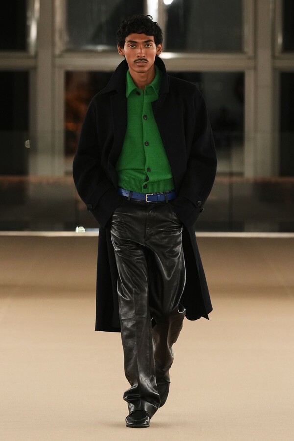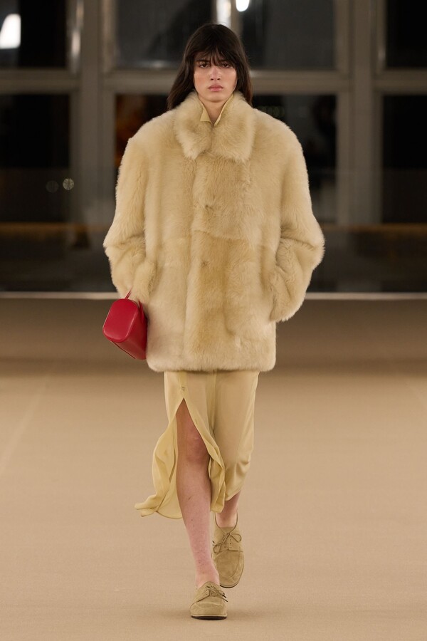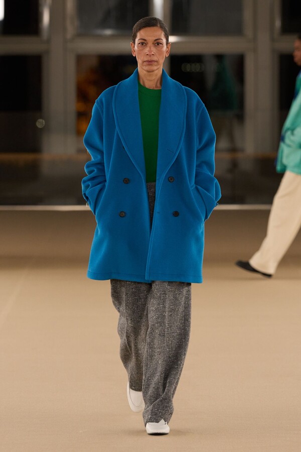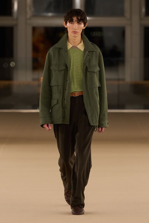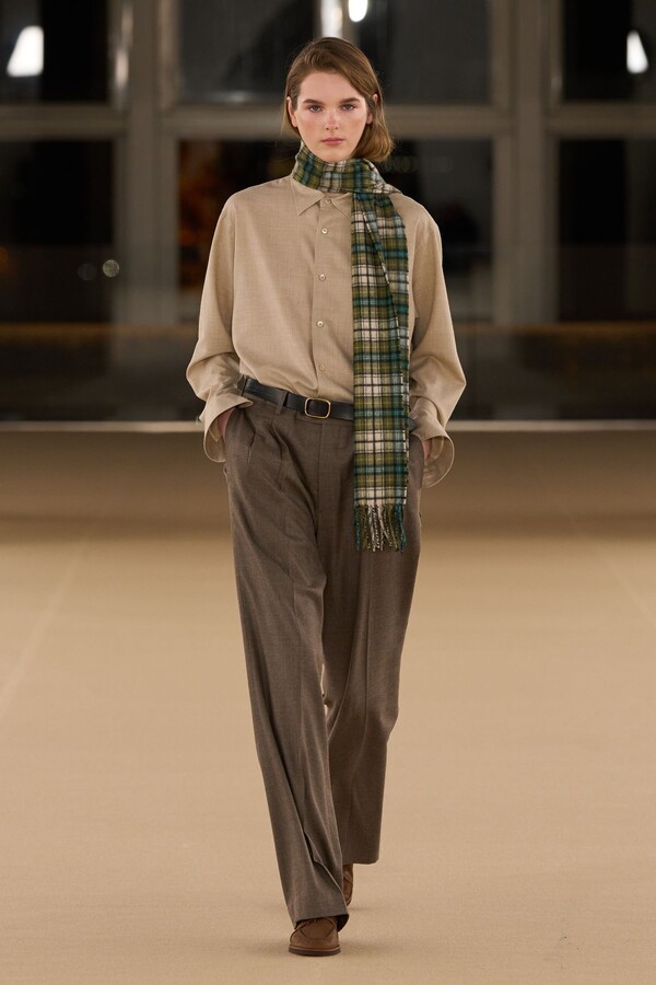 Ryota Iwai 深谙如何用最简约的廓形营造出令人向往的风格。他以色彩为主要沟通媒介,该秀的开场以及结尾造型他都运用了奶油色和米色来营造舒缓的氛围——但这并非极简主义,粗灯芯绒和短款飞行员夹克内衬的厚实皮草等反差设计证明了这一点。Ryota Iwai 认为半透明面料更适合夏季,便将其运用在薄外套和衬衫上。他还创造了一种巧妙的色彩融合方式,例如用一件黄色衬衫搭配豌豆绿风衣,再配上与之呼应的冬季格纹围巾,两者搭配相得益彰,完美和谐。
