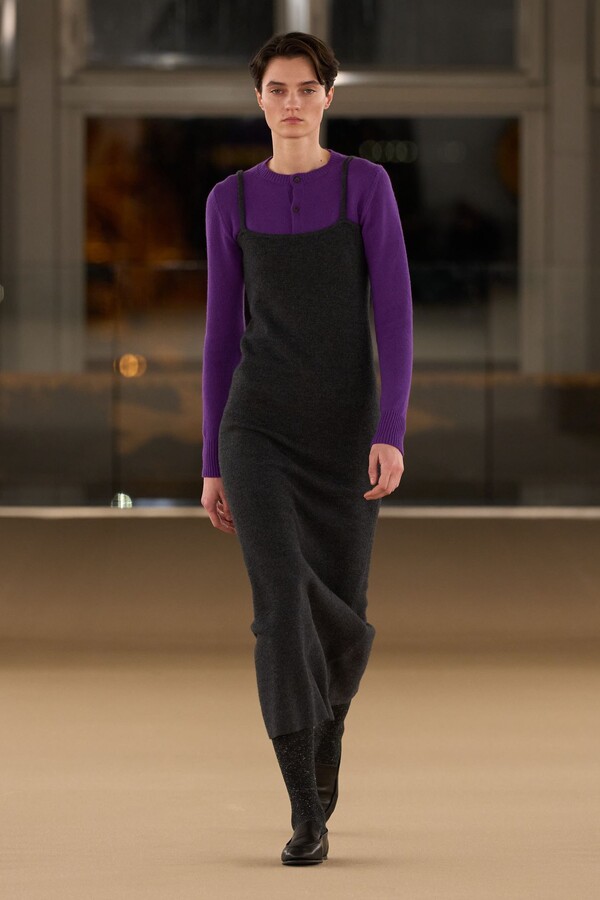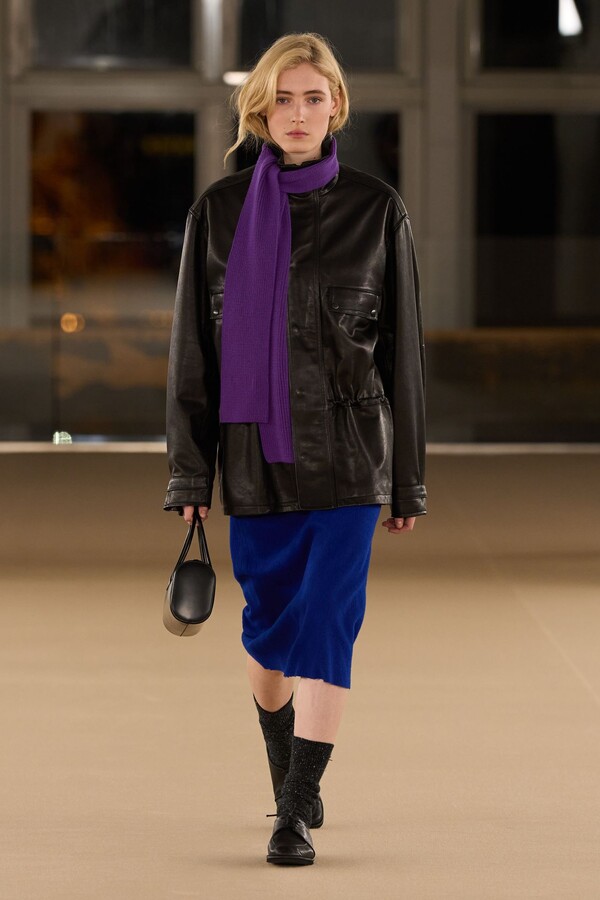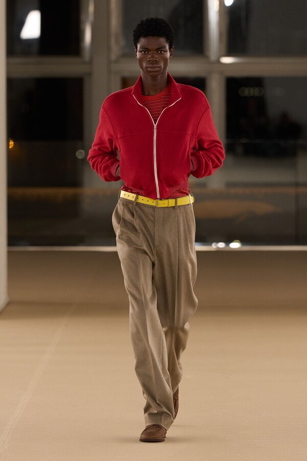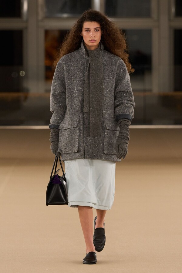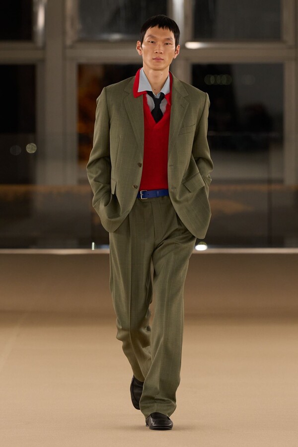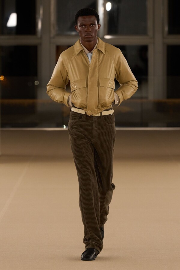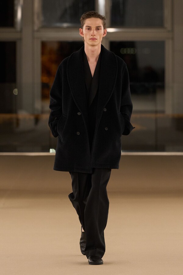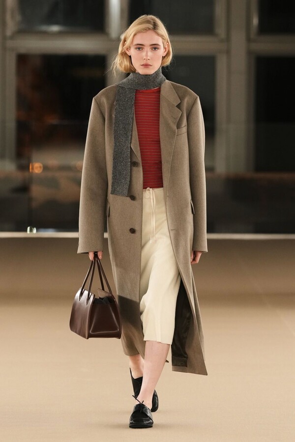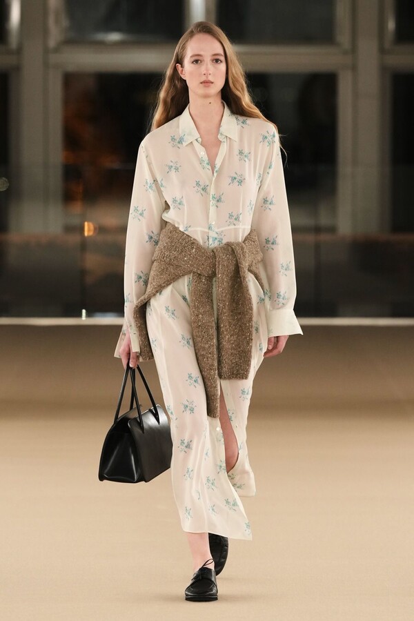 Ryota Iwai 深谙如何用最简约的廓形营造出令人向往的风格。他以色彩为主要沟通媒介,该秀的开场以及结尾造型他都运用了奶油色和米色来营造舒缓的氛围——但这并非极简主义,粗灯芯绒和短款飞行员夹克内衬的厚实皮草等反差设计证明了这一点。Ryota Iwai 认为半透明面料更适合夏季,便将其运用在薄外套和衬衫上。他还创造了一种巧妙的色彩融合方式,例如用一件黄色衬衫搭配豌豆绿风衣,再配上与之呼应的冬季格纹围巾,两者搭配相得益彰,完美和谐。