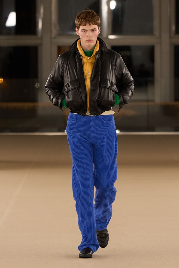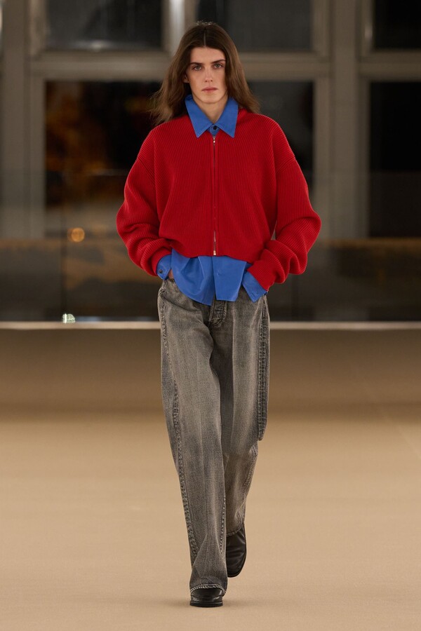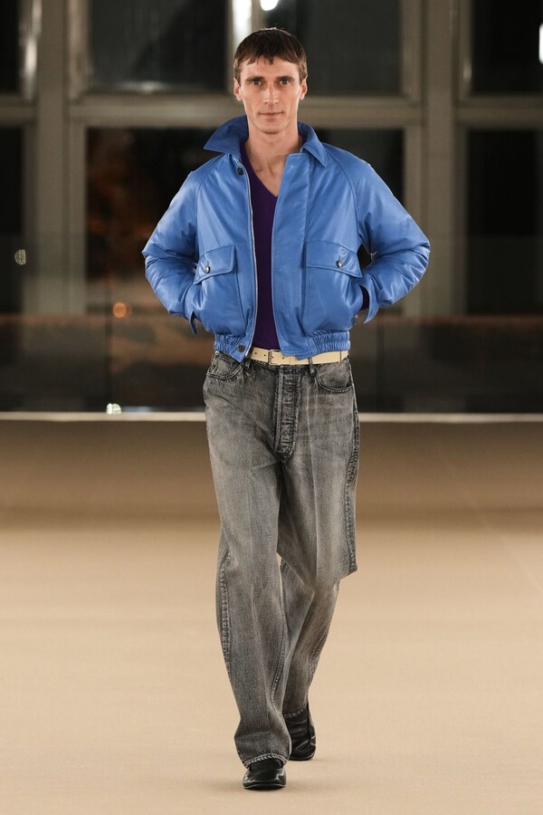 此外,在本季秀场中 80/90 年代复古风贯穿始终,尤其体现在正面带有褶皱的牛仔面料上。这种复古元素也出现在了短款羽绒服和超大号「老爹」外套上——红蓝、黄红、紫蓝或蓝紫等配色组合,无不散发着怀旧气息。