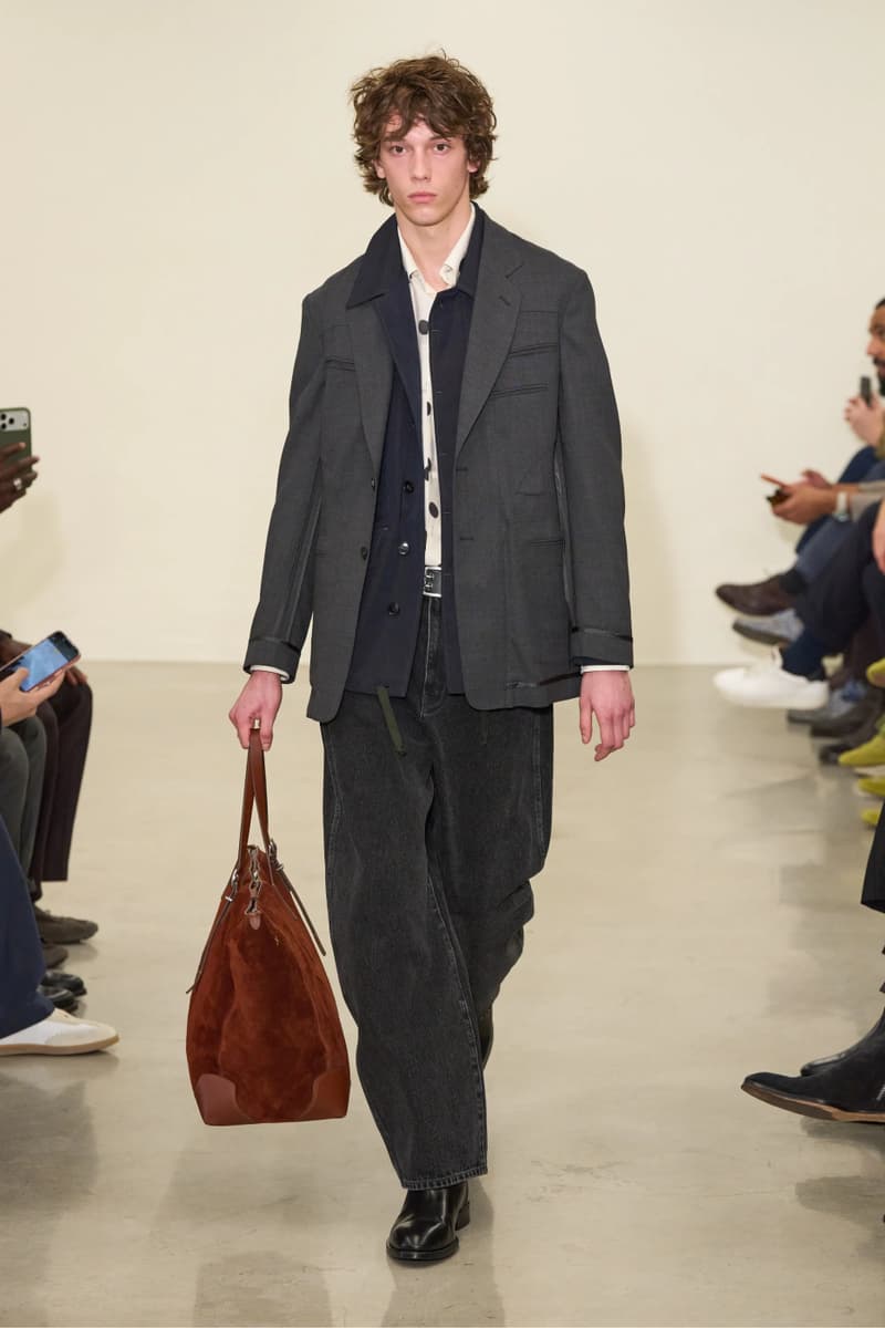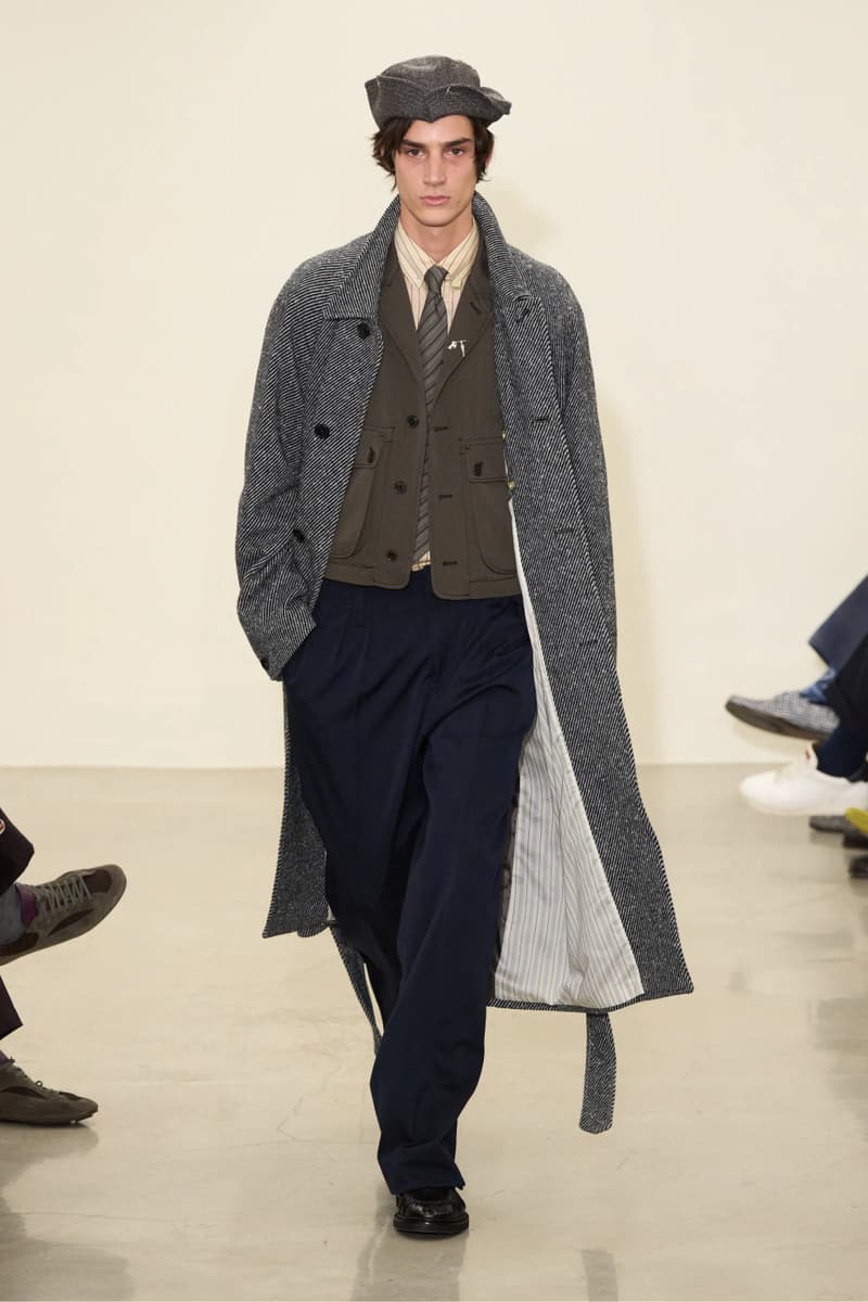 艺术叙事与材质实验同样构成系列的重要维度。印有艺术家 Colin Barnes 手绘草图的衬衫,致敬品牌 1978 年以插画取代秀场影像的经典做法;剪裁方面,低腰双排扣西装与褶裥长裤营造出松弛而考究的比例。面料选择上,平滑处理的 Harris Tweed 大衣、深色 Donegal 粗花呢猎装夹克,以及被重塑为超大围巾造型的 Fair Isle 针织单品,共同构筑出一个怀旧却不失先锋气质的 FW26 男装世界。