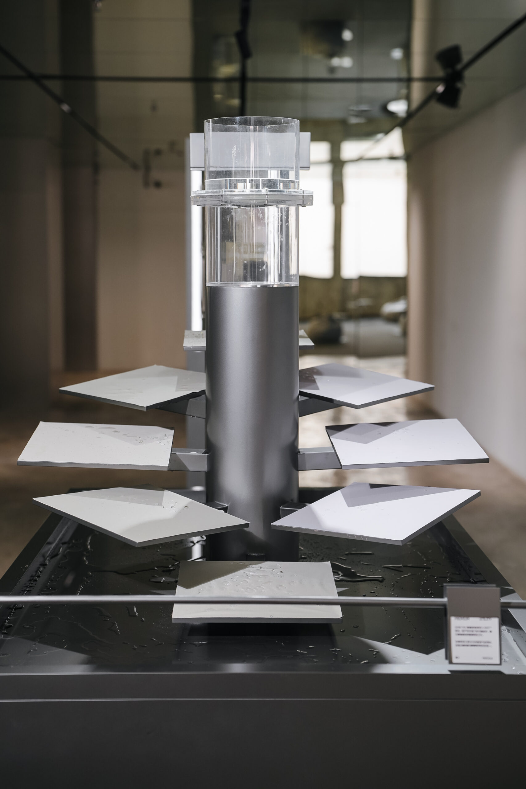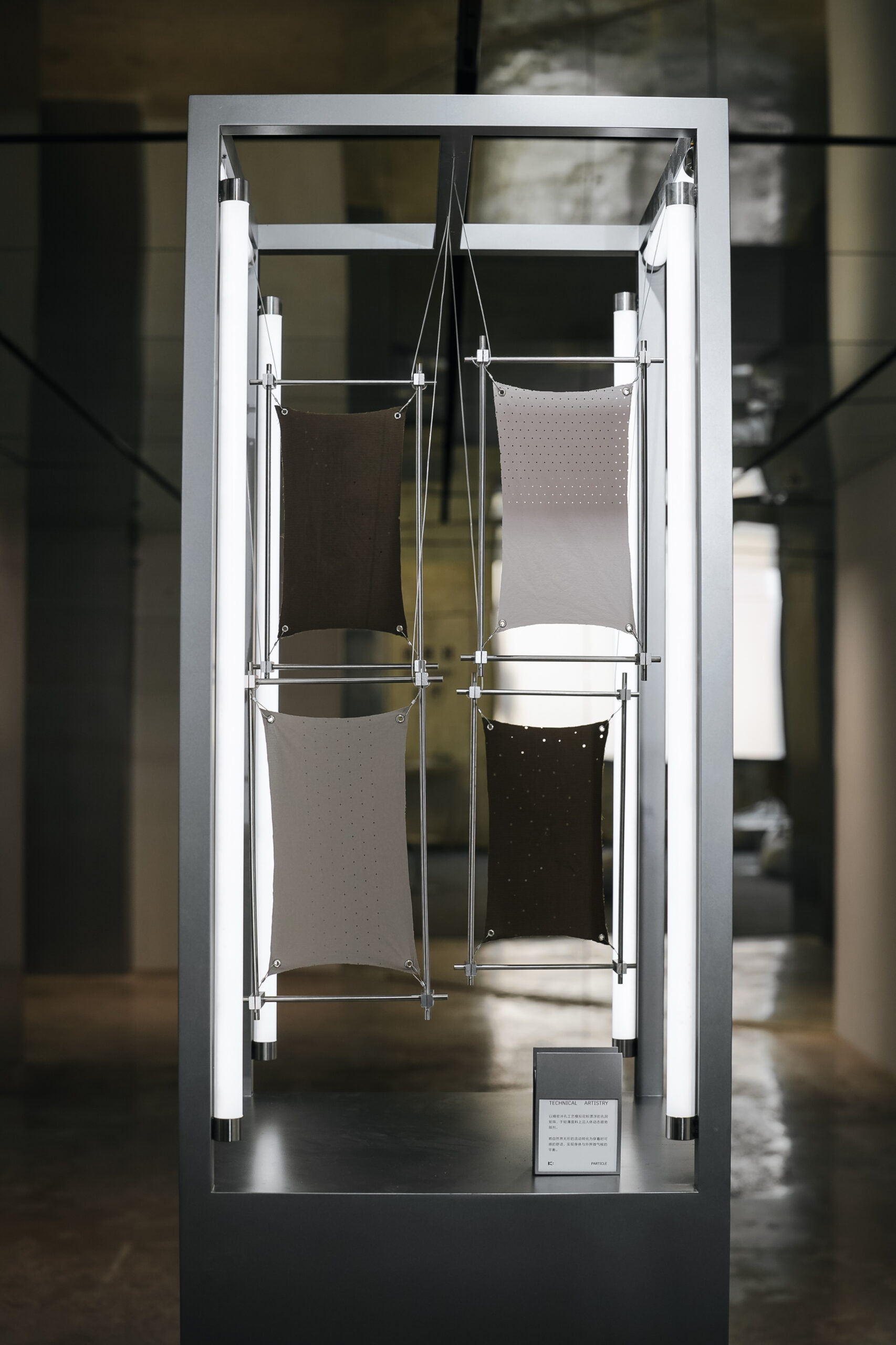 「K:PARTICLE」对细节的极致追求,在空间内被具象化为可触碰的质感。二层面料工艺展示区,通过三组核心面料互动台,将系列中的尖端面料科技,从抽象数据转化为可感知的「有形之质」。Spiber 生命酿造装置、轻薄冲孔动态美学装置以及 GORE-TEX 性能实证装置相继展示。