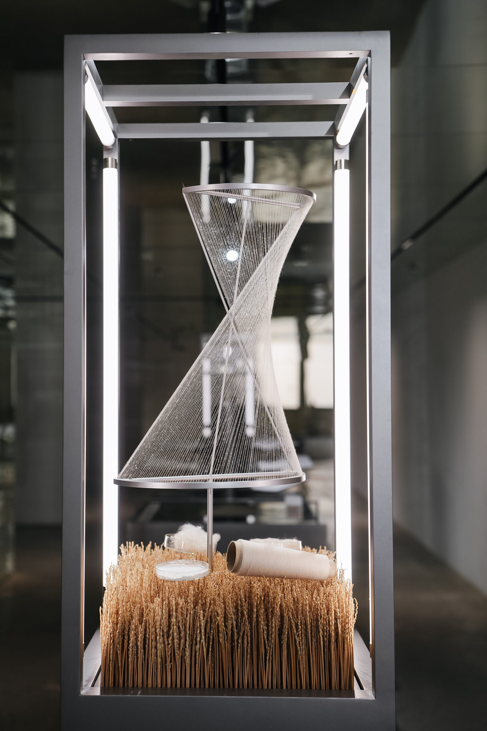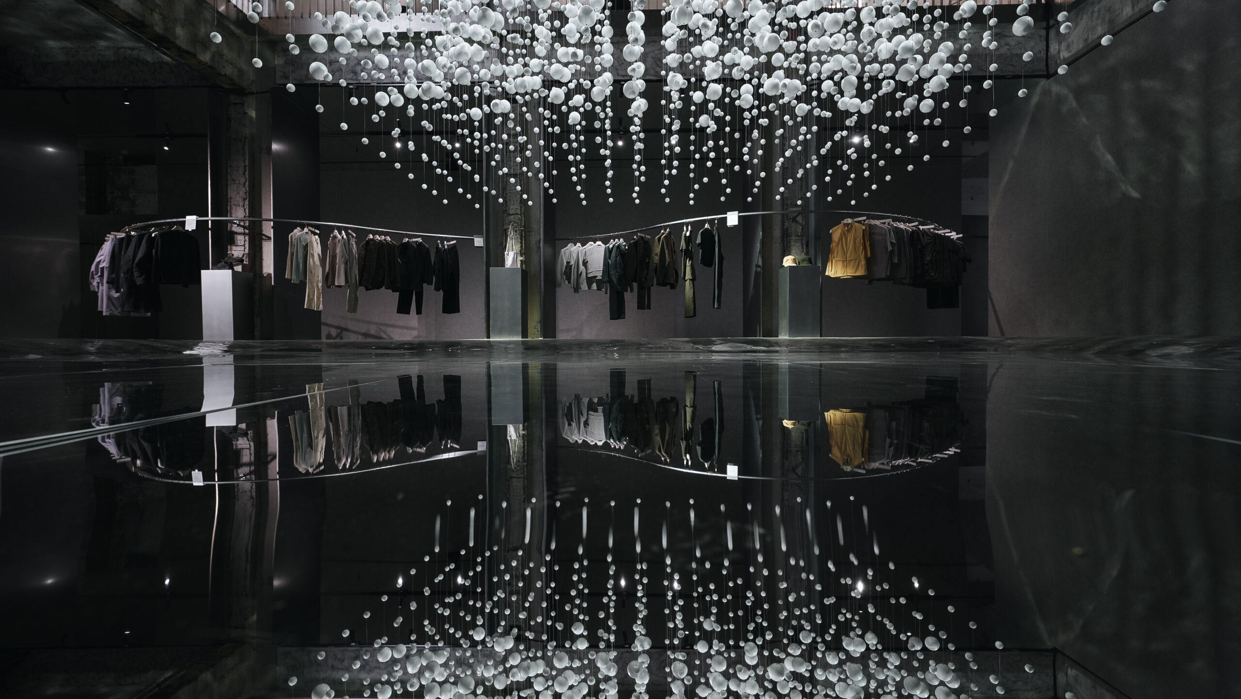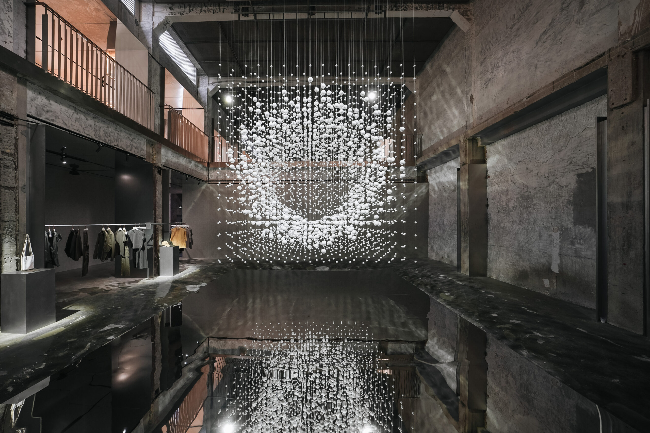空间首先通过三组独特的艺术化互动装置,将抽象的「粒子」概念解构为可视、可触、可感的动态前沿艺术。在这里,服装超越了本身的物质形态,与整个空间的光影、气流与能量场同频共振,引领到访者步入一个由微观美学重构的、充满生命律动的感官新世界。