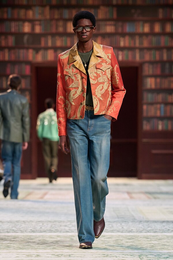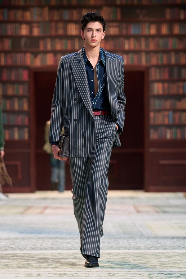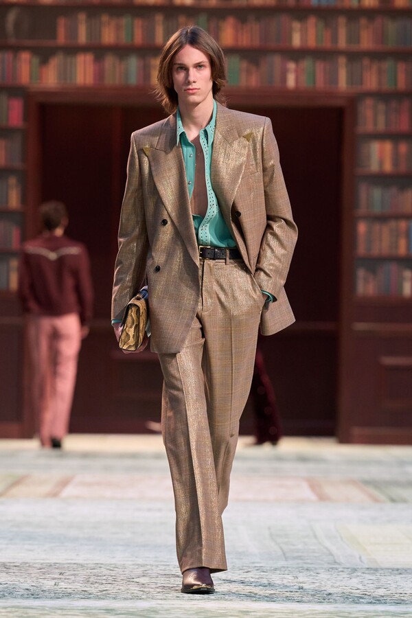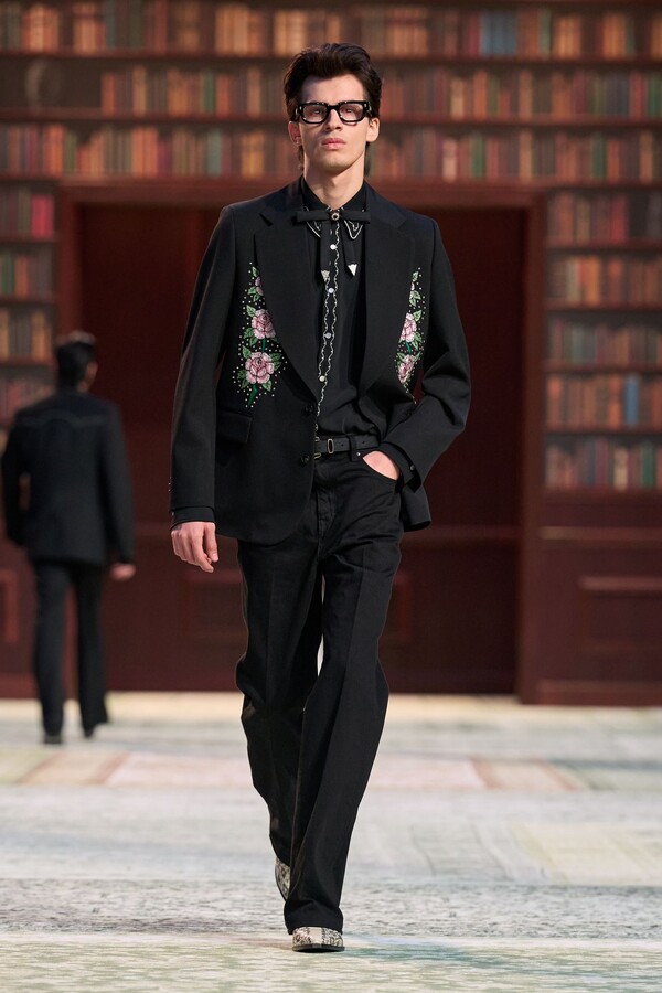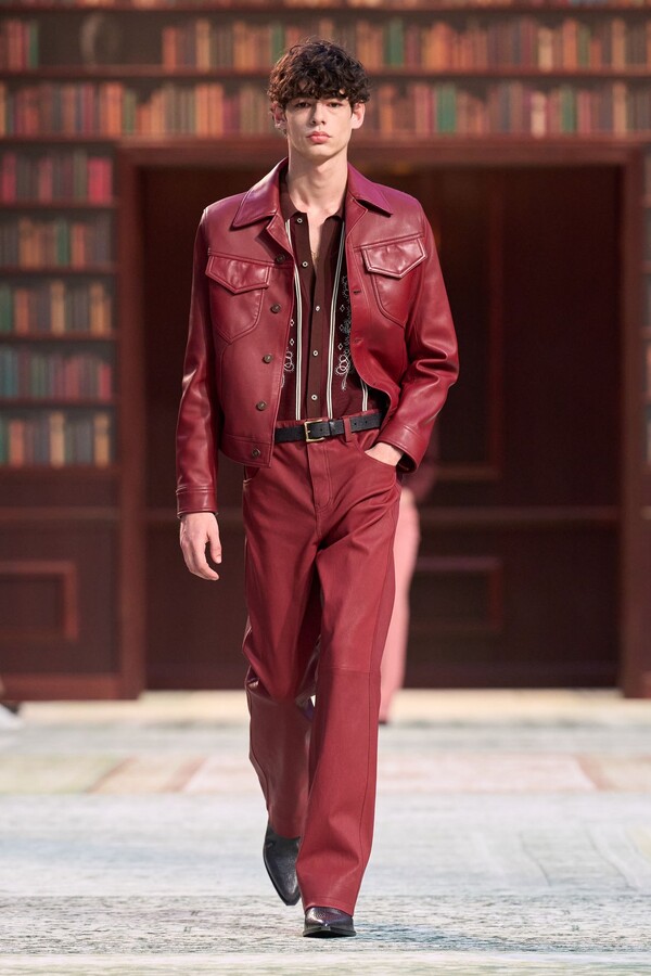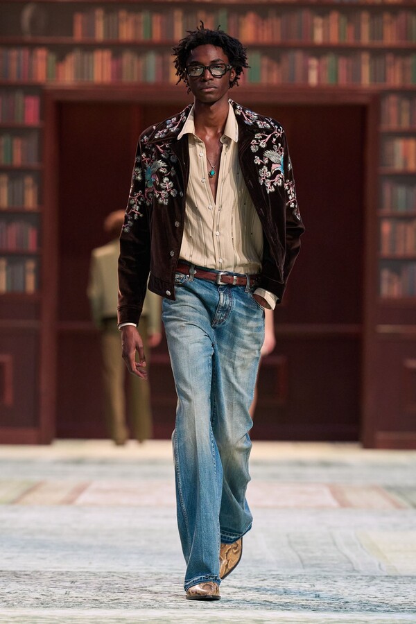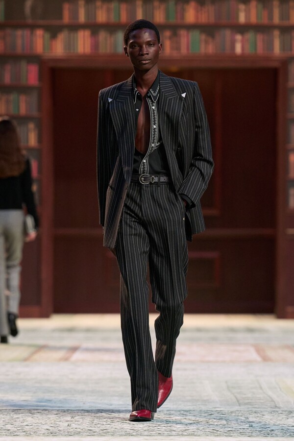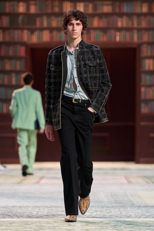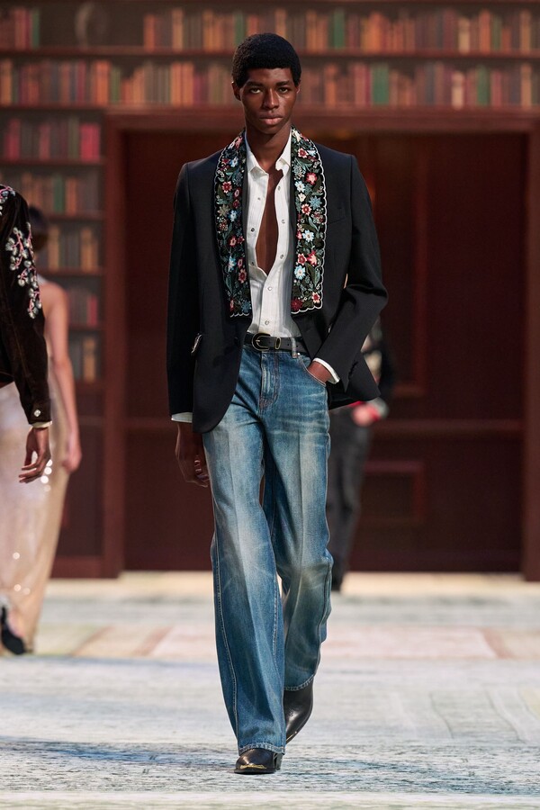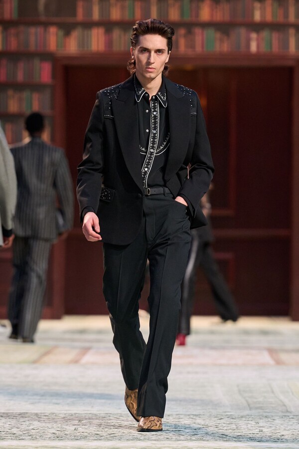 男装剪裁依然是该品牌的标志性特色,正式感依然保留,但穿着方式更像是日常战袍而非特殊场合的礼服:亨利衫外搭西装外套,西裤配牛仔裤,西部靴取代了传统的皮鞋。设计师将正装融入街头,同时又不失其精湛的工艺。