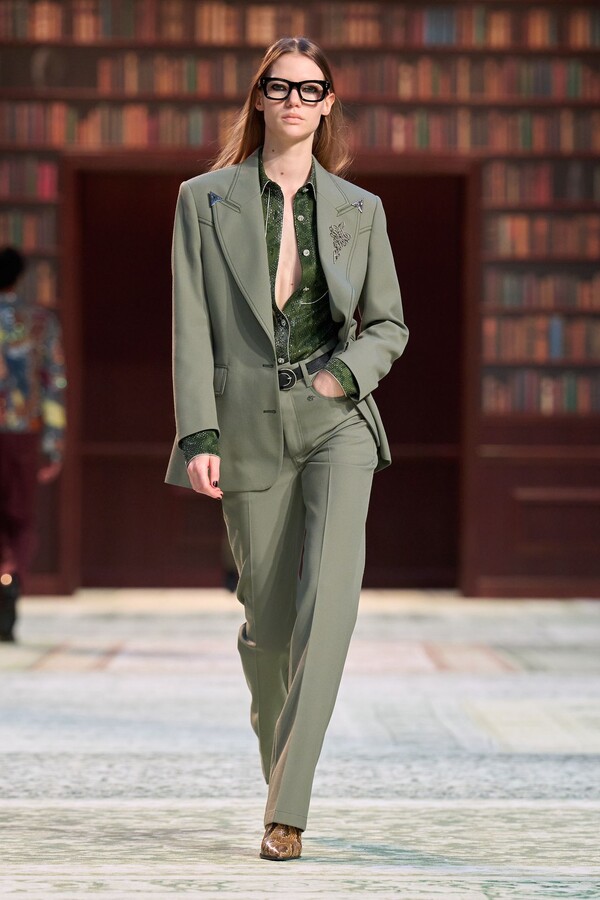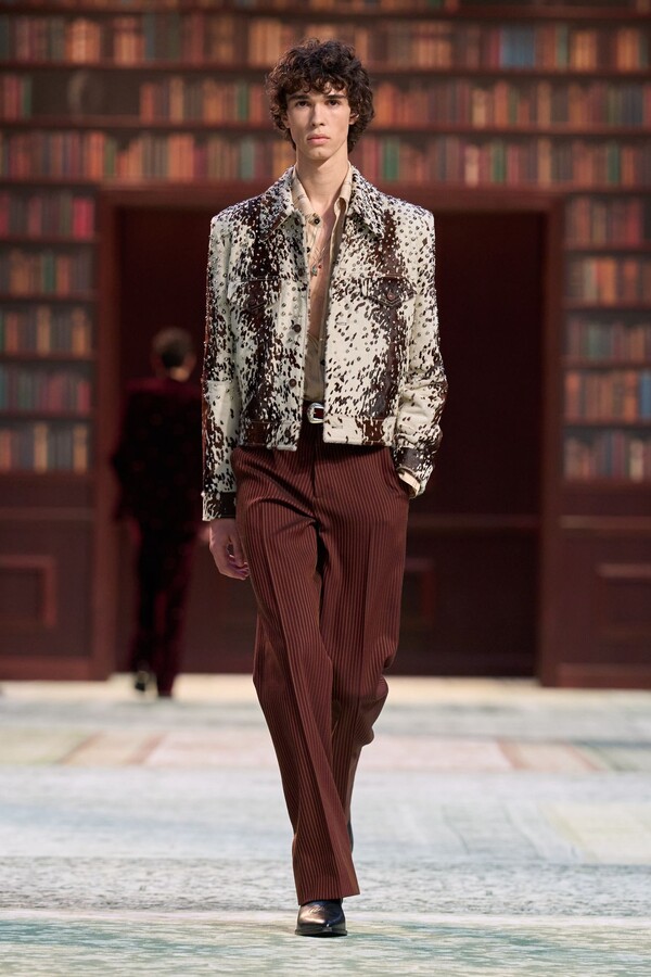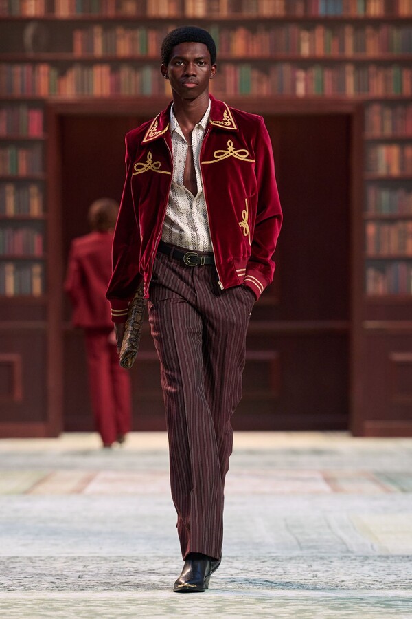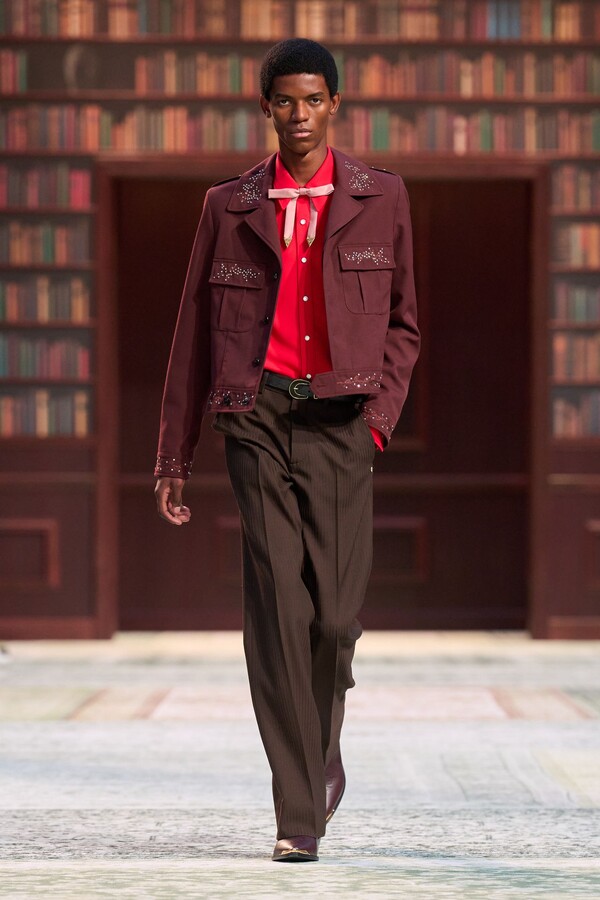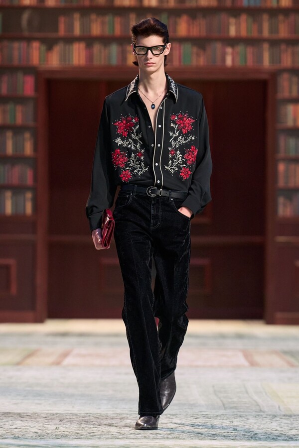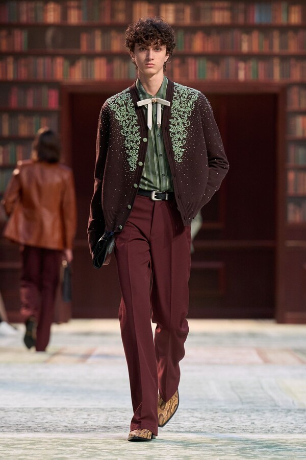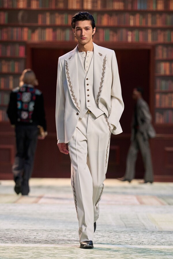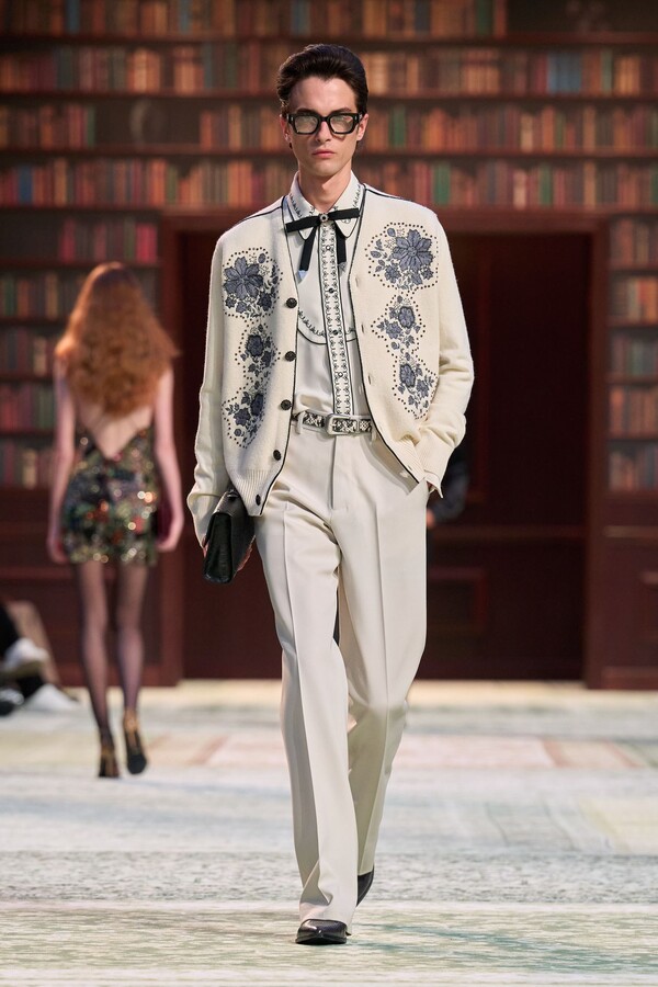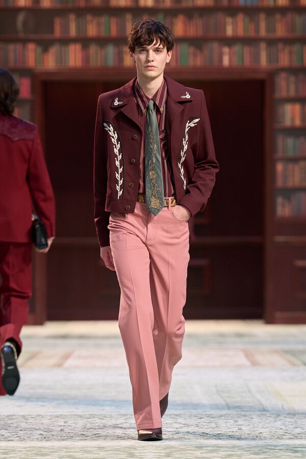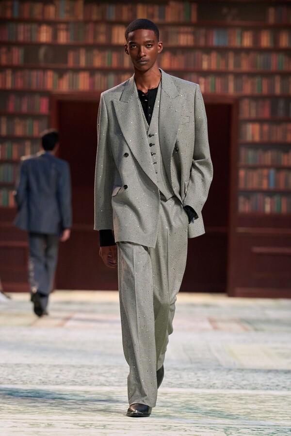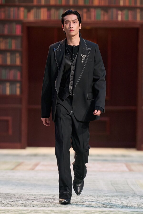 男装剪裁依然是该品牌的标志性特色,正式感依然保留,但穿着方式更像是日常战袍而非特殊场合的礼服:亨利衫外搭西装外套,西裤配牛仔裤,西部靴取代了传统的皮鞋。设计师将正装融入街头,同时又不失其精湛的工艺。