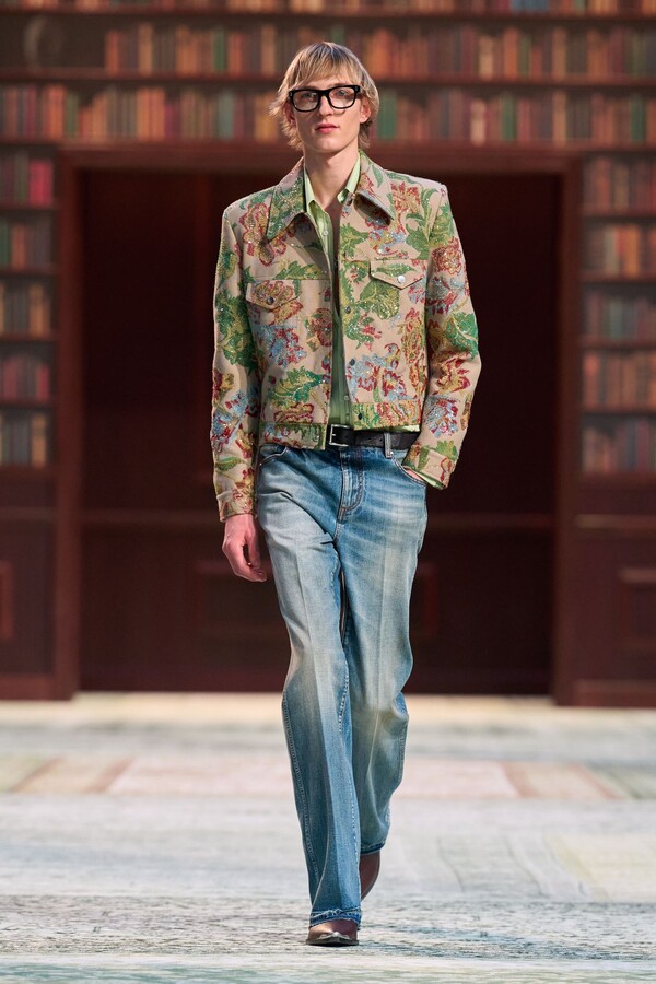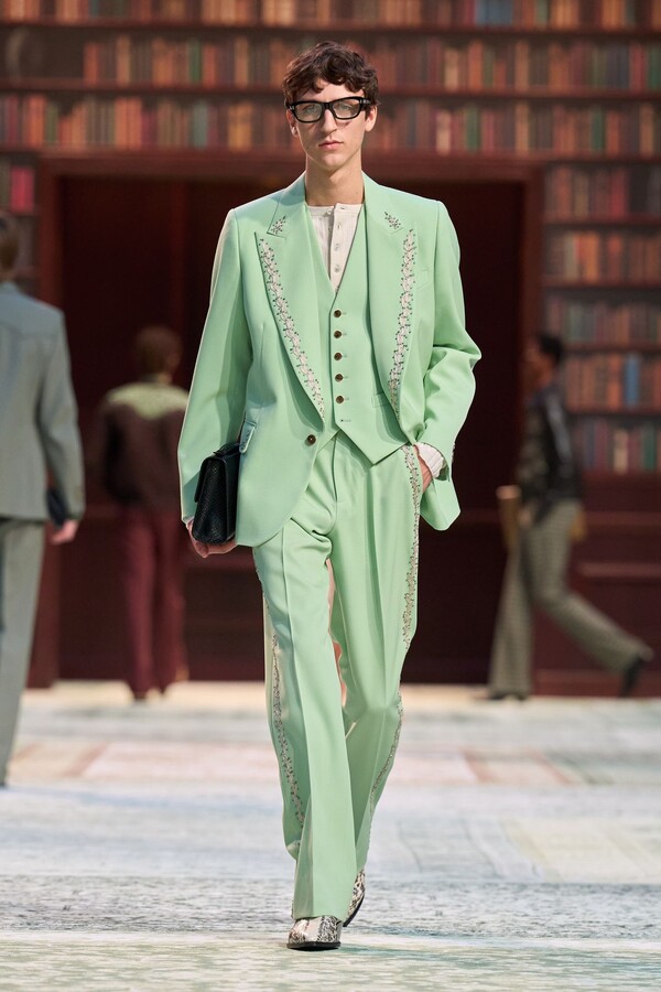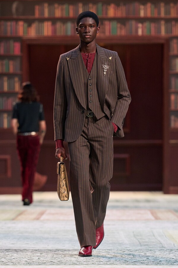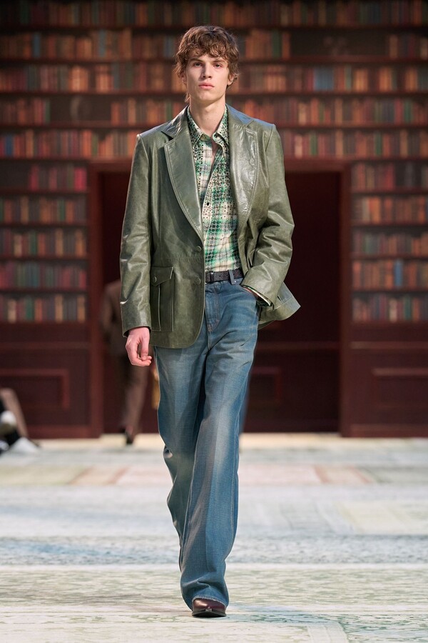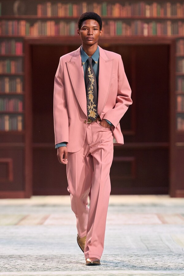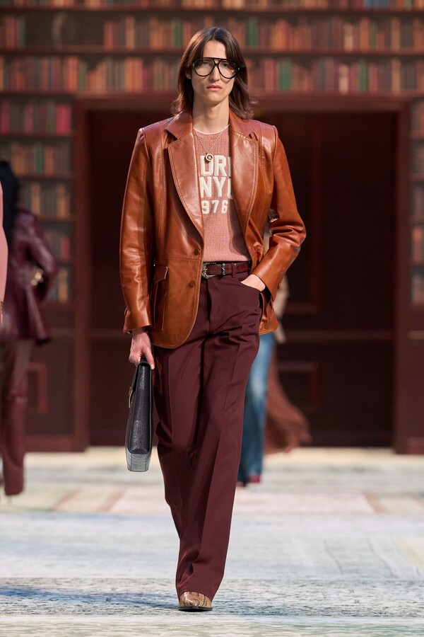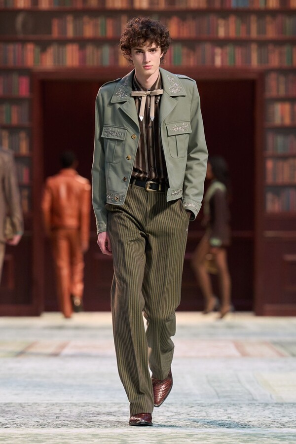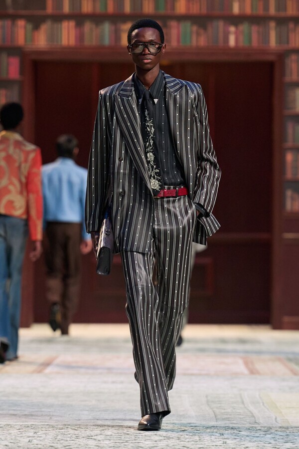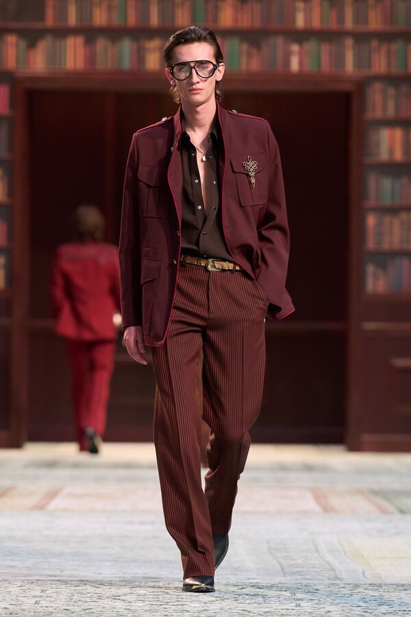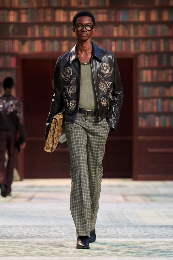 男装剪裁依然是该品牌的标志性特色,正式感依然保留,但穿着方式更像是日常战袍而非特殊场合的礼服:亨利衫外搭西装外套,西裤配牛仔裤,西部靴取代了传统的皮鞋。设计师将正装融入街头,同时又不失其精湛的工艺。