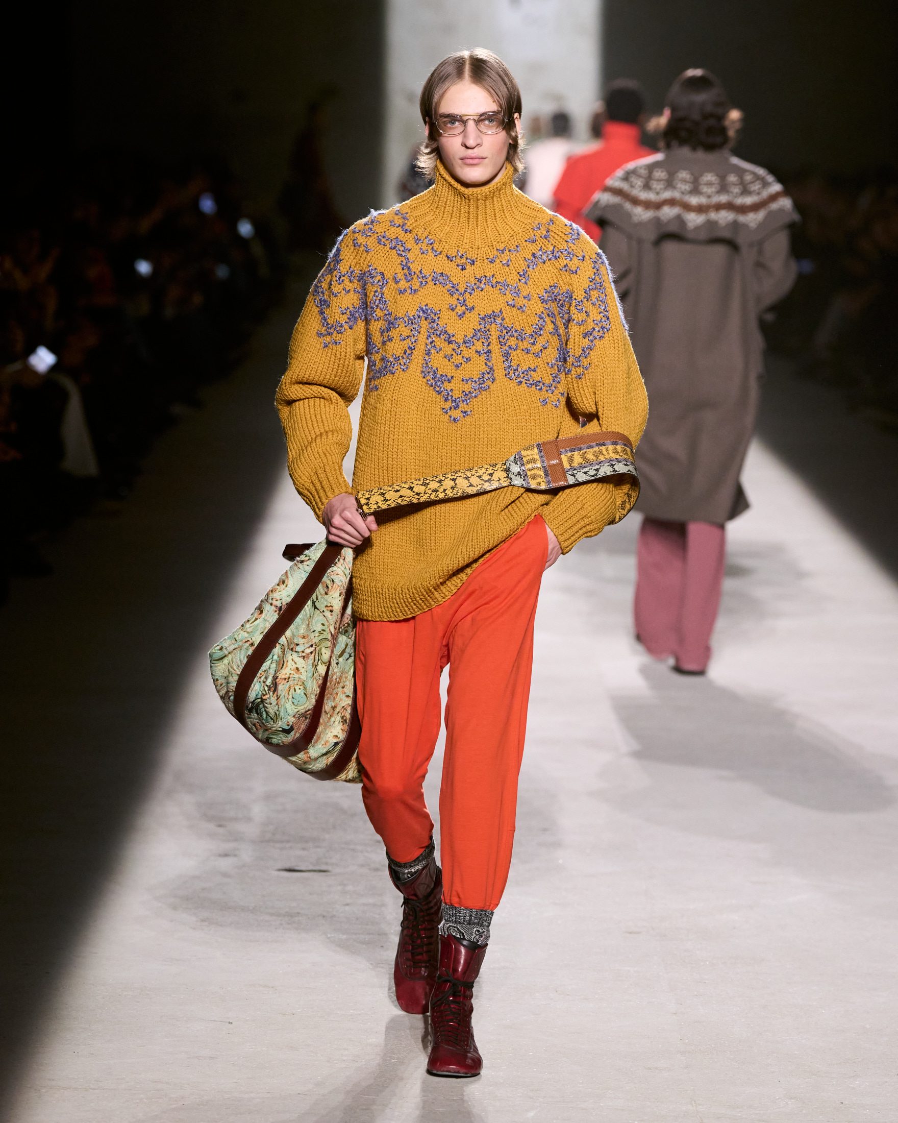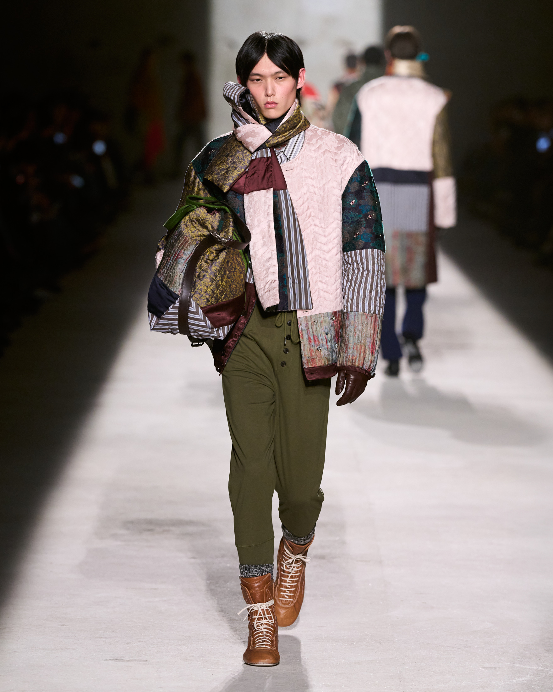 鞋履设计贴近地面,为行动与探索准备:运动鞋、高帮拳击鞋、带有布洛克雕花的整裁牛津鞋。包袋宽大柔软,如同生活的容器:健身包、洗衣袋、邮差包、书包,陪伴每一次出发。配饰则为这些探索世界的角色注入即兴气质:仿若流浪者手作的拼接针织帽、用以观察世界的眼镜、传承的家族饰物、钓鱼饵针,以及半宝石打造的幸运护身符——所有细节,都在诉说一段正在展开的旅程。