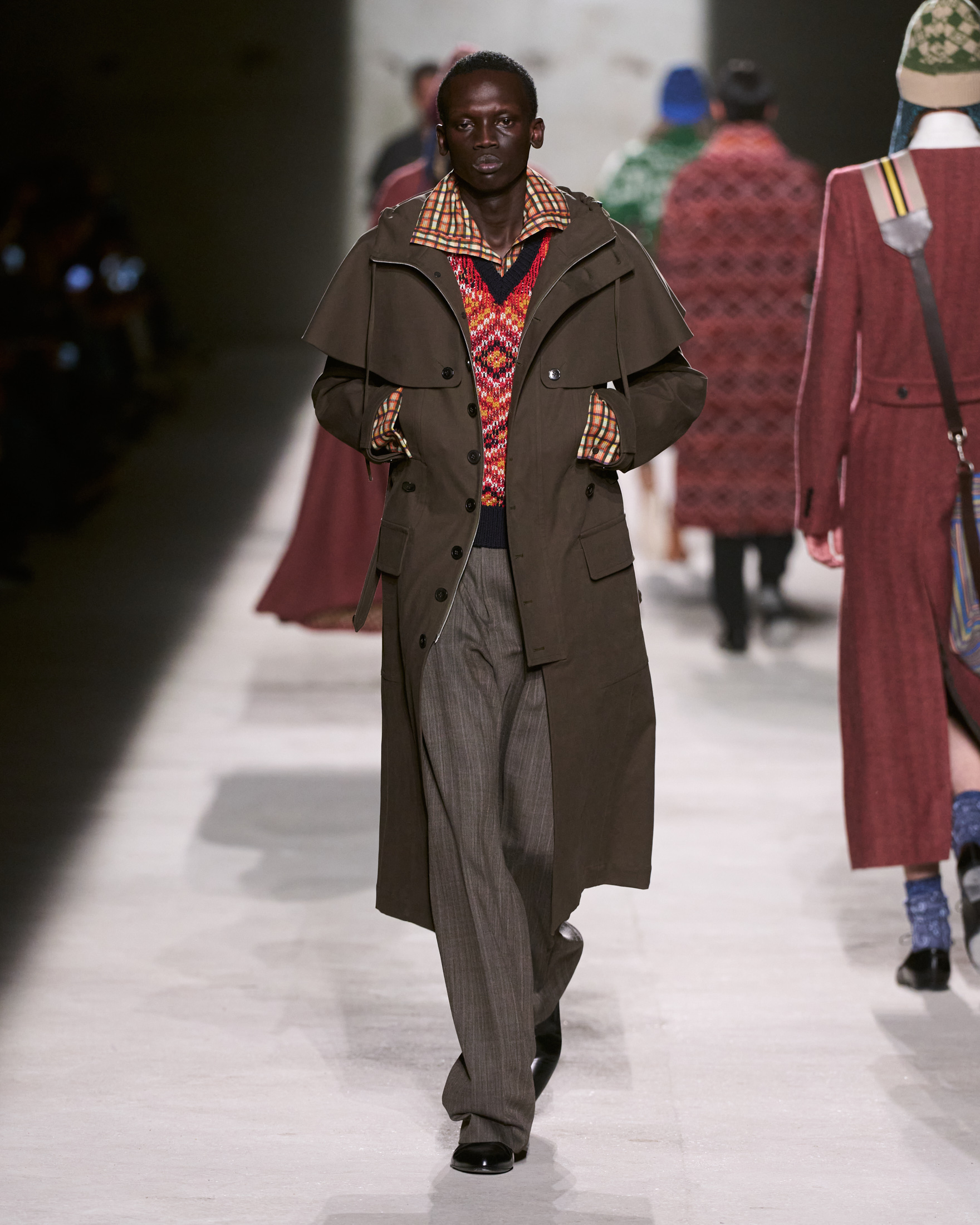 这是一次关于「正在形成中的自我表达」的探索——从这里拾取,向别处携带。设计语言中贯穿着直率的并置:温度感与锋利的随性共存,校服般的严谨剪裁与被重新诠释的徽章相遇。修长的铅笔大衣与派克大衣、披风与短披肩、苏格兰裙与跑鞋——它们自由组合,轮廓杂糅而高挑,在比例之间展开游戏:过紧与过大、过长与略短,微妙而不羁。