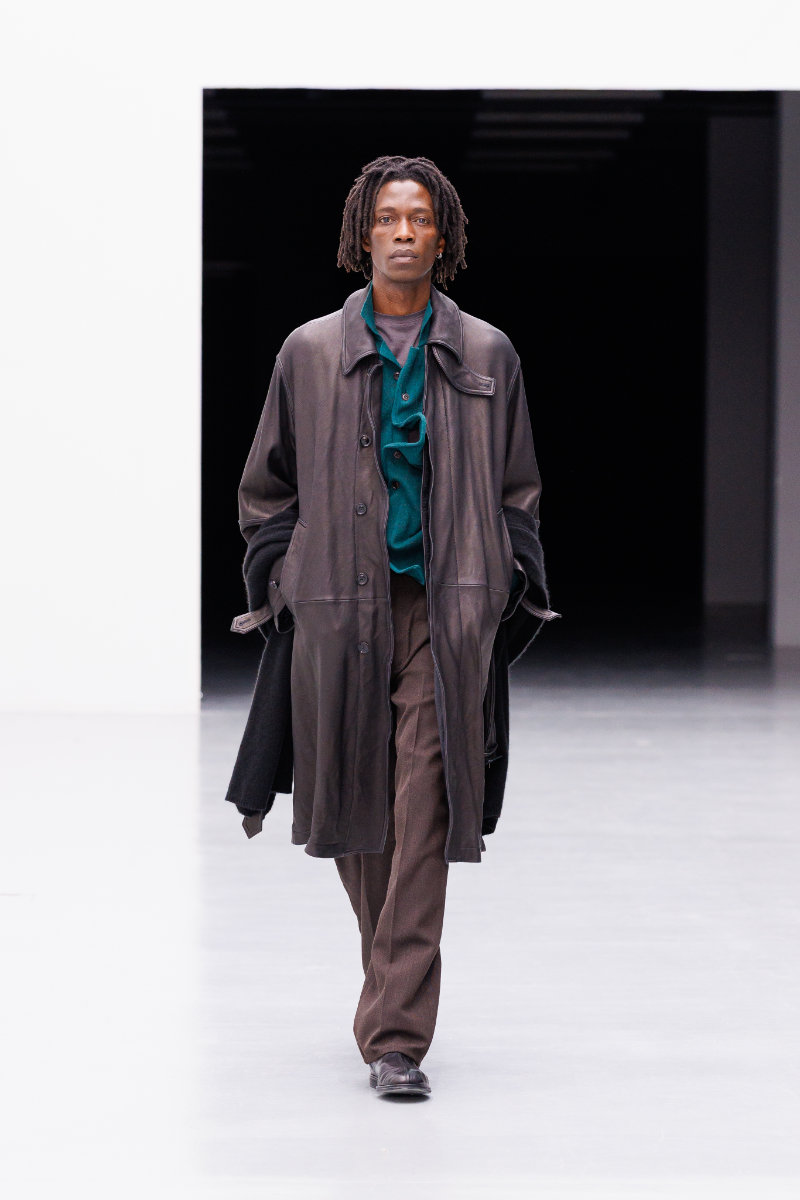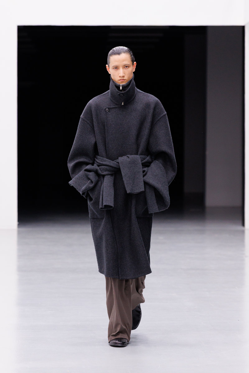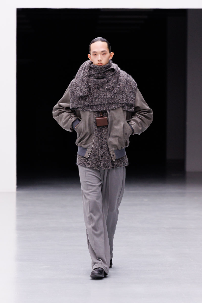 一切都显得低调内敛。配色克制且以单色调为主,营造出一种近乎冥想般的平静氛围。皮夹克、针织衫和宽松剪裁的服装巧妙融合,构成一个和谐统一的衣橱,既实用又精致。在这里,简约仅仅是起点,真正重要的在于廓形、结构以及贯穿每套造型的微妙错位感。所有造型传递出一种掌控力、克制感和清晰的专业性。YOKE 提供的并非孤立的单品,而是一整套服装体系,其中每一件单品都通过整体搭配来展现其意义。