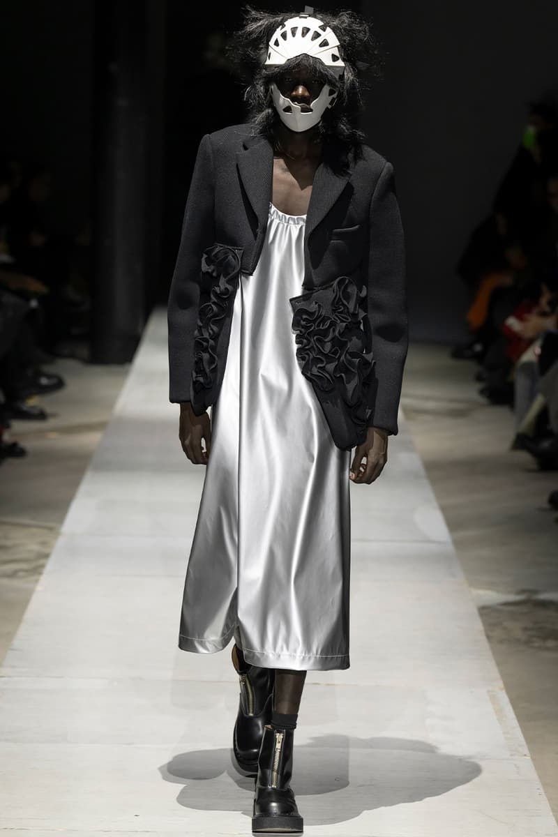 鞋履合作成为本季另一关键线索:手绘「My energy comes from freedom」标语的 Kids Love Gaité 皮鞋,与极简化演绎的 Air Jordan 11 首次亮相 COMME des GARÇONS Homme Plus 秀场,共同构成精神与视觉的锚点。当深色造型如黑洞般层层推进,最终以刺眼纯白造型谢幕,仿若原初之光乍现,宣告又一轮宇宙循环的开启。