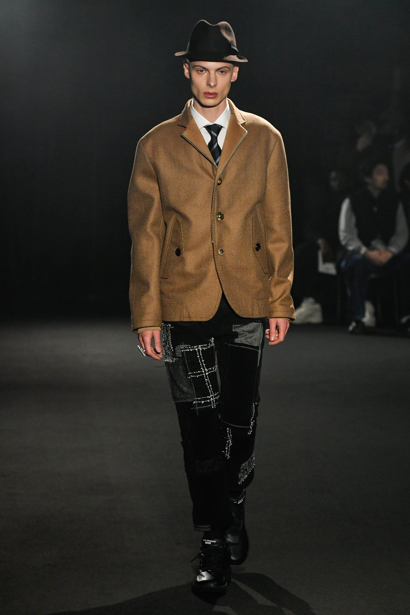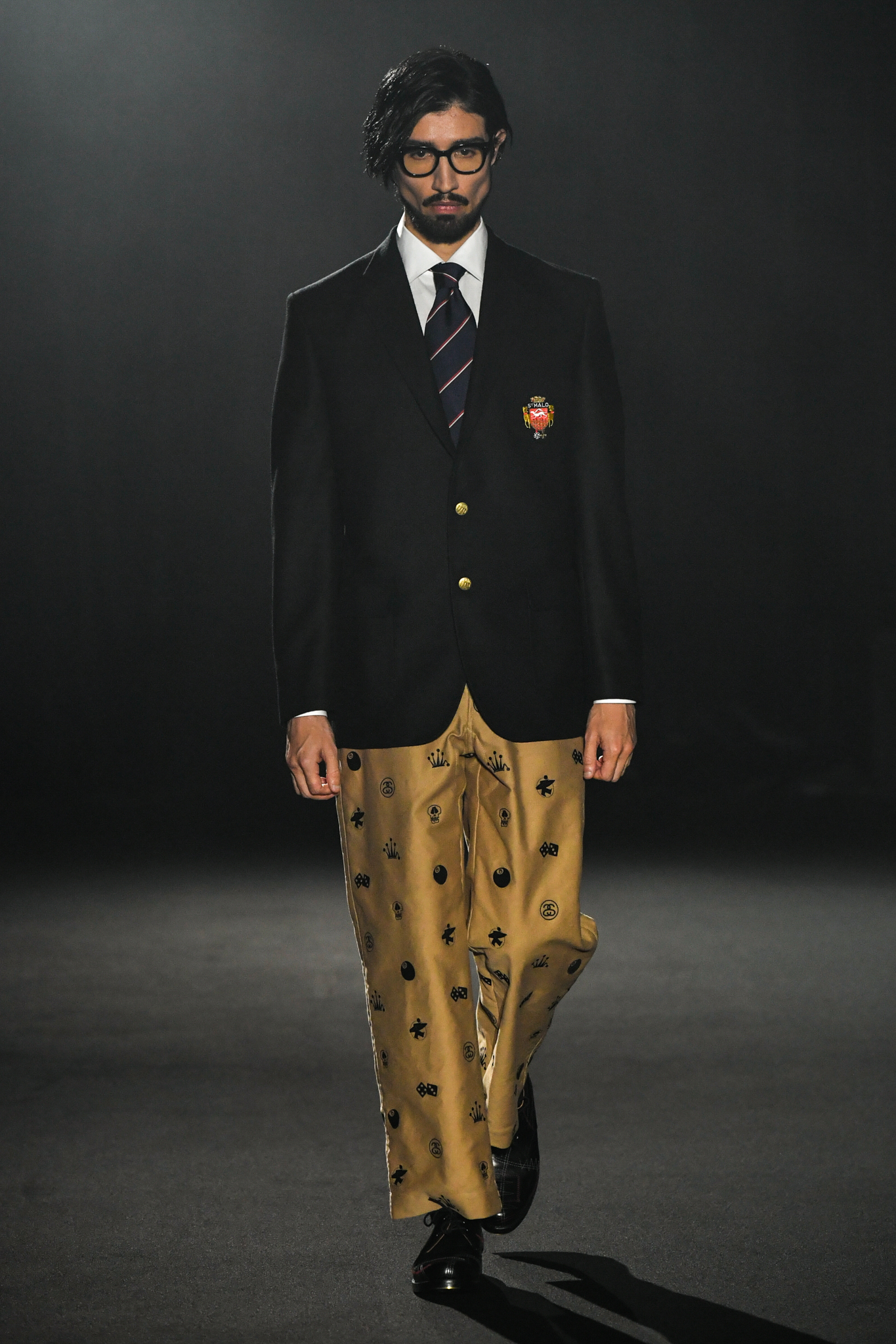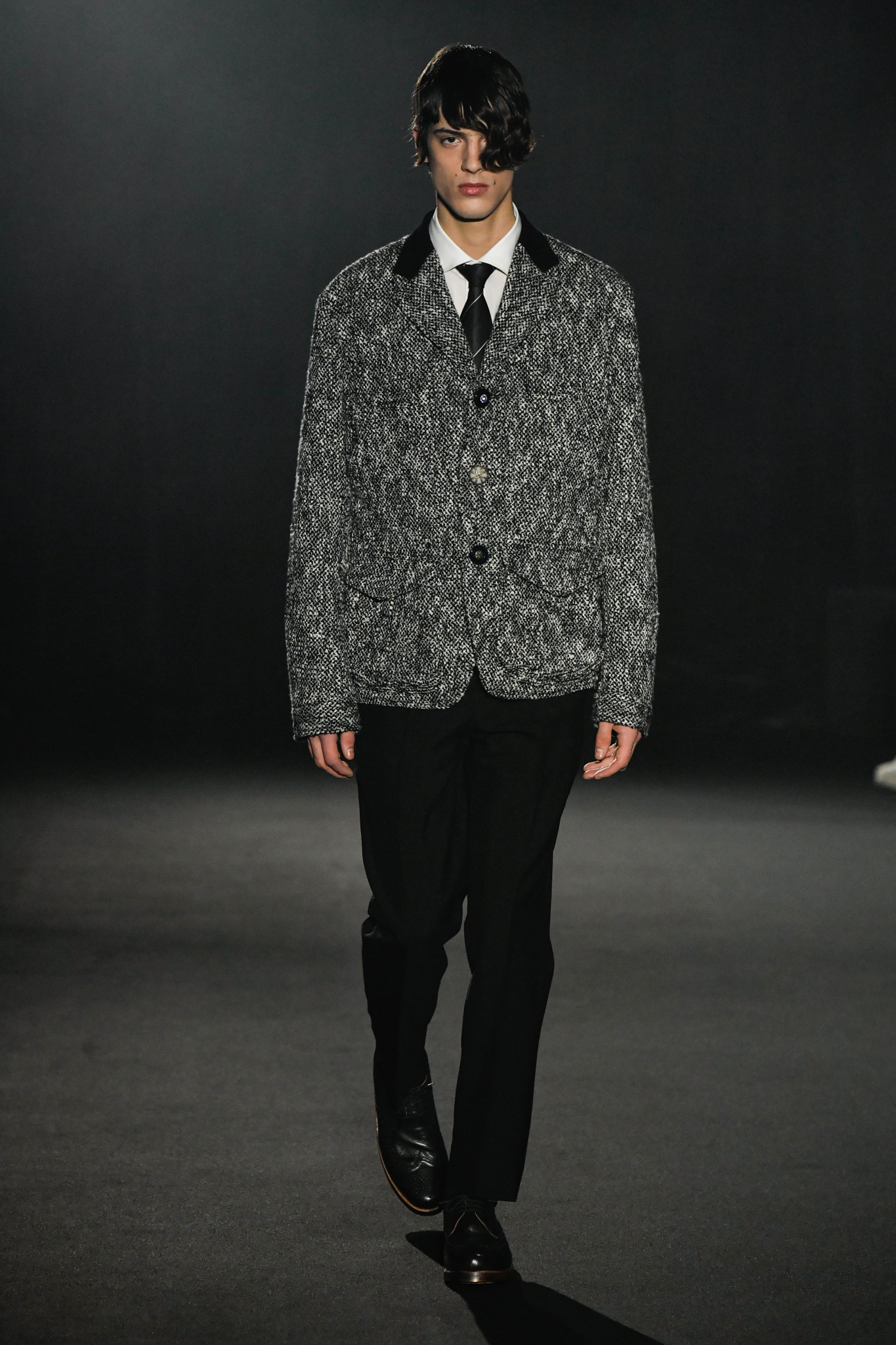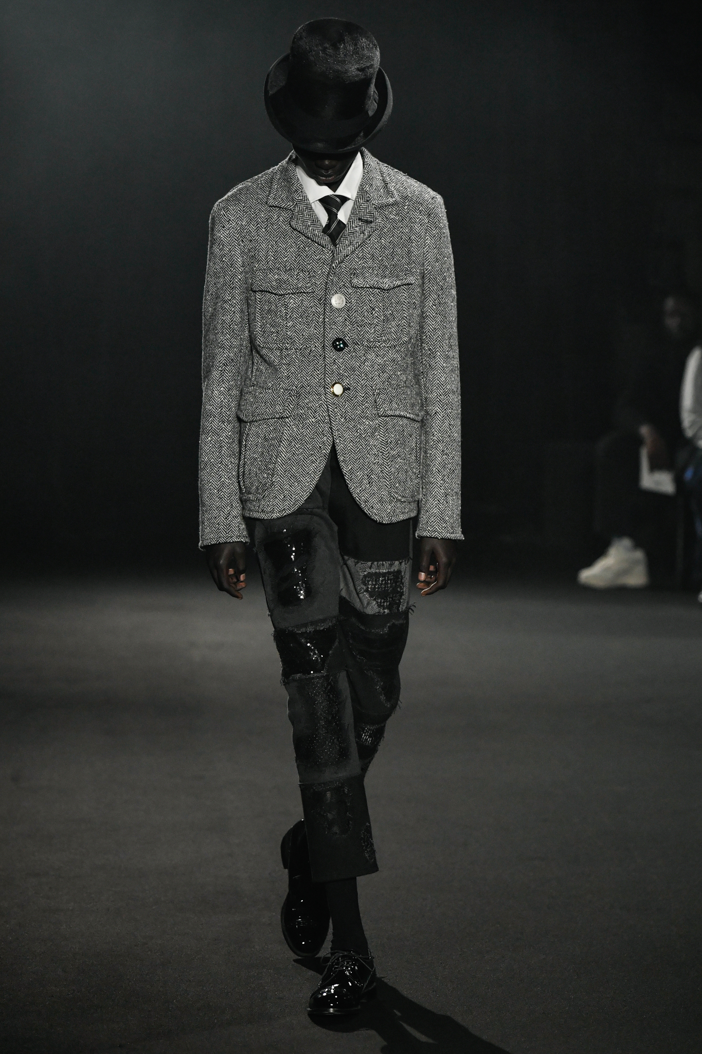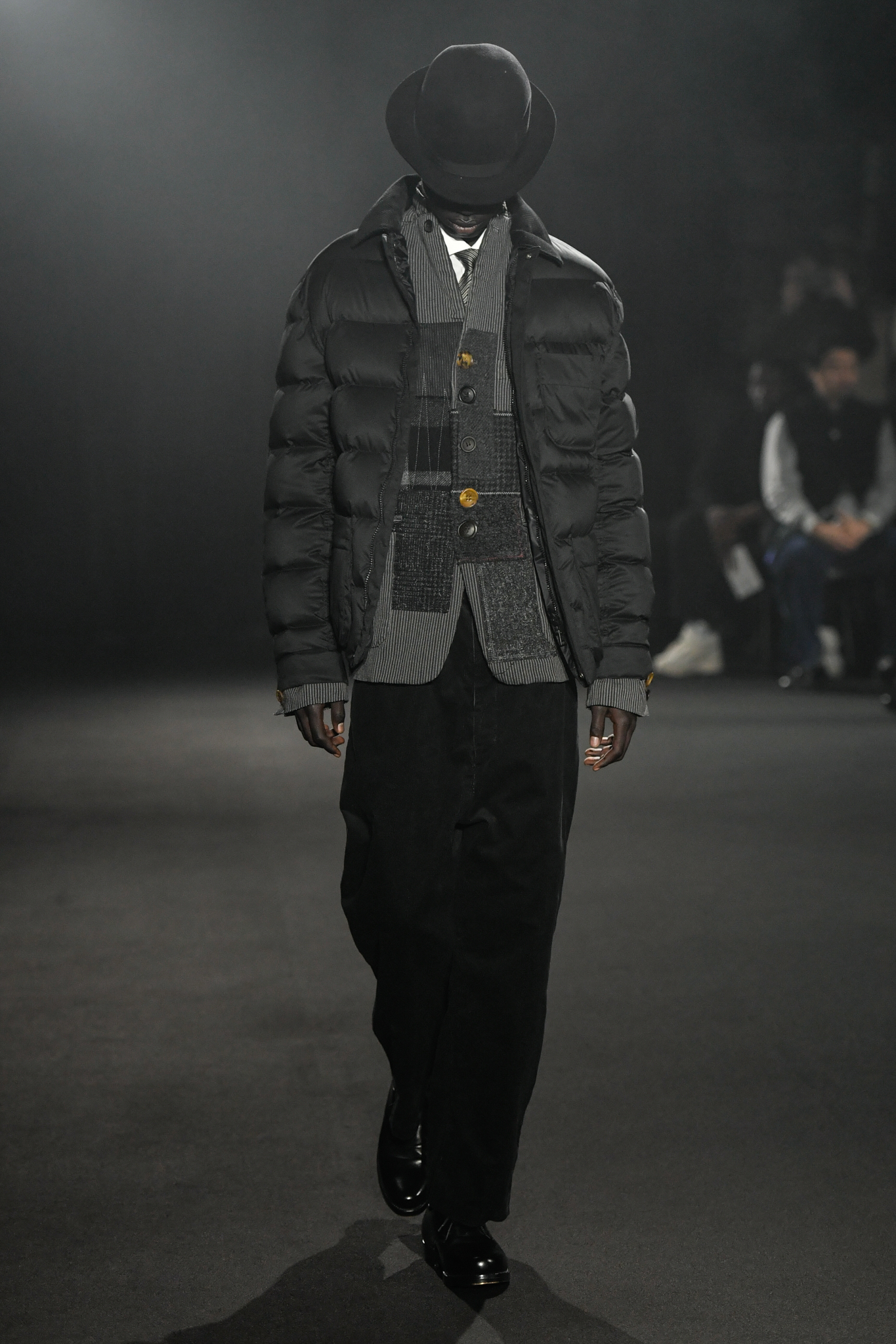 渡边淳弥在其 Junya Watanabe MAN 2026 秋冬系列中,将巴黎街头化为 1950 年代的浪漫布景,以咖啡馆座椅取代传统秀场,呈现一场亲密如街坊聚会的发布。系列聚焦 1958 至 1962 年的风格「黄金年代」,重塑常春藤联盟的经典轮廓——海军蓝西装、卡其裤与扣领衬衫,并注入次文化气息。亮点包括与 Stüssy 的合作,将品牌标志性 8-ball 与皇冠图案绣入学院剪裁;与 Levi’s®、Spiewak 的拼布联名则赋予单品工业质感;全新 New Balance 联名鞋款更模糊了运动鞋与牛津鞋的界限。透过融合传统正装线条、街头叛逆精神与粗犷工装质地,渡边再次诠释了经典在解构中重生的风格叙事。
