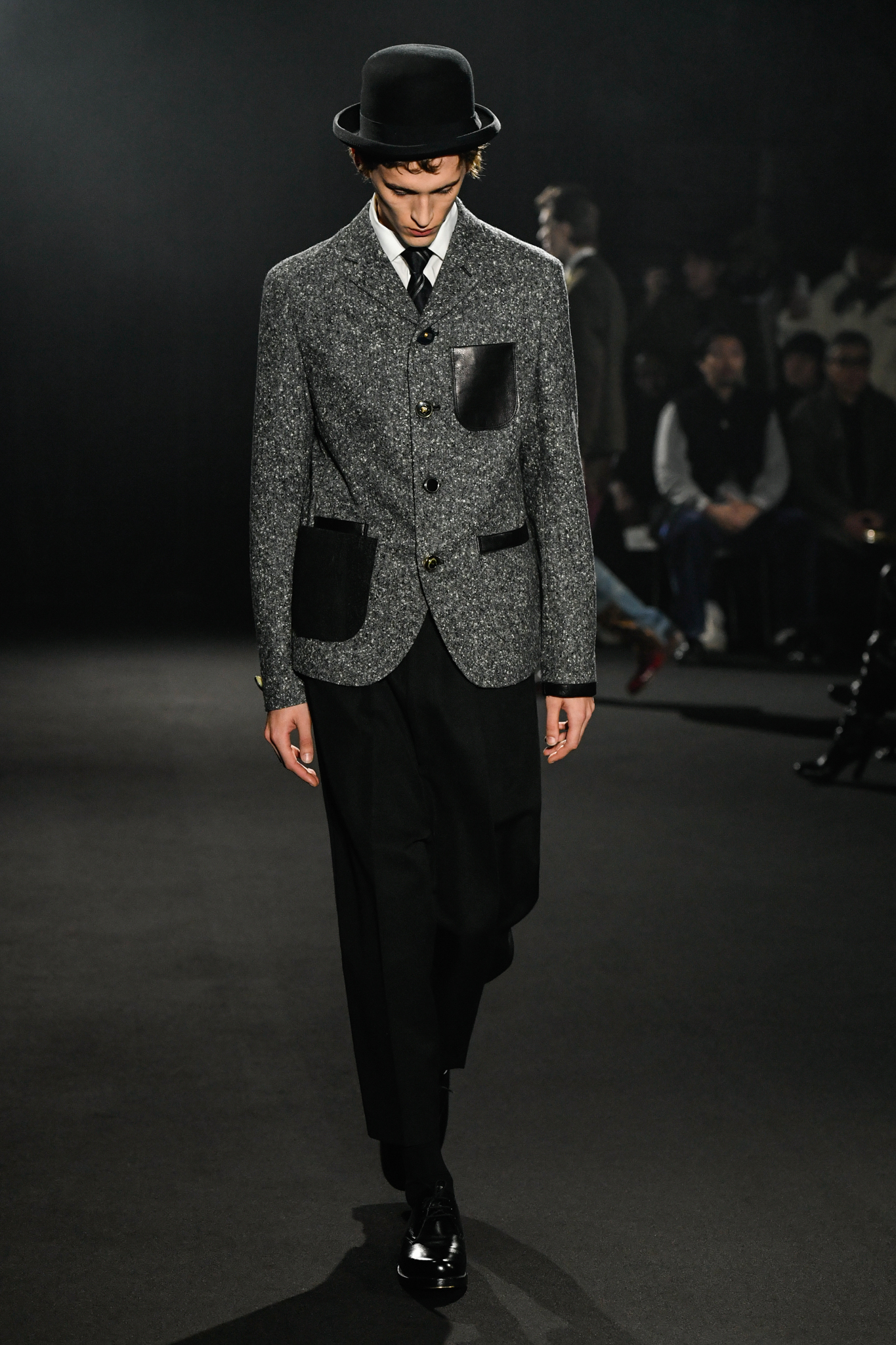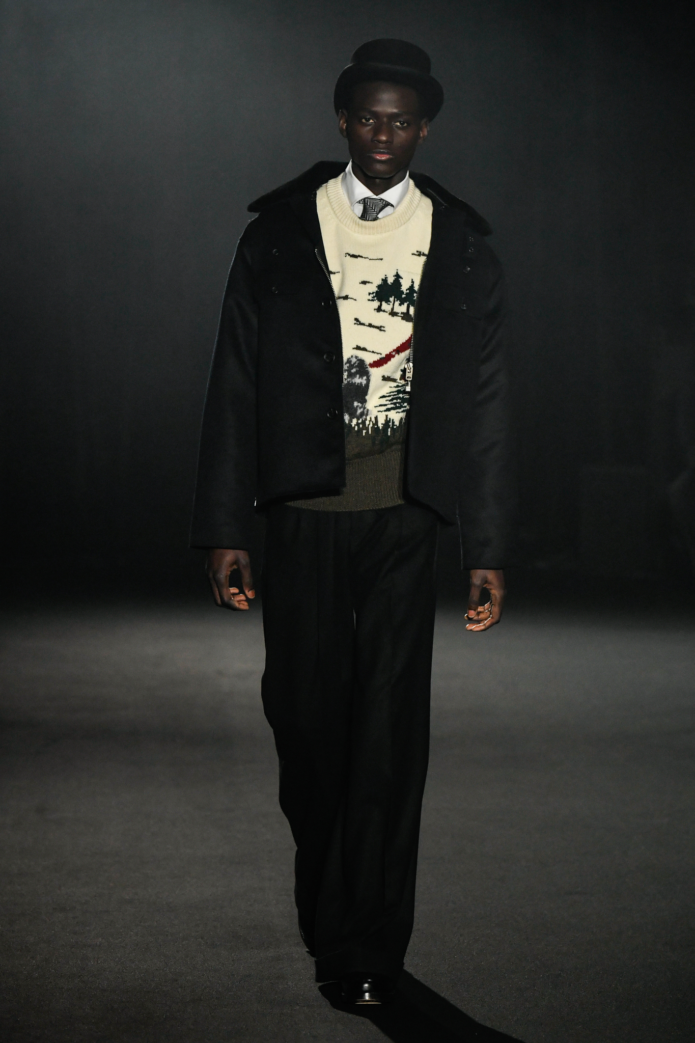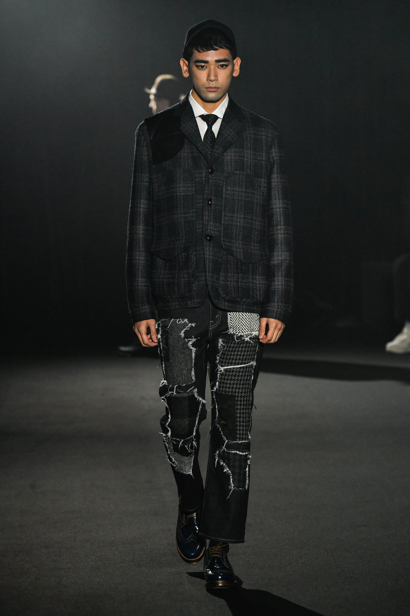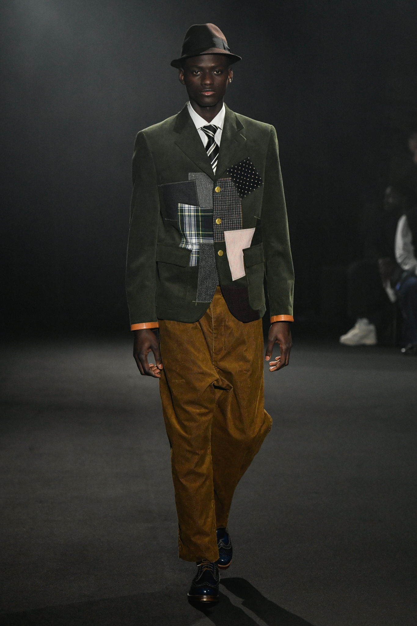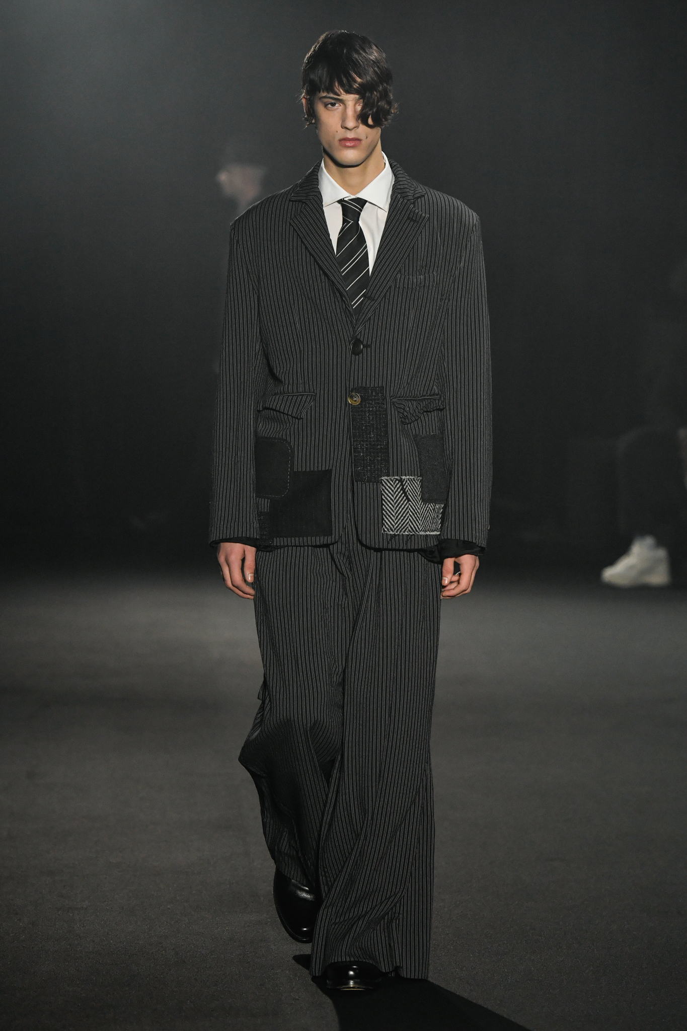 渡边淳弥在其 Junya Watanabe MAN 2026 秋冬系列中,将巴黎街头化为 1950 年代的浪漫布景,以咖啡馆座椅取代传统秀场,呈现一场亲密如街坊聚会的发布。系列聚焦 1958 至 1962 年的风格「黄金年代」,重塑常春藤联盟的经典轮廓——海军蓝西装、卡其裤与扣领衬衫,并注入次文化气息。亮点包括与 Stüssy 的合作,将品牌标志性 8-ball 与皇冠图案绣入学院剪裁;与 Levi’s®、Spiewak 的拼布联名则赋予单品工业质感;全新 New Balance 联名鞋款更模糊了运动鞋与牛津鞋的界限。透过融合传统正装线条、街头叛逆精神与粗犷工装质地,渡边再次诠释了经典在解构中重生的风格叙事。