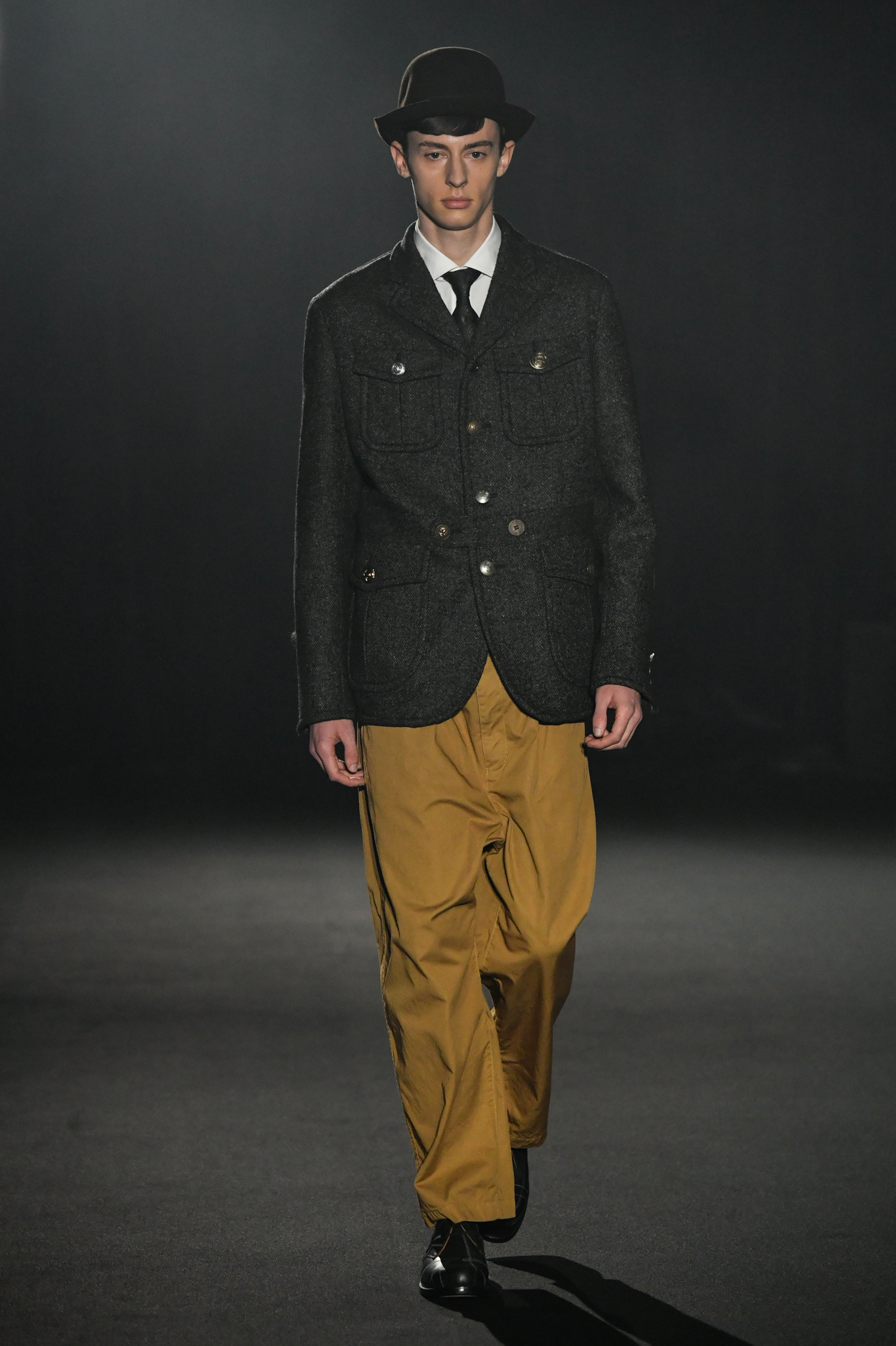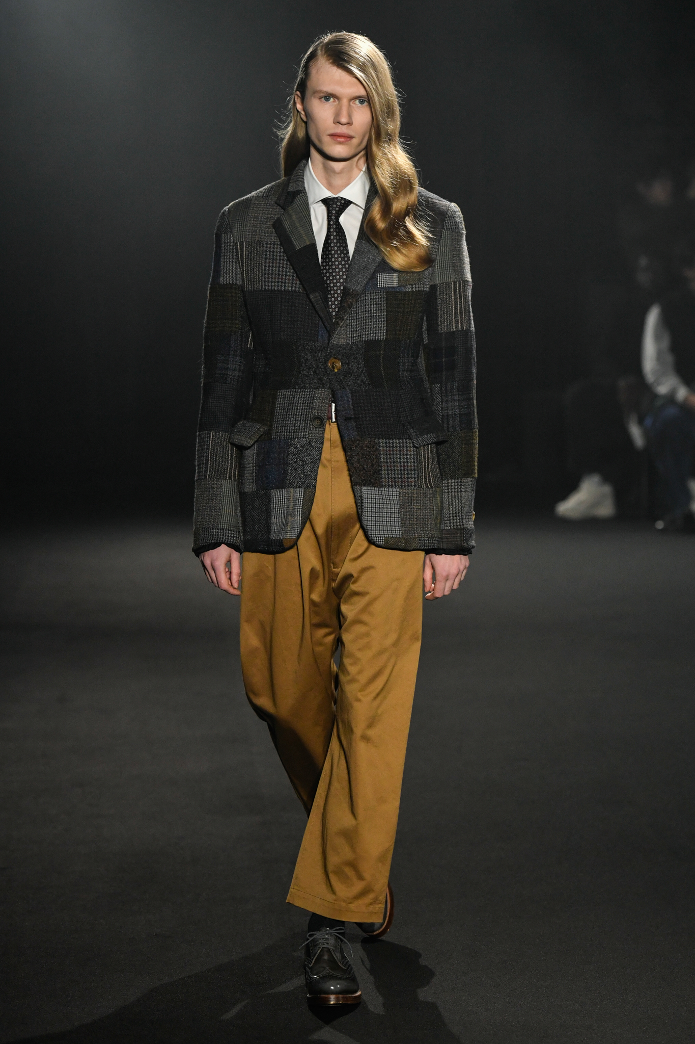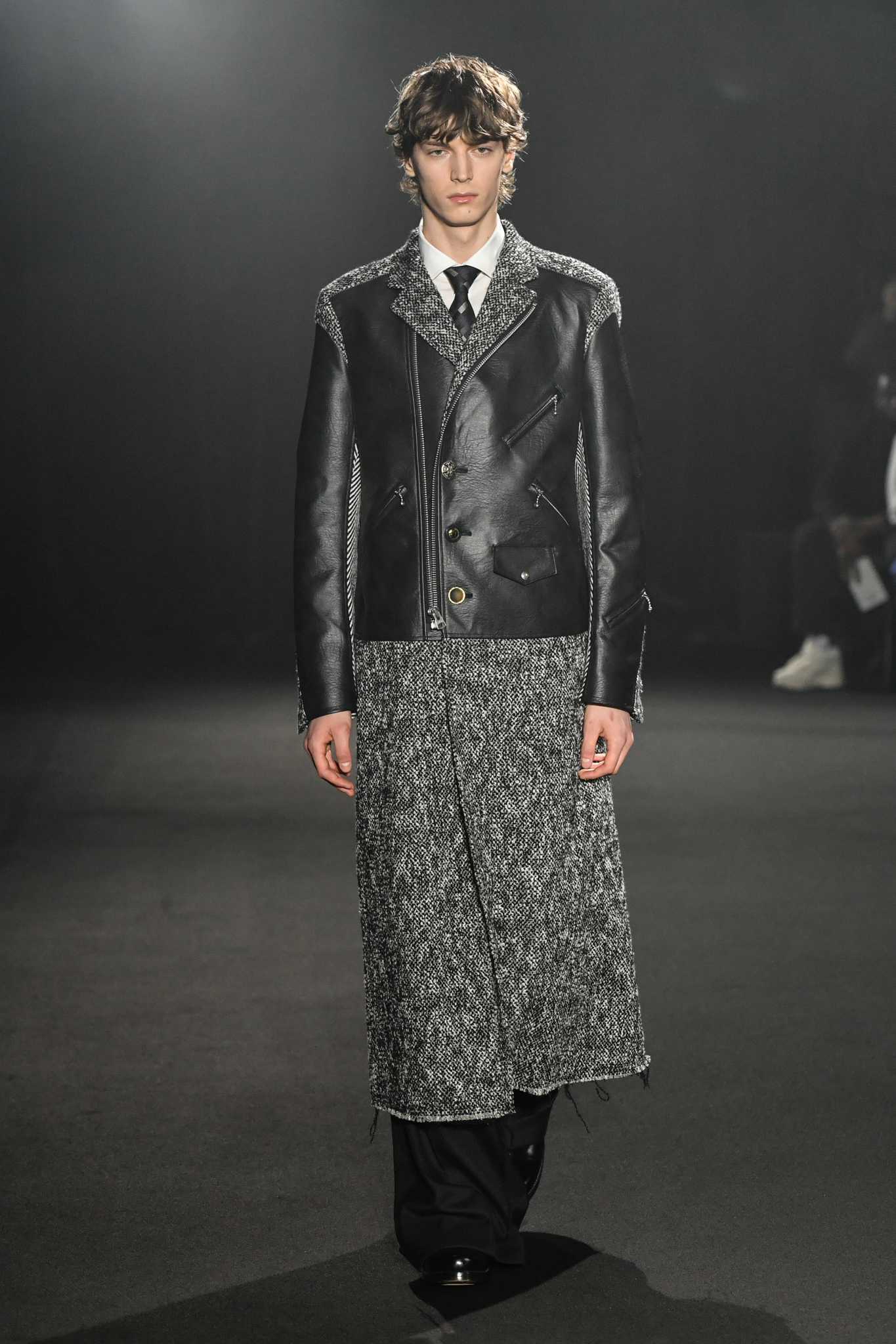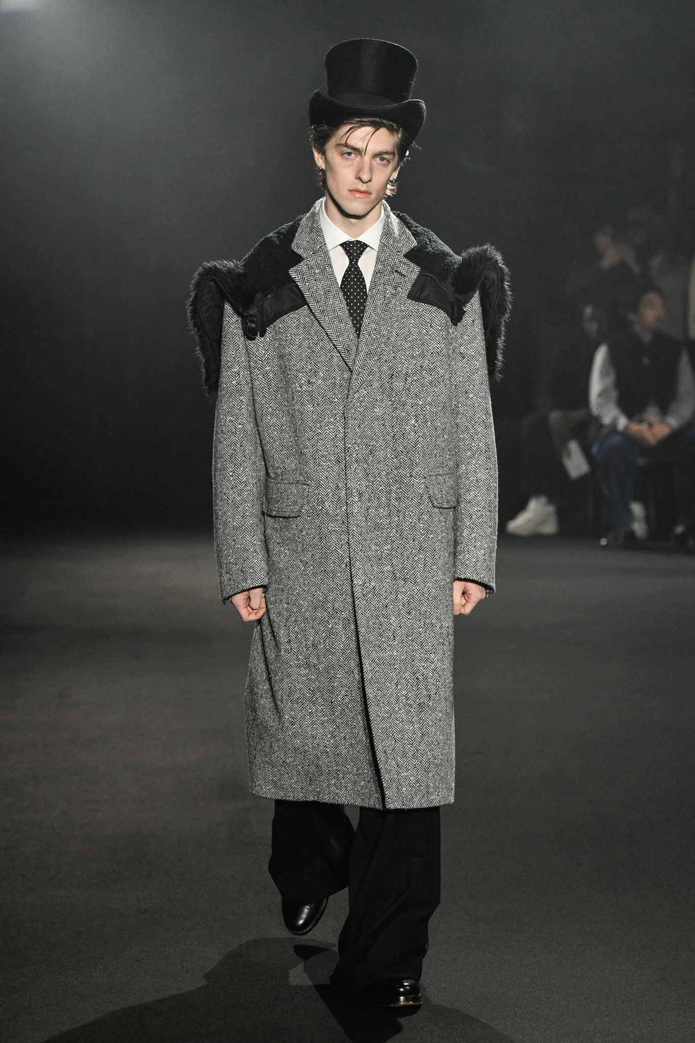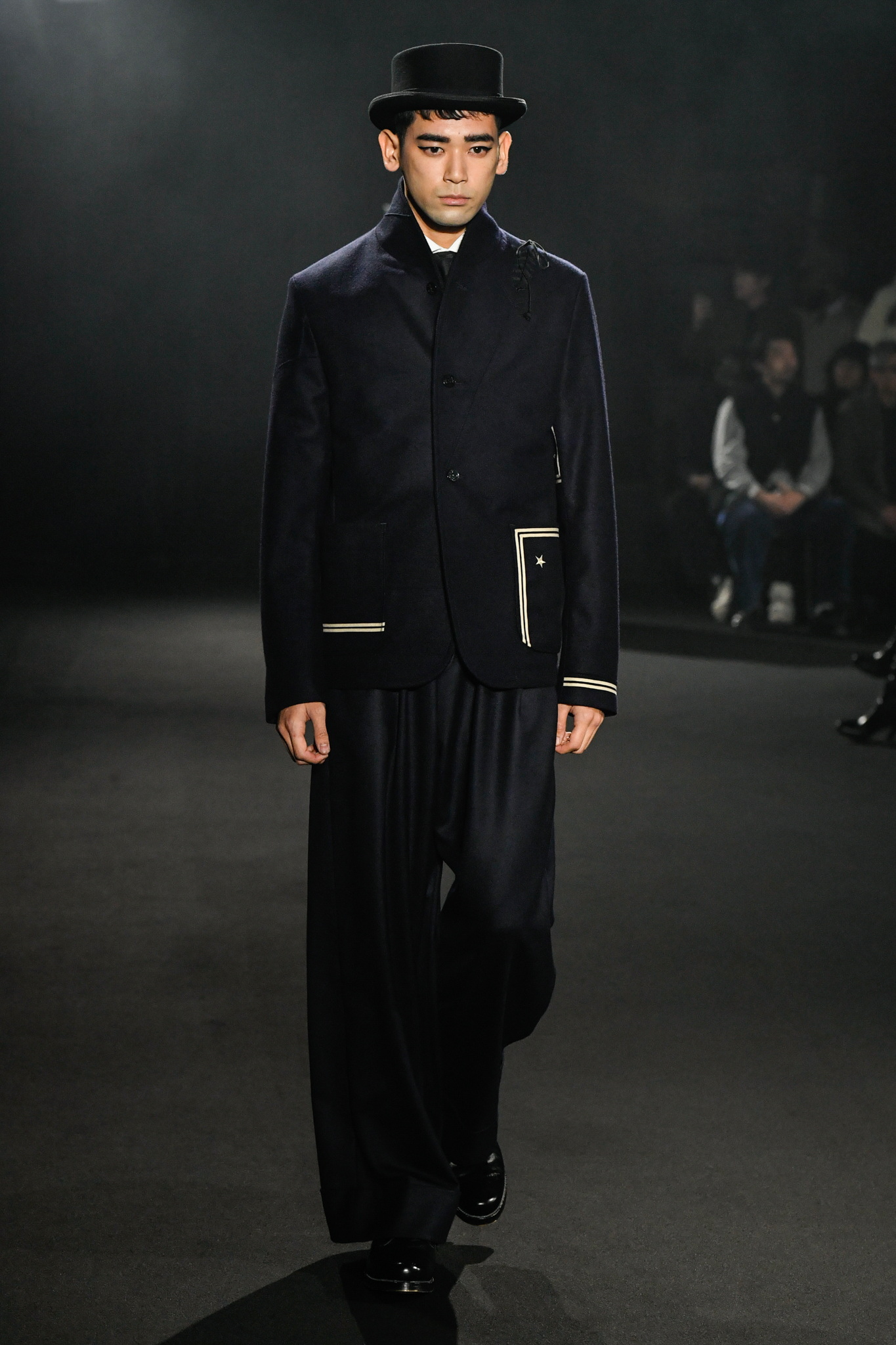 渡边淳弥在其 Junya Watanabe MAN 2026 秋冬系列中,将巴黎街头化为 1950 年代的浪漫布景,以咖啡馆座椅取代传统秀场,呈现一场亲密如街坊聚会的发布。系列聚焦 1958 至 1962 年的风格「黄金年代」,重塑常春藤联盟的经典轮廓——海军蓝西装、卡其裤与扣领衬衫,并注入次文化气息。亮点包括与 Stüssy 的合作,将品牌标志性 8-ball 与皇冠图案绣入学院剪裁;与 Levi’s®、Spiewak 的拼布联名则赋予单品工业质感;全新 New Balance 联名鞋款更模糊了运动鞋与牛津鞋的界限。透过融合传统正装线条、街头叛逆精神与粗犷工装质地,渡边再次诠释了经典在解构中重生的风格叙事。