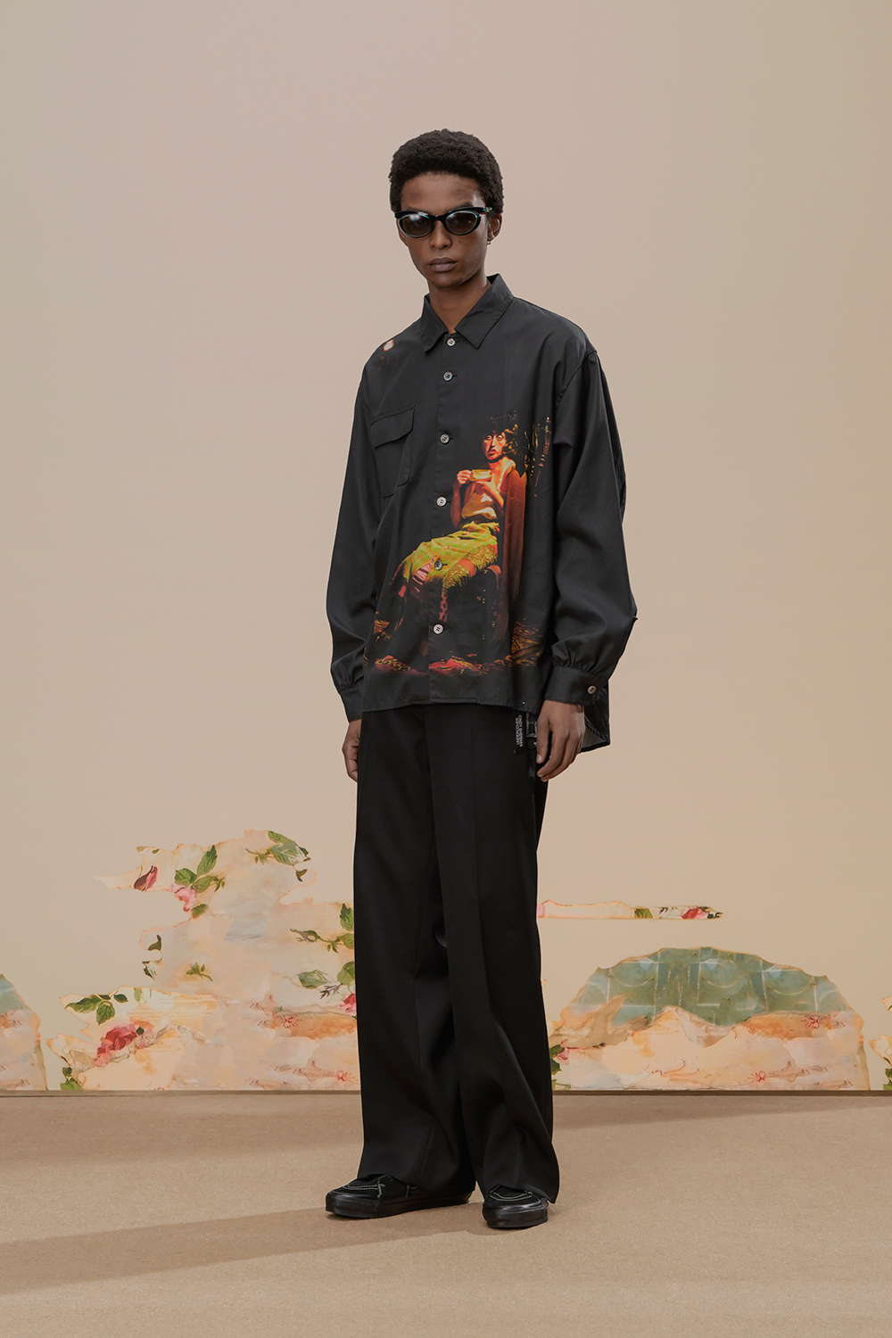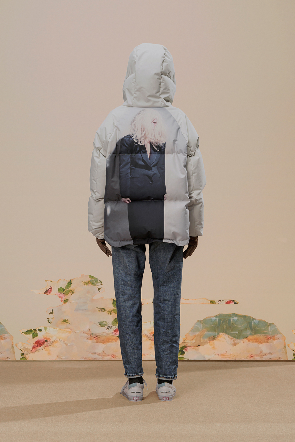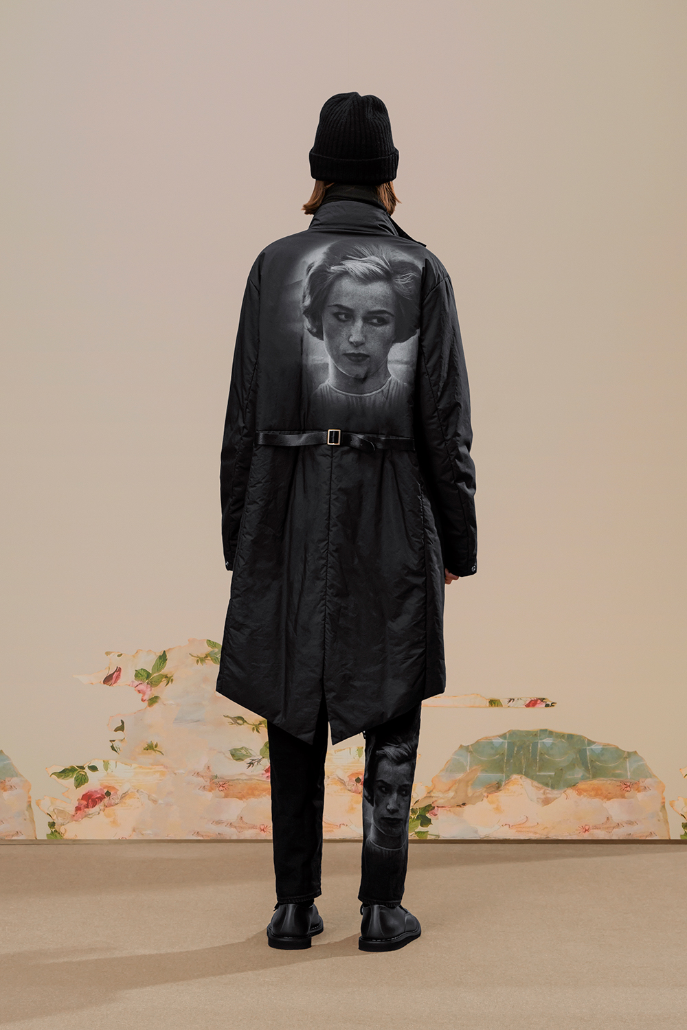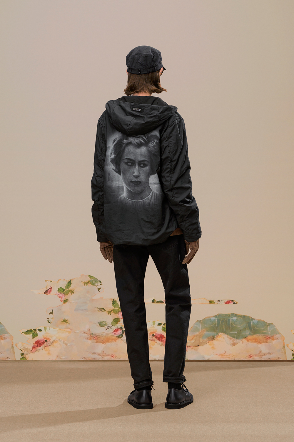 本季,高桥盾将著名摄影师 Cindy Sherman 独特的自画像转化为印花和提花贴片, 用于 UNDERCOVER 的外套、系带鞋,甚至运动鞋上。他把富有视觉冲击力的 Cindy Sherman 抽烟肖像印于深色修身夹克或厚实的红色或肉桂色毛衣的肘部,并把她一头金发被风吹拂的形象印在了丝绸衬衫、运动衫和羽绒服上。