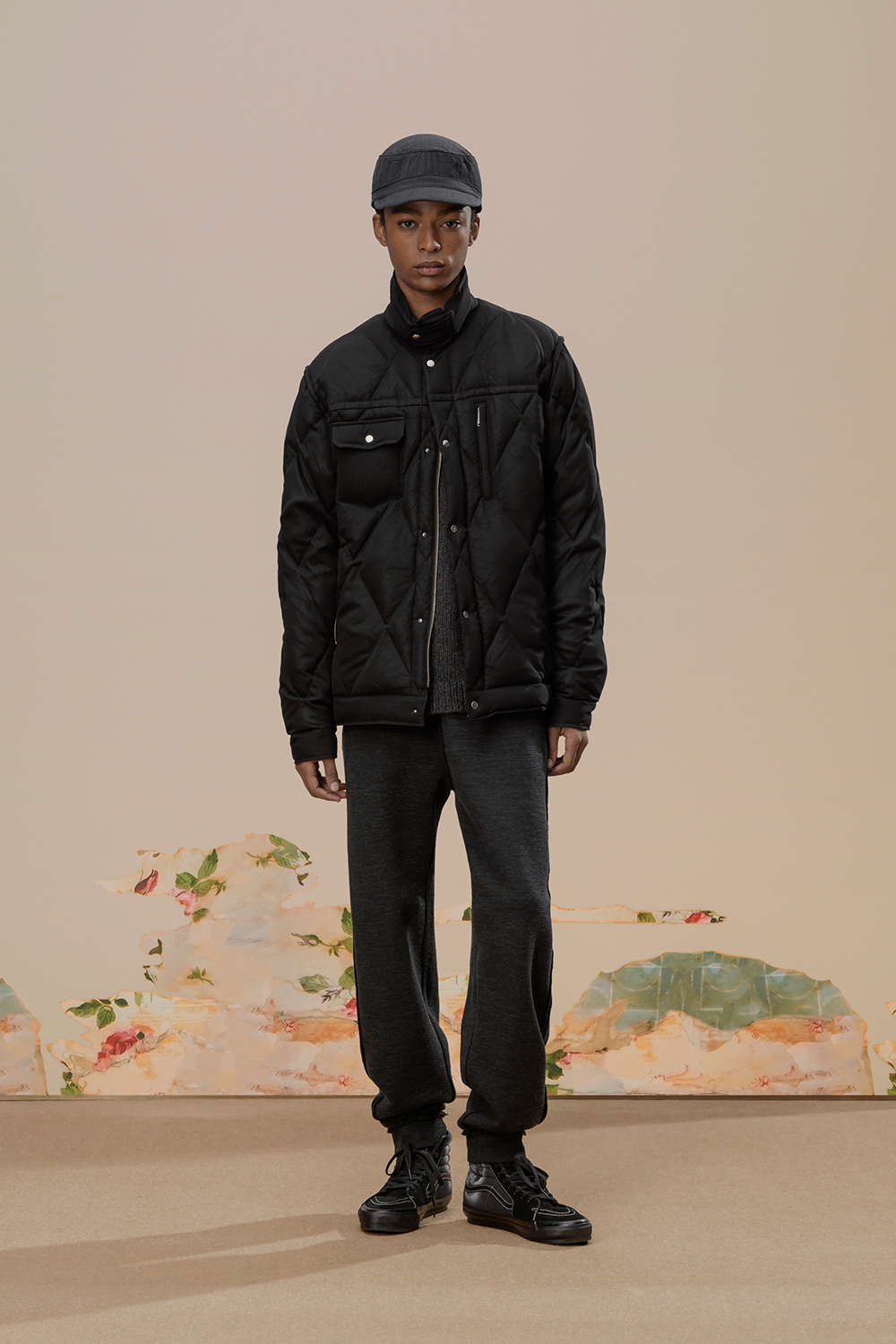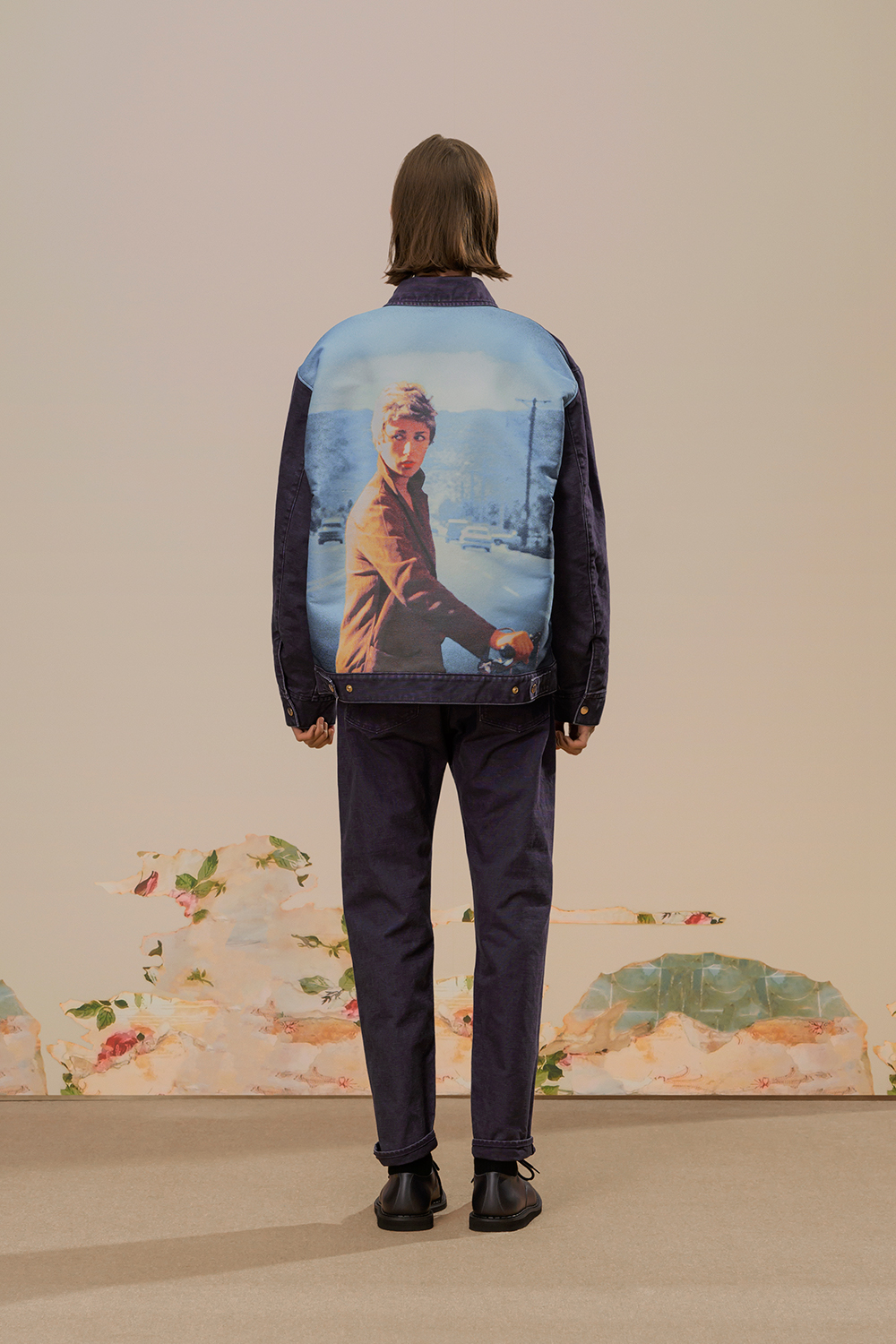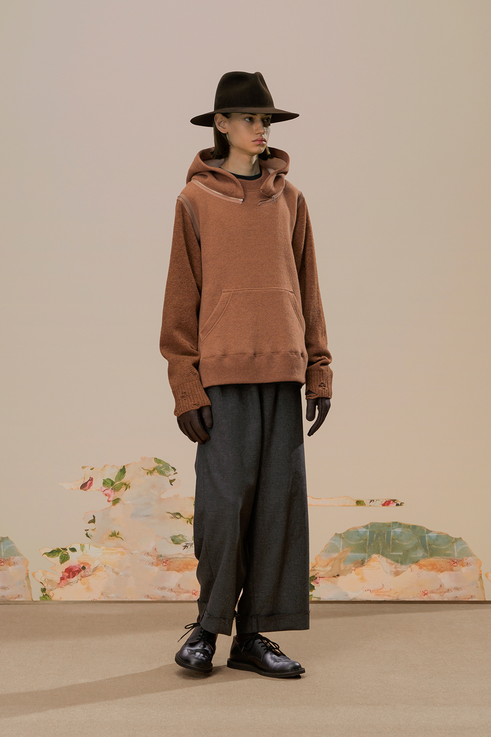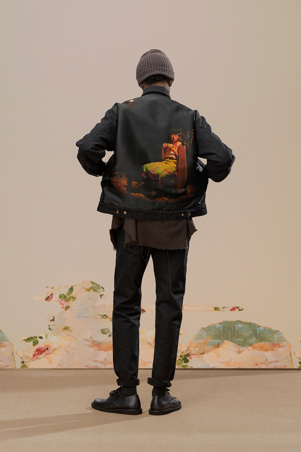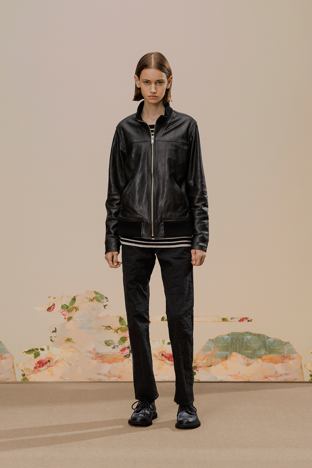 本季,高桥盾将著名摄影师 Cindy Sherman 独特的自画像转化为印花和提花贴片, 用于 UNDERCOVER 的外套、系带鞋,甚至运动鞋上。他把富有视觉冲击力的 Cindy Sherman 抽烟肖像印于深色修身夹克或厚实的红色或肉桂色毛衣的肘部,并把她一头金发被风吹拂的形象印在了丝绸衬衫、运动衫和羽绒服上。