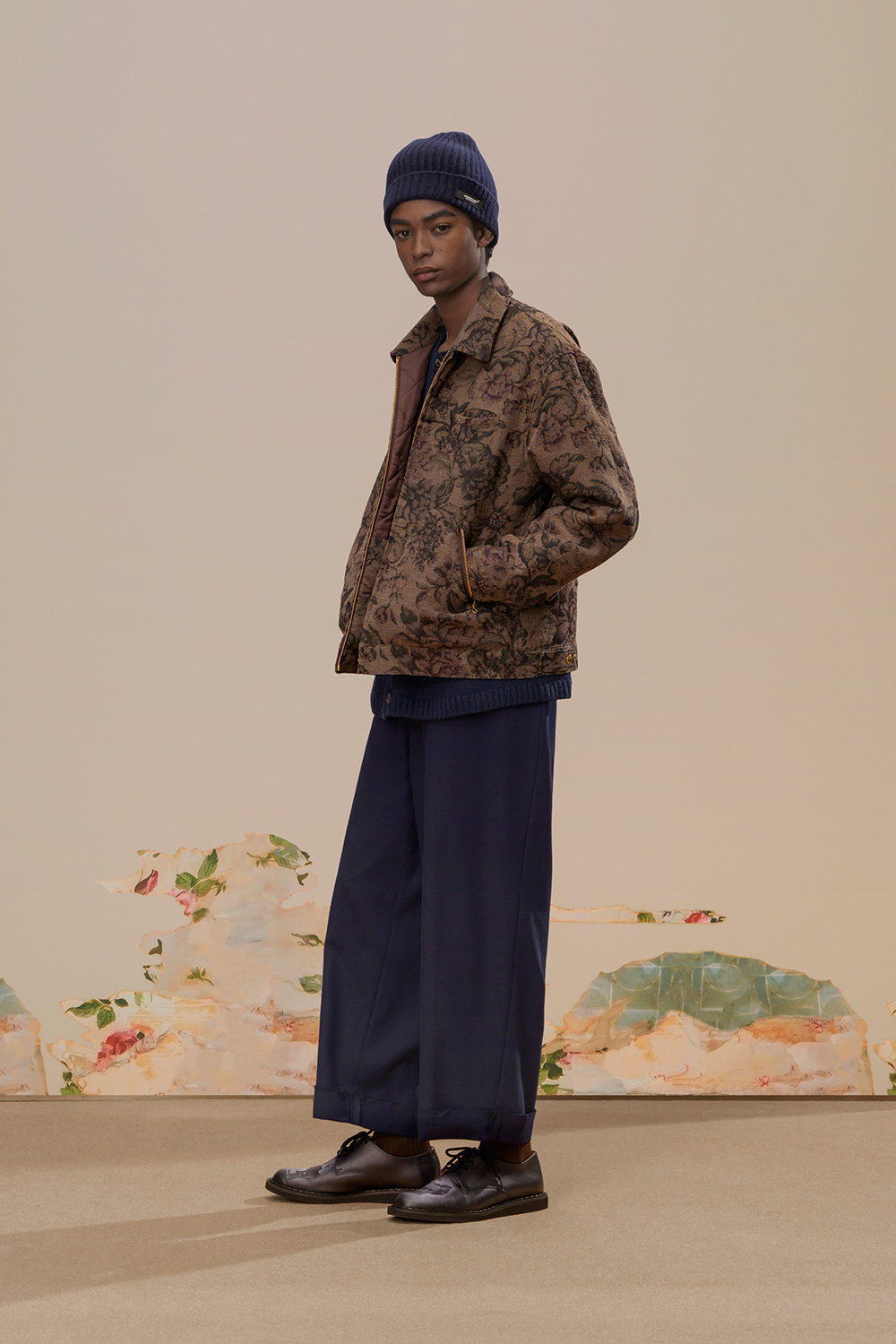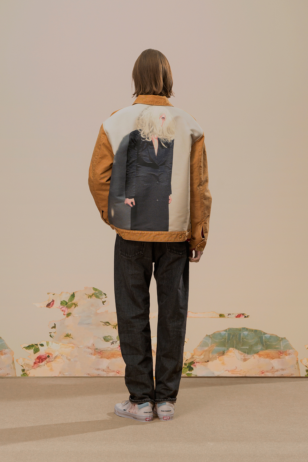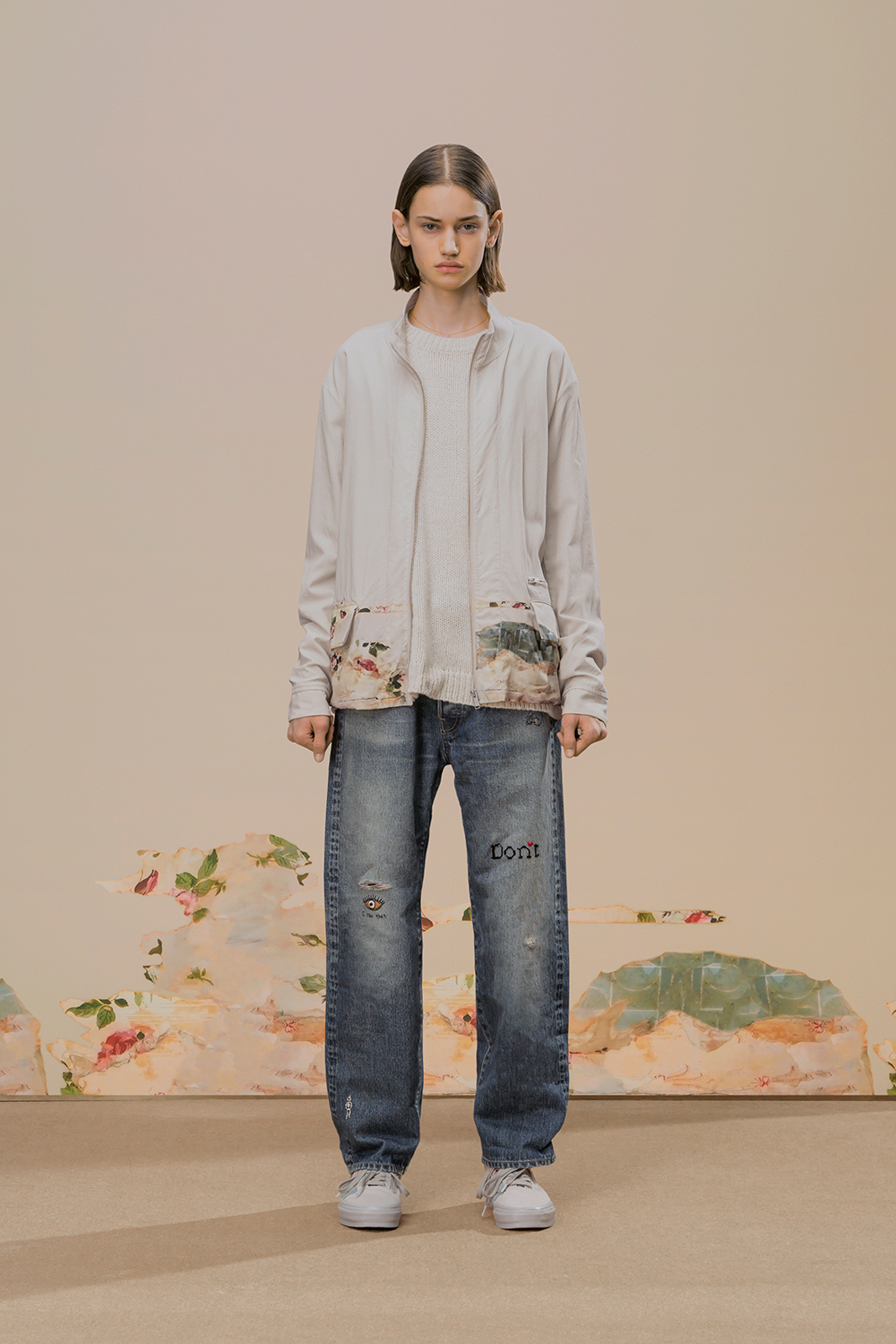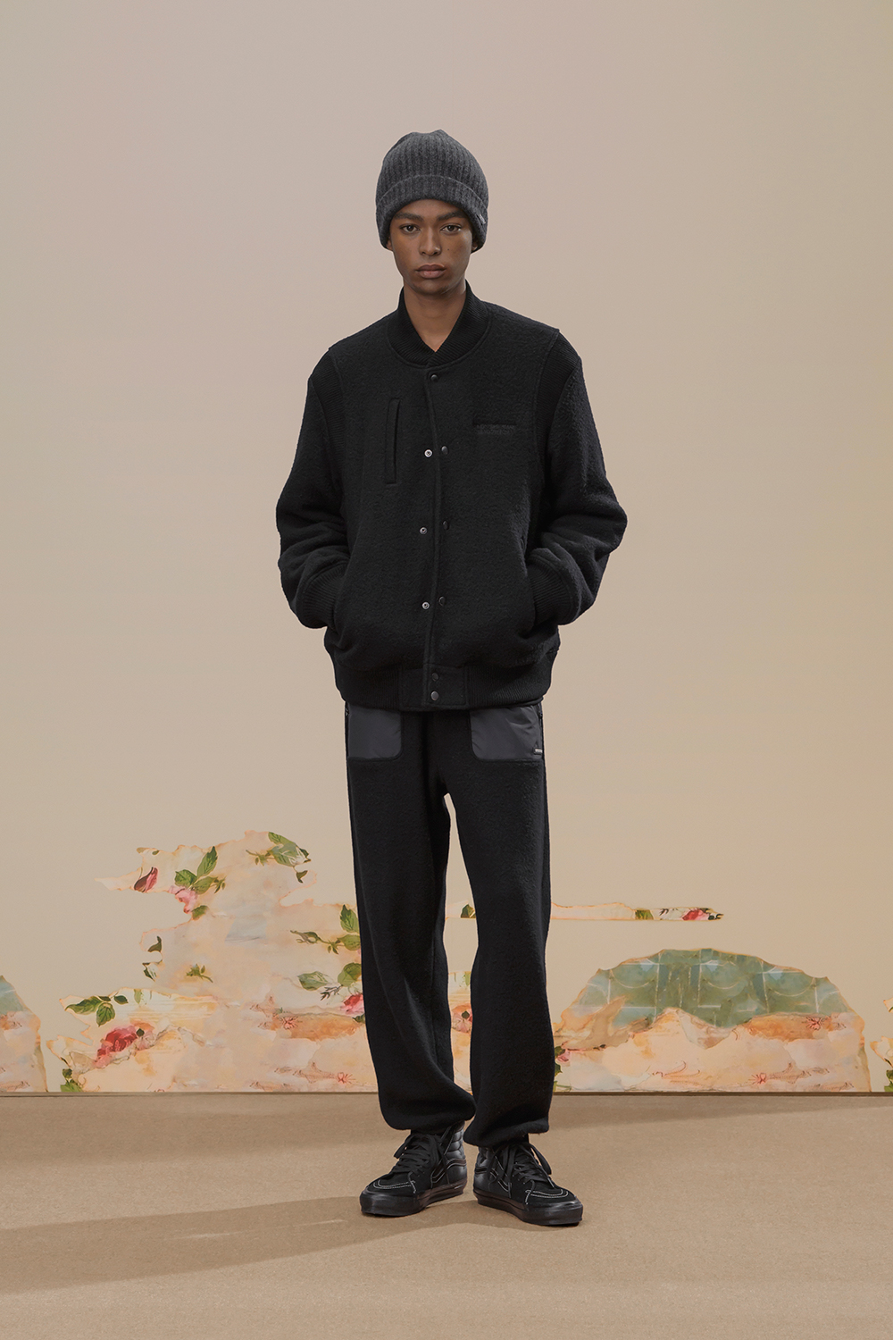 本季,高桥盾将著名摄影师 Cindy Sherman 独特的自画像转化为印花和提花贴片, 用于 UNDERCOVER 的外套、系带鞋,甚至运动鞋上。他把富有视觉冲击力的 Cindy Sherman 抽烟肖像印于深色修身夹克或厚实的红色或肉桂色毛衣的肘部,并把她一头金发被风吹拂的形象印在了丝绸衬衫、运动衫和羽绒服上。
