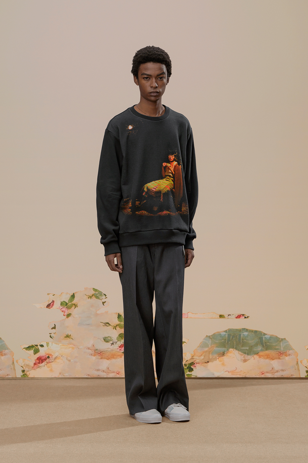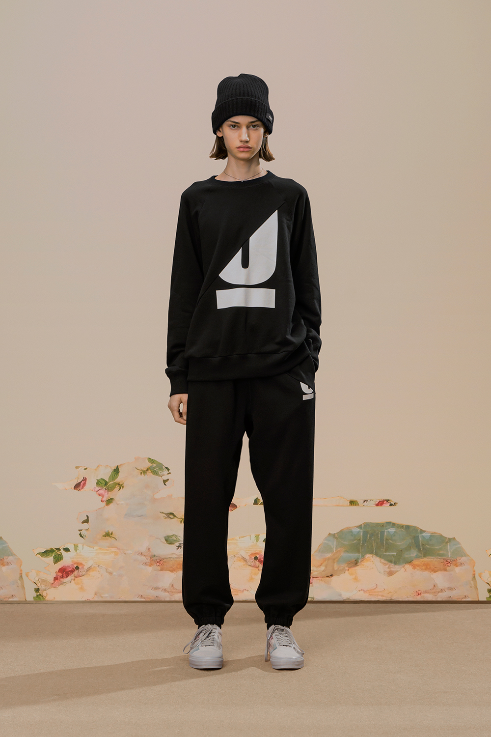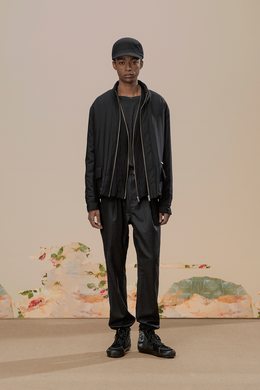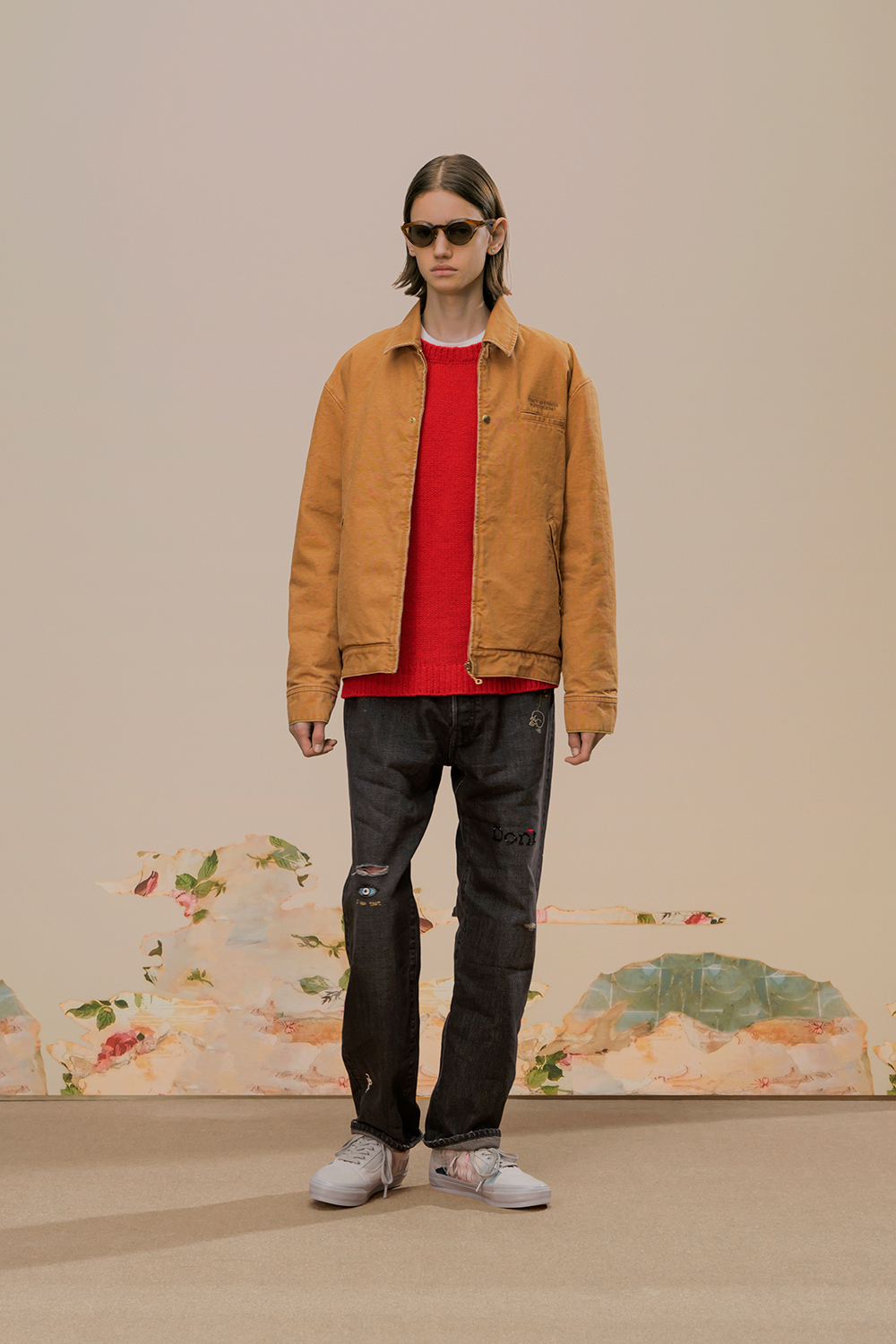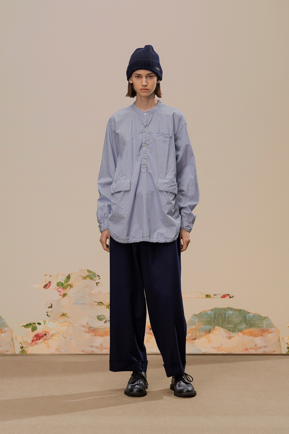 本季,高桥盾将著名摄影师 Cindy Sherman 独特的自画像转化为印花和提花贴片, 用于 UNDERCOVER 的外套、系带鞋,甚至运动鞋上。他把富有视觉冲击力的 Cindy Sherman 抽烟肖像印于深色修身夹克或厚实的红色或肉桂色毛衣的肘部,并把她一头金发被风吹拂的形象印在了丝绸衬衫、运动衫和羽绒服上。