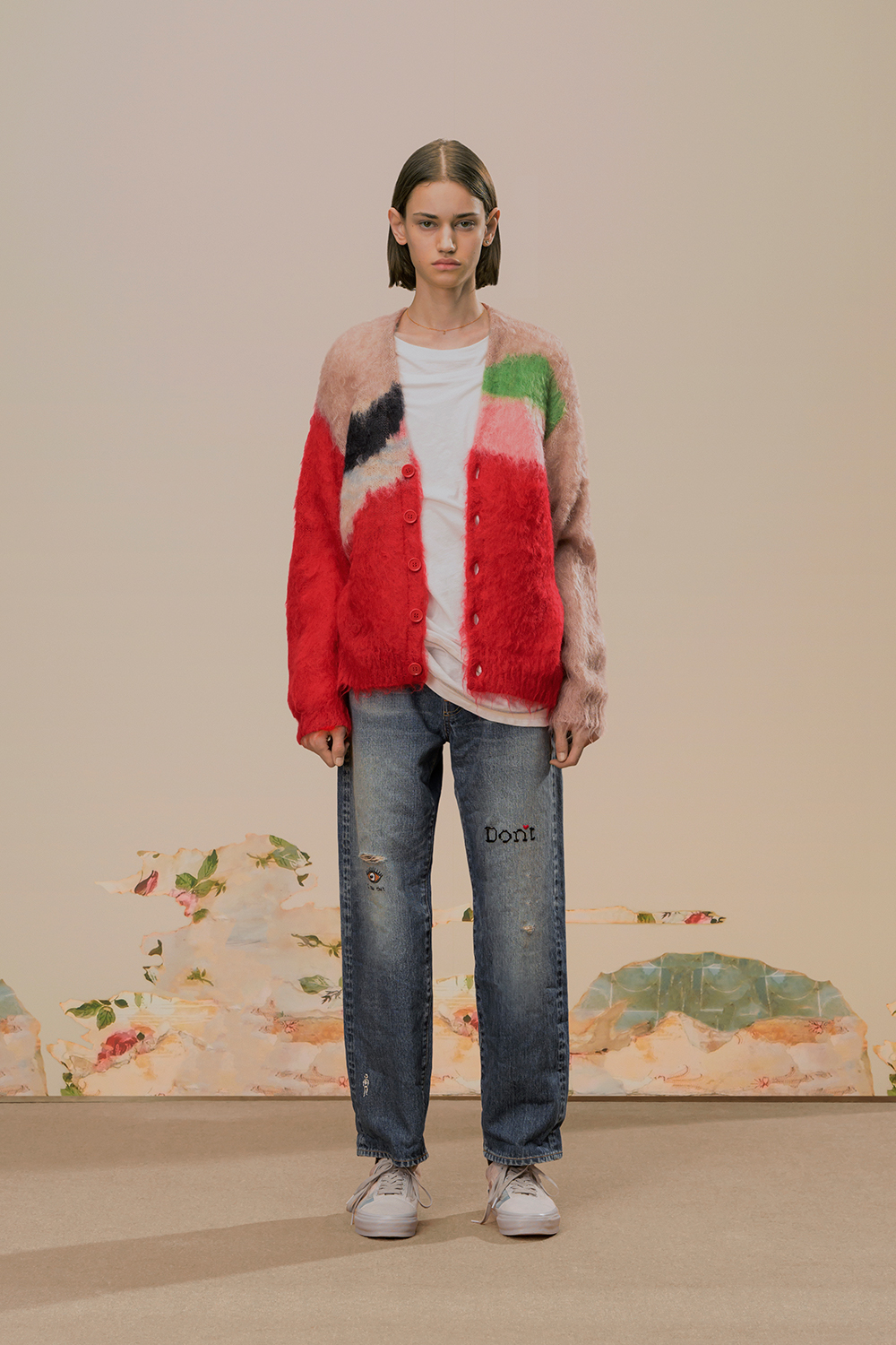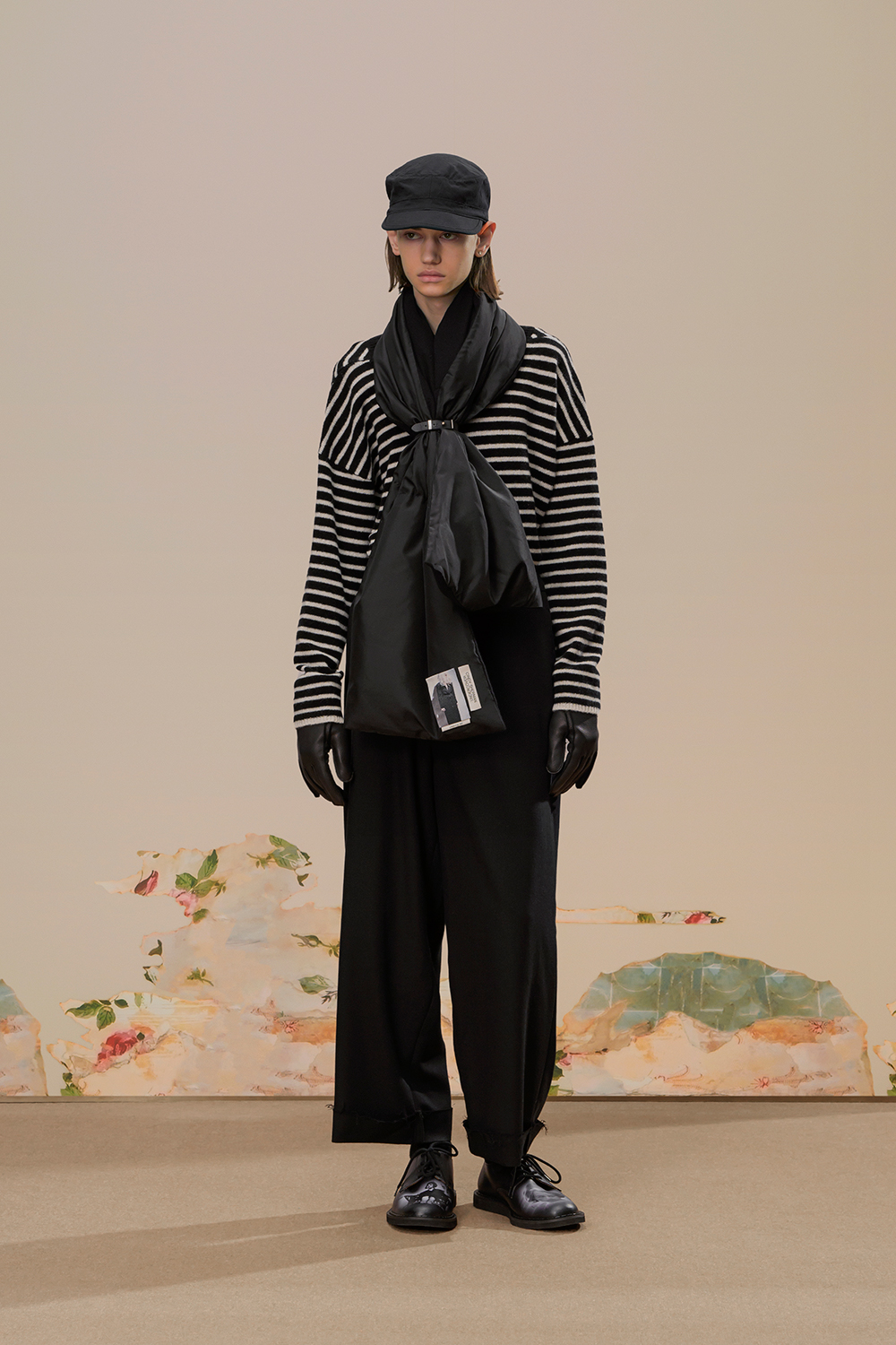 该系列中有些单品可以变换造型——例如一件超大号拉链针织衫的袖子和帽子都可以拆卸,另一些款式则层次丰富,别具匠心。一件长款轻盈的羊绒衫在正面饰以拉链设计,让人难以分辨它究竟是外套、毛衣还是盖毯。部分饰有 Cindy Sherman 贴布的双面羊绒或真丝围巾则可以兼作披肩。