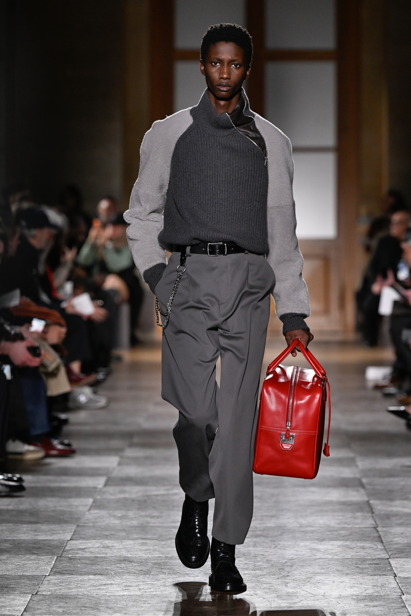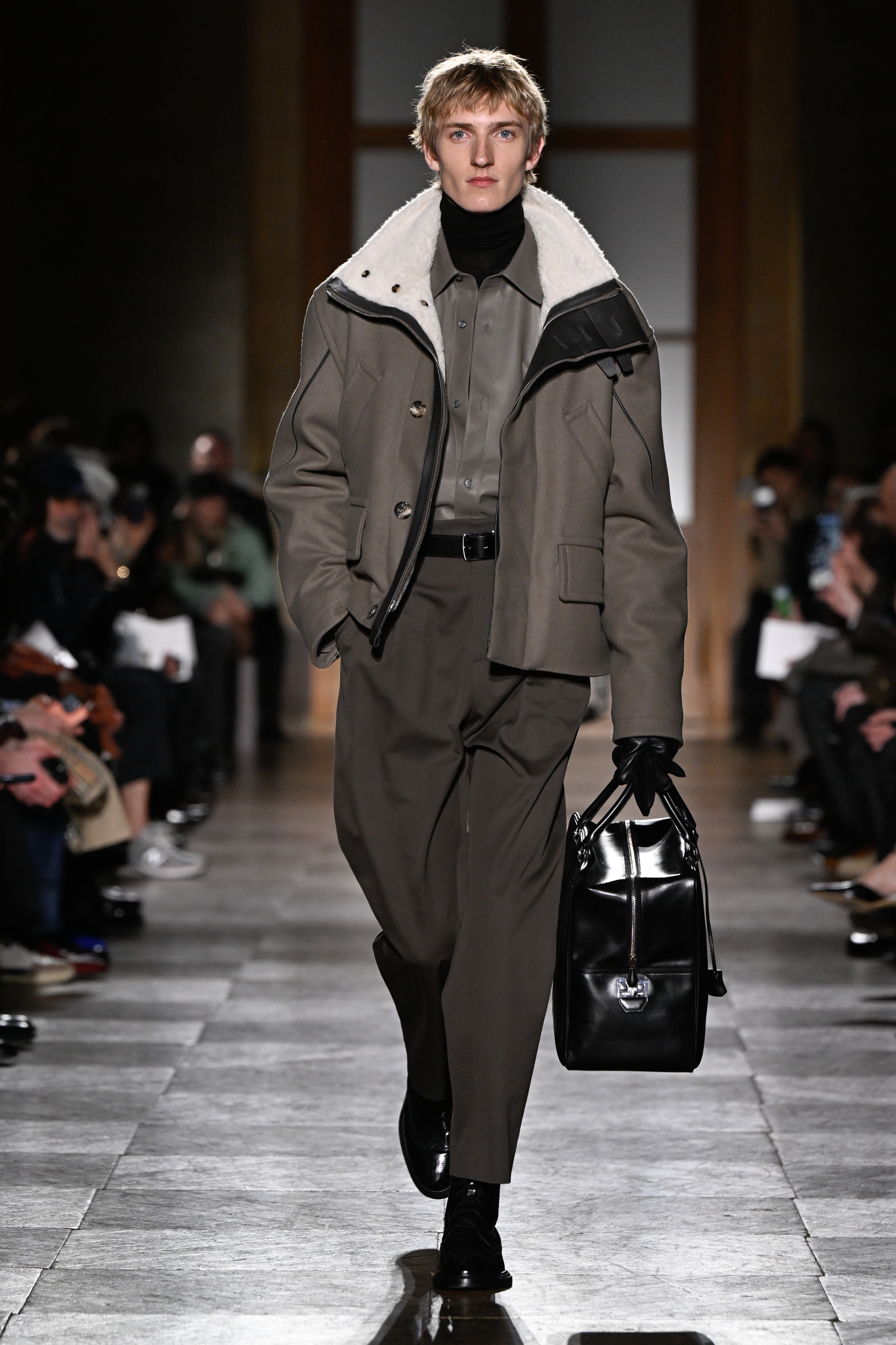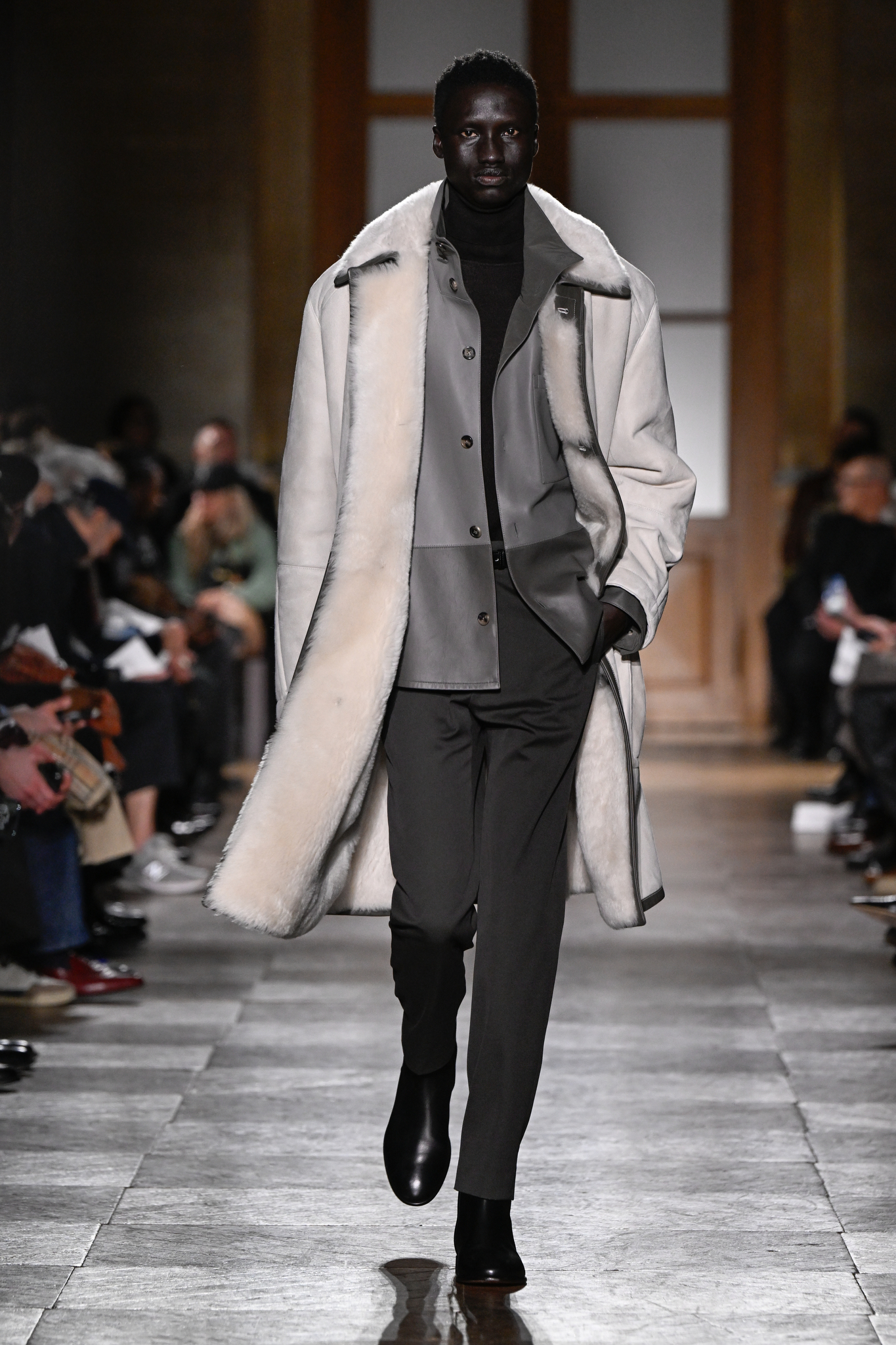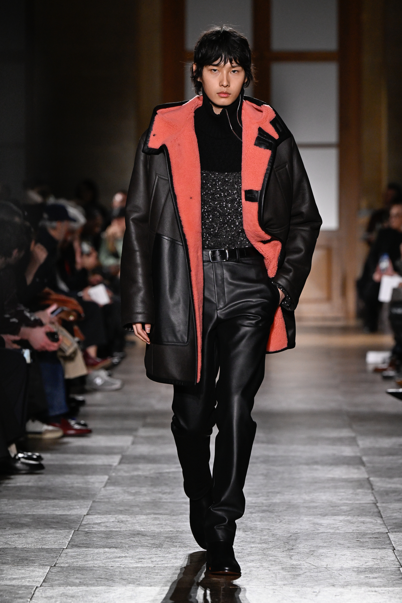 爱马仕 2026 秋冬男装系列作为 Véronique Nichanian 执掌 37 年后的告别之作,以精湛剪裁与经典线条诠释永恒美学。系列延续品牌标志性的合身比例,袖长设计精准贴合手腕,无论挺括大衣、皮质夹克或针织衫,均以恰到好处的长度勾勒利落轮廓。无论是复刻自 1991 年的连体工装,还是全新的珊瑚粉羊毛皮大衣,袖部剪裁皆呼应整体造型的简洁与平衡,亦暗含 Nichanian 对「慢工细作」的坚持。这一细节亦成为其设计哲学的无声注脚——在瞬息万变的时尚中,唯有精准、经得起时间考验的剪裁,方能定义真正的奢侈。