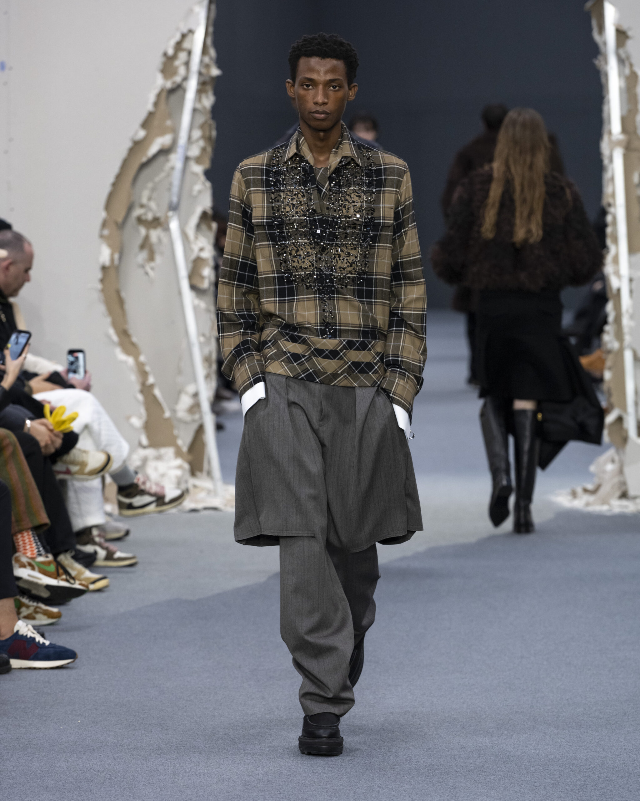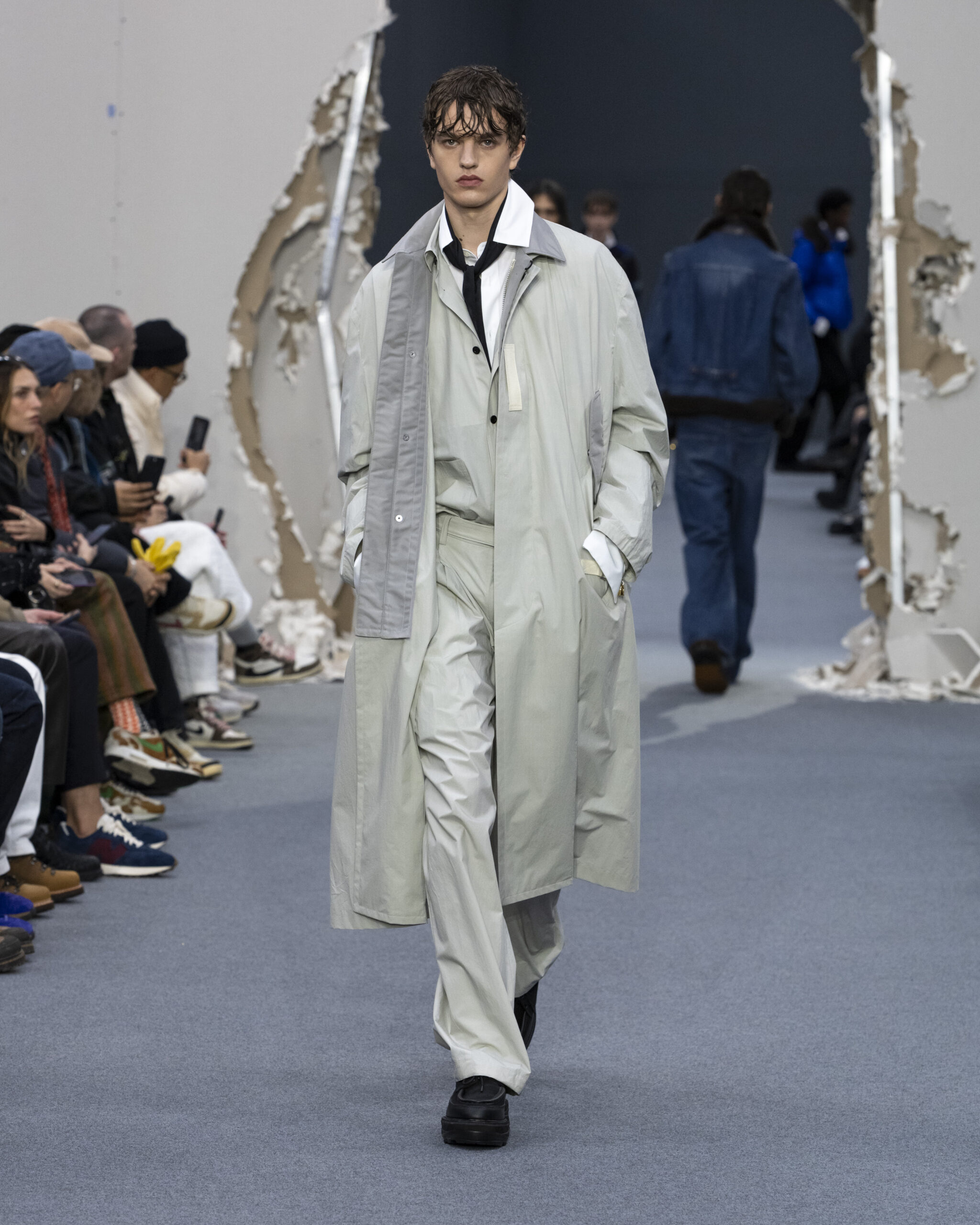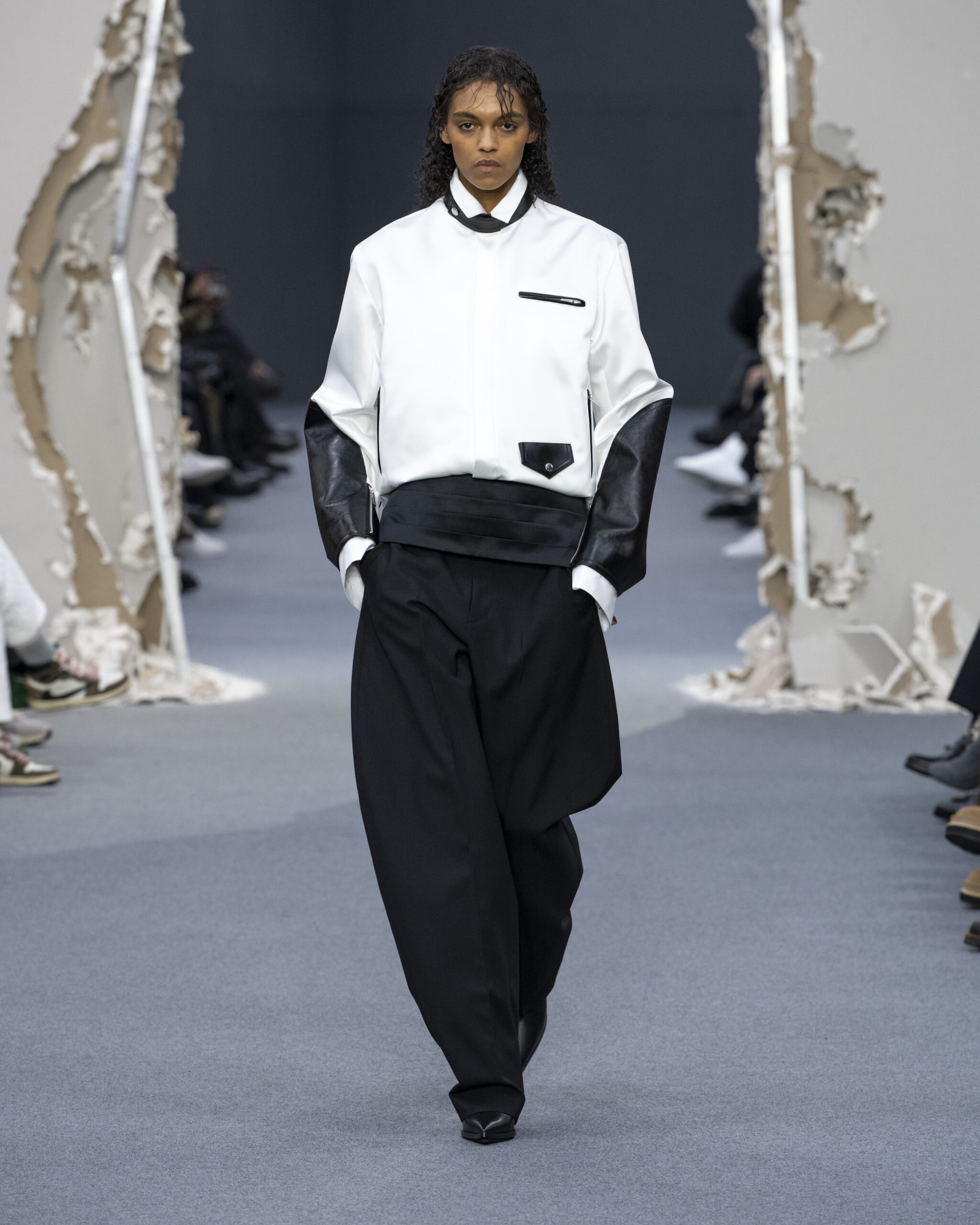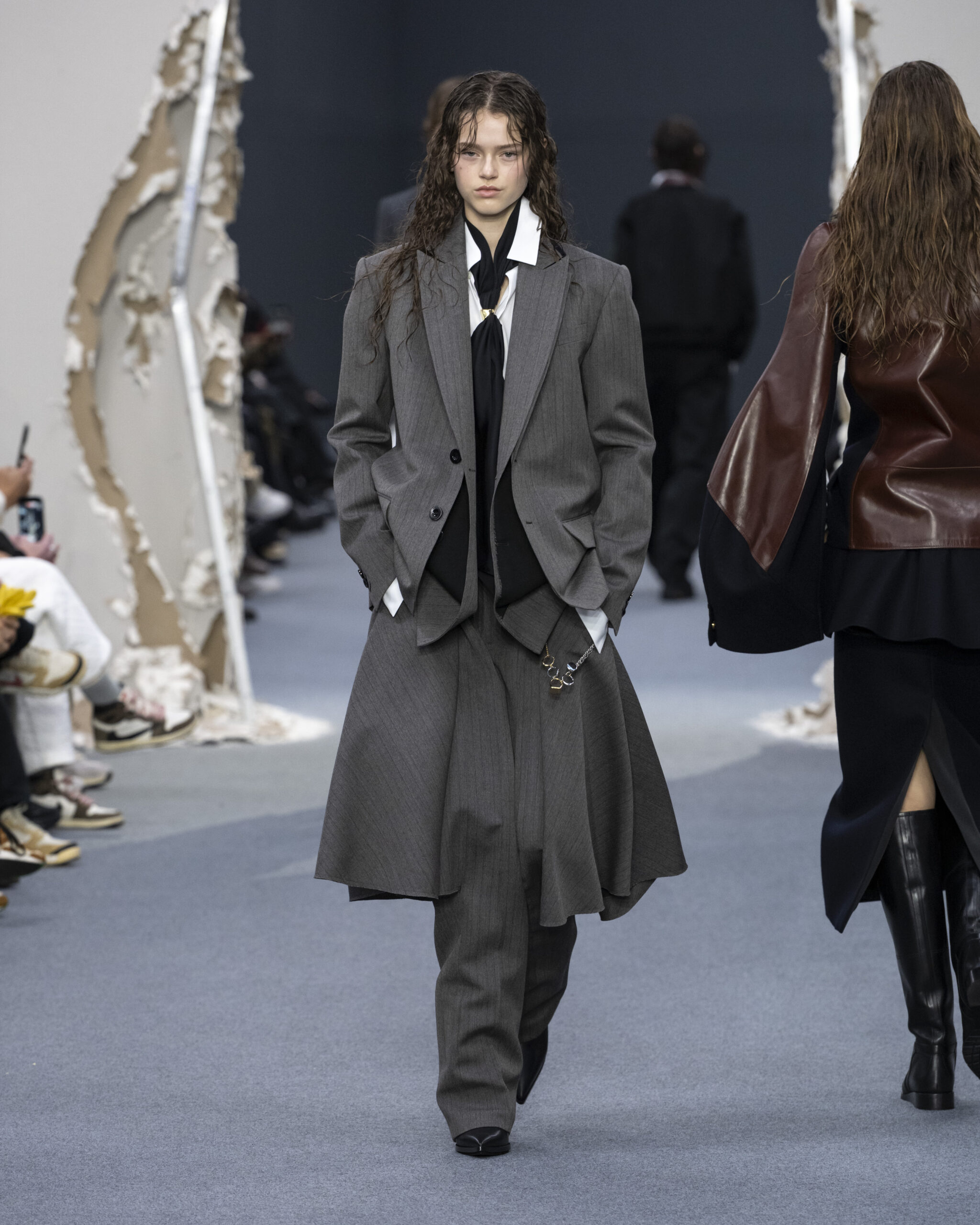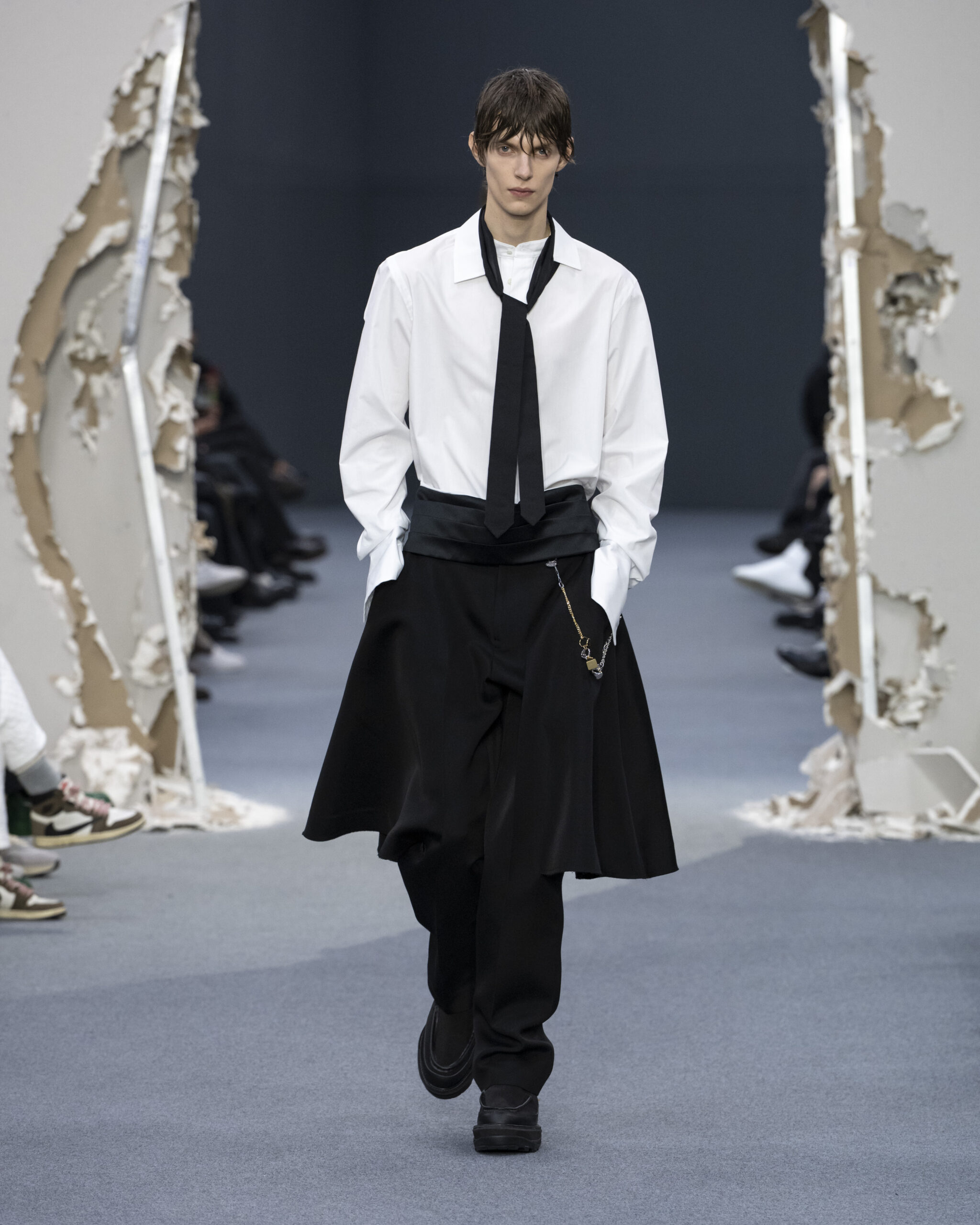 优雅的衬衫与领带成为造型焦点,丝巾般的领带不再紧系,而是轻柔环绕于领口。裙裤混搭是本季主打轮廓,通过结构巧思而非叠穿实现:先裁出阔腿裤版型,再经裁切重塑。夹克采用横向拼接工艺,下半部分与内衬相连,再以叠层实现一体化视觉效果。