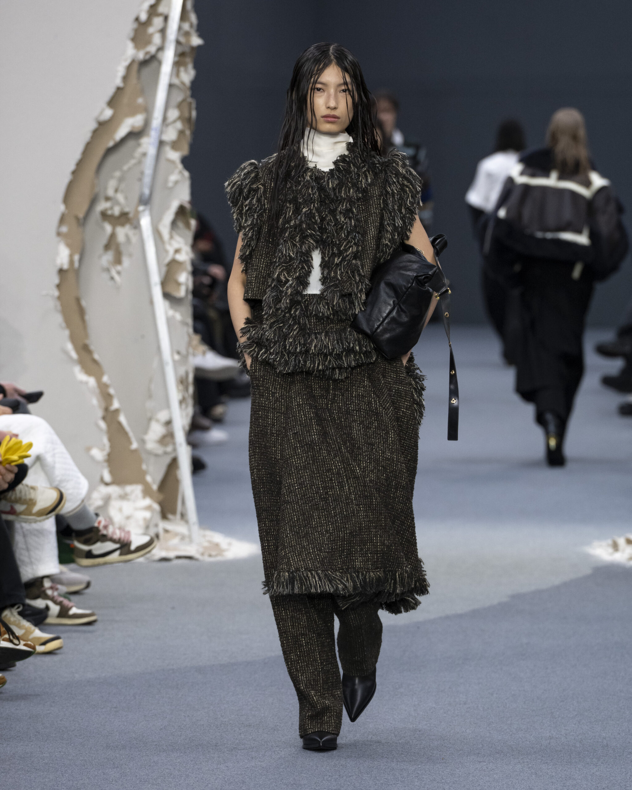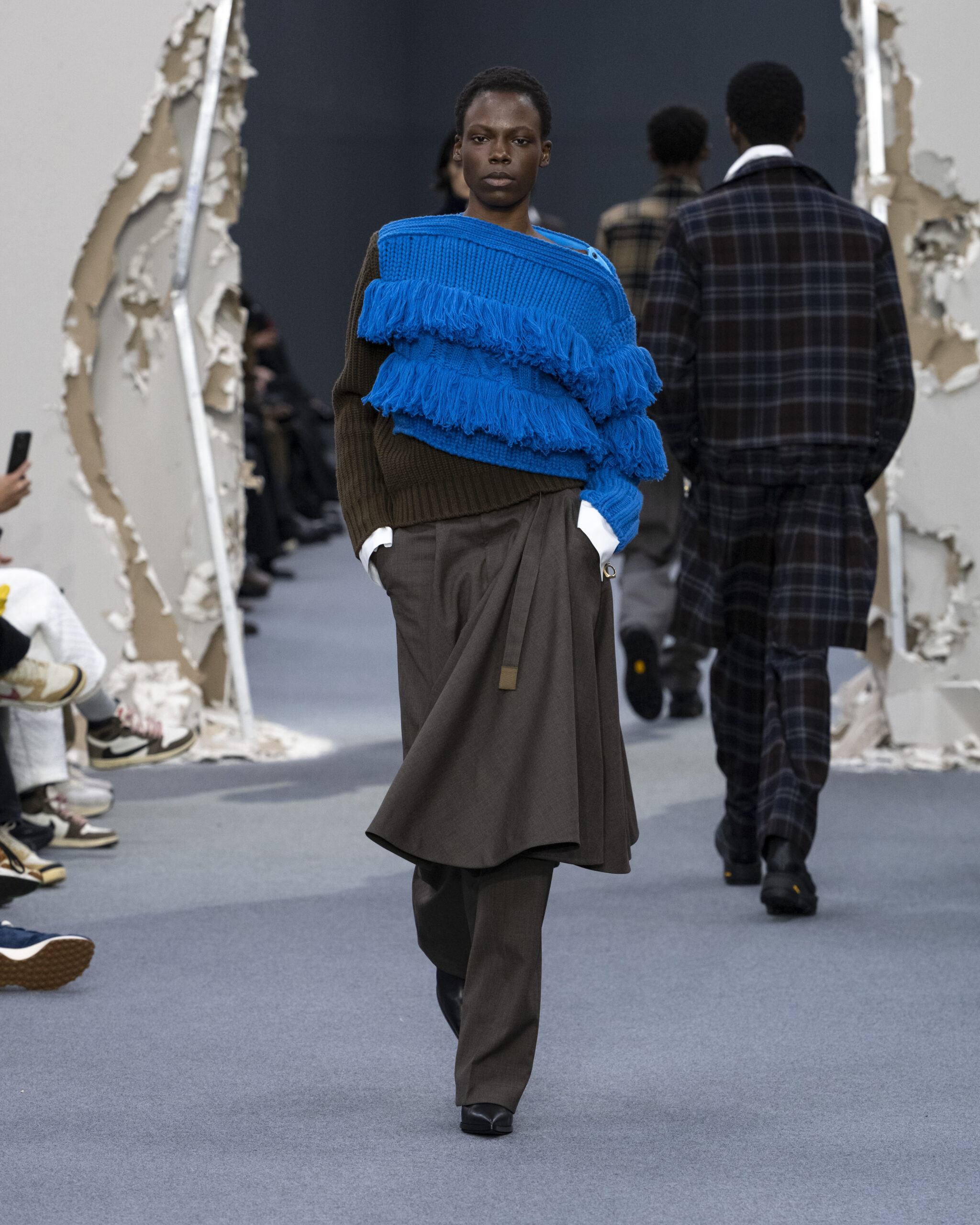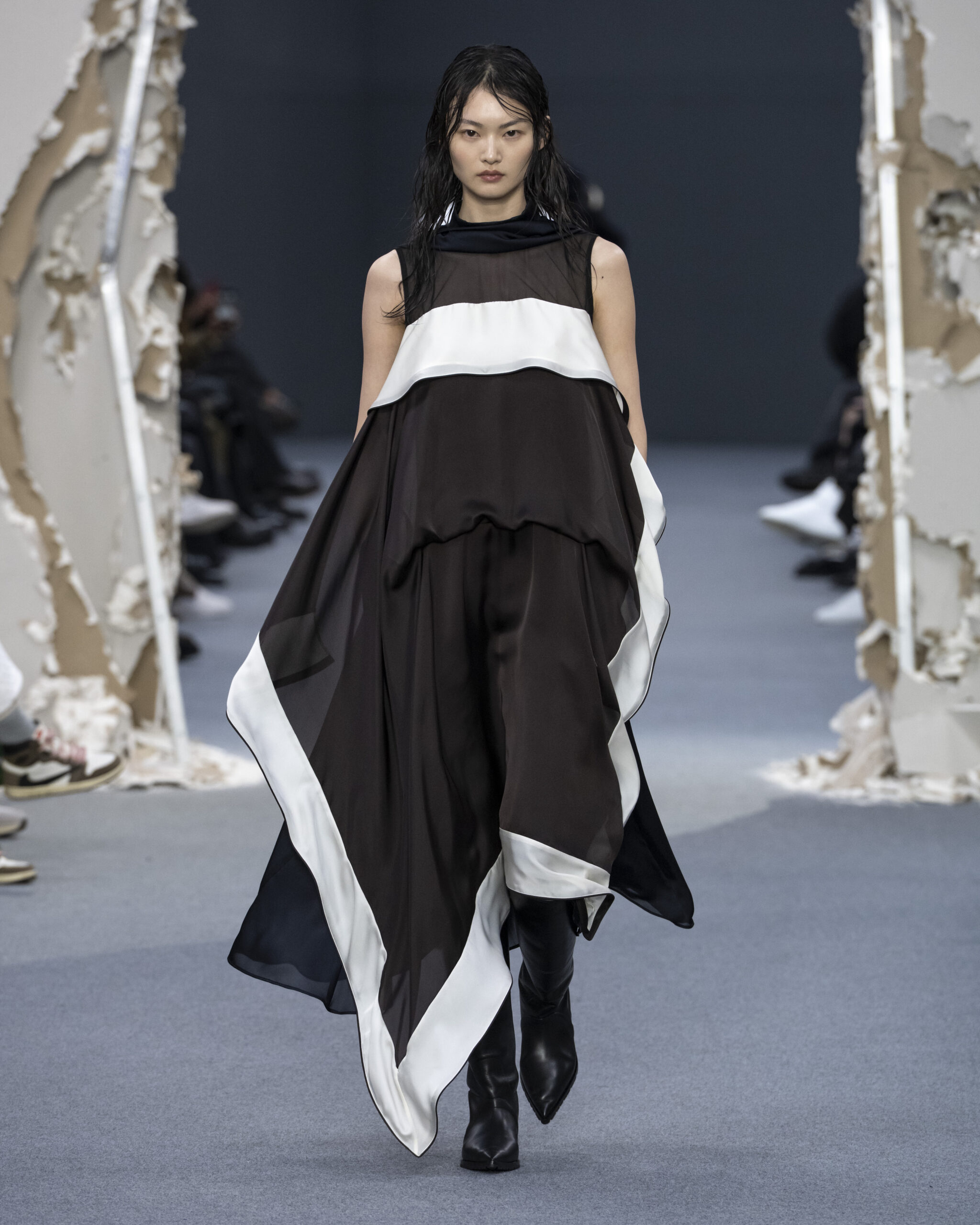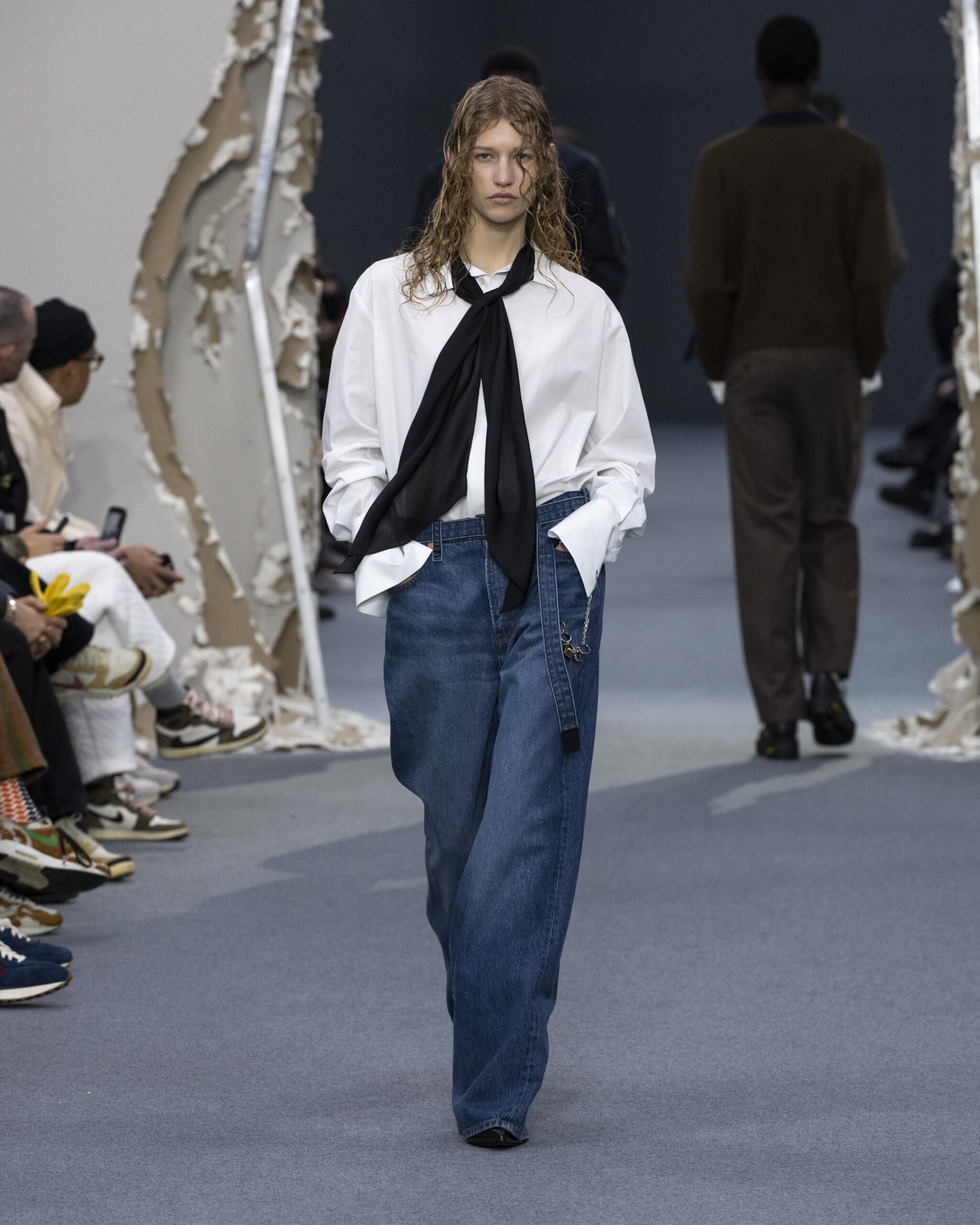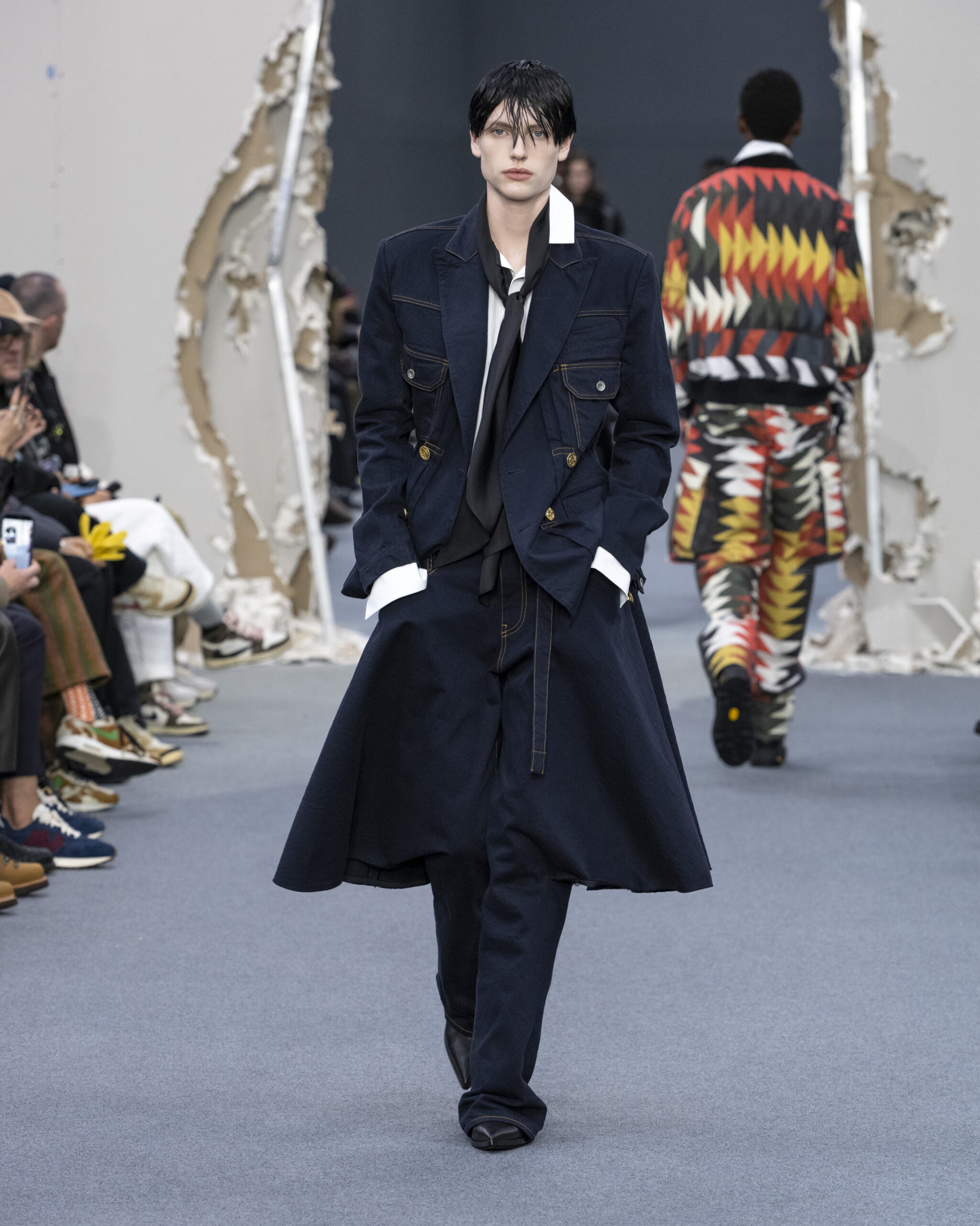 优雅的衬衫与领带成为造型焦点,丝巾般的领带不再紧系,而是轻柔环绕于领口。裙裤混搭是本季主打轮廓,通过结构巧思而非叠穿实现:先裁出阔腿裤版型,再经裁切重塑。夹克采用横向拼接工艺,下半部分与内衬相连,再以叠层实现一体化视觉效果。