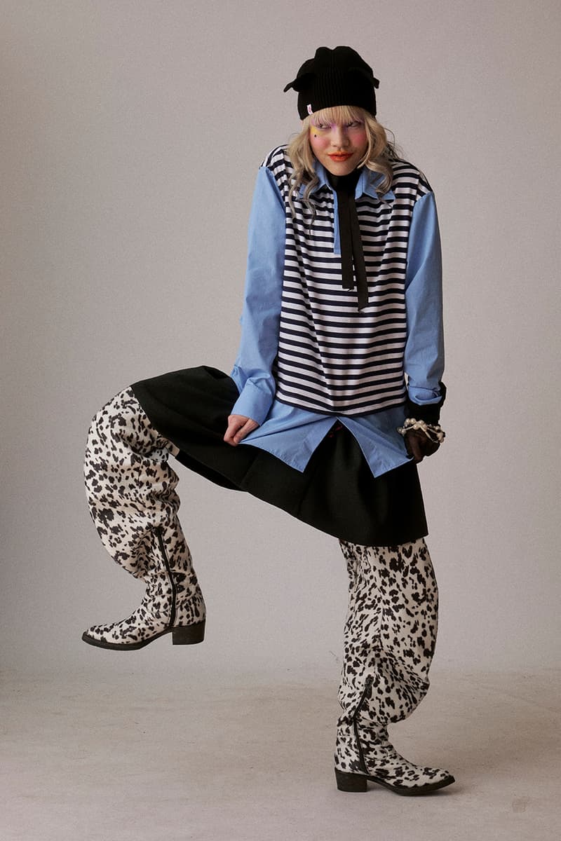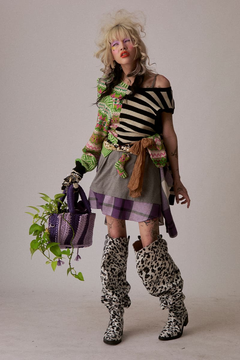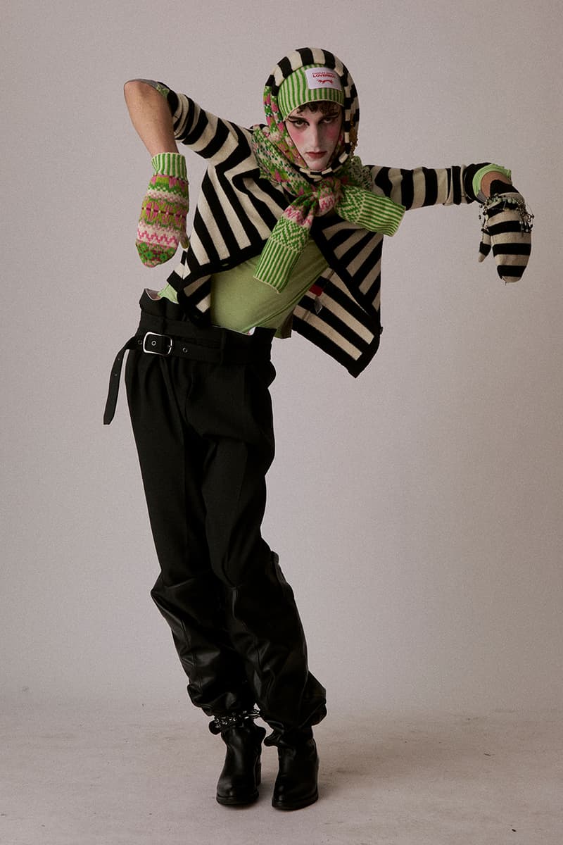 配饰与鞋履依旧是 LOVERBOY 的重要表达。本季首次展示人气 Banana shoes 与 Claw boots 的进阶延伸款式,并加入钩织动物造型包袋与大量针织单品,从蘑菇斑点图案到苹果绿 Fair Isle 编织一应俱全。Jeffrey 表示,「THISTLE」不仅是一次系列发布,更是为品牌未来定调的宣言——在产业持续动荡之中,LOVERBOY 将继续作为一个被保护的创作空间存在,「永远为怪人而生,也由怪人缔造」。该系列预计将于今年稍后登陆 Dover Street Market 及全球指定零售渠道。