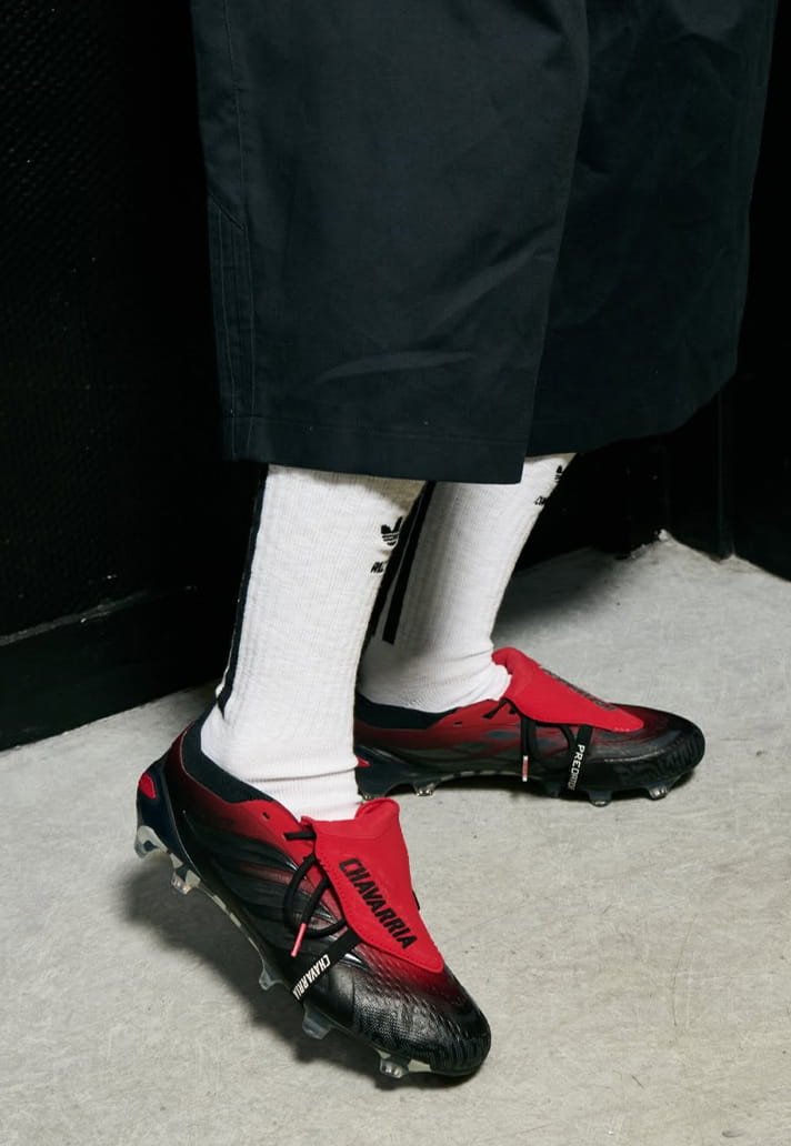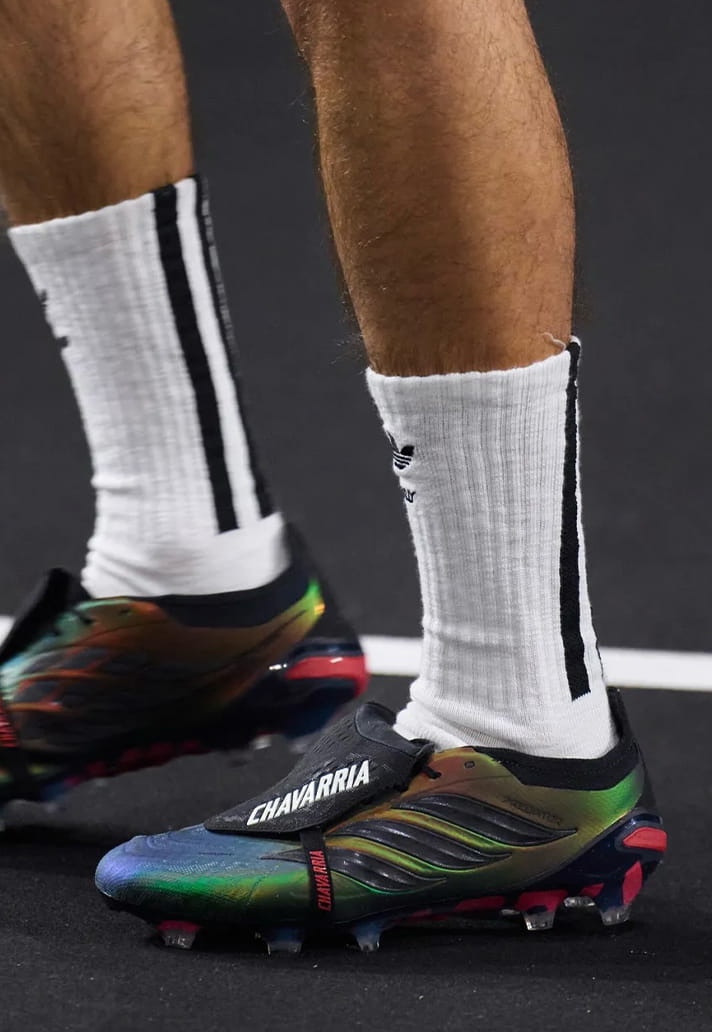 但真正抢尽风头的,还是两款 Willy Chavarria x adidas Predator 联名足球鞋。由 Chavarria 亲自操刀设计,一款采用极具侵略性的红黑配色,鞋面以黑色为主,向上渐变为红色;另一款则以近乎炫彩的光泽呈现,将未来主义美学与 Predator DNA 融为一体,鞋面采用金属质感的虹彩设计,根据光线变化,会在翠绿色、银色和深蓝色之间变换,最引人注目的特点是鞋舌上印有醒目的白色「CHAVARRIA」字样,取代了传统的 adidas 标志。Willy Chavarria x adidas Originals 系列预计将于 2026 年夏末上市。