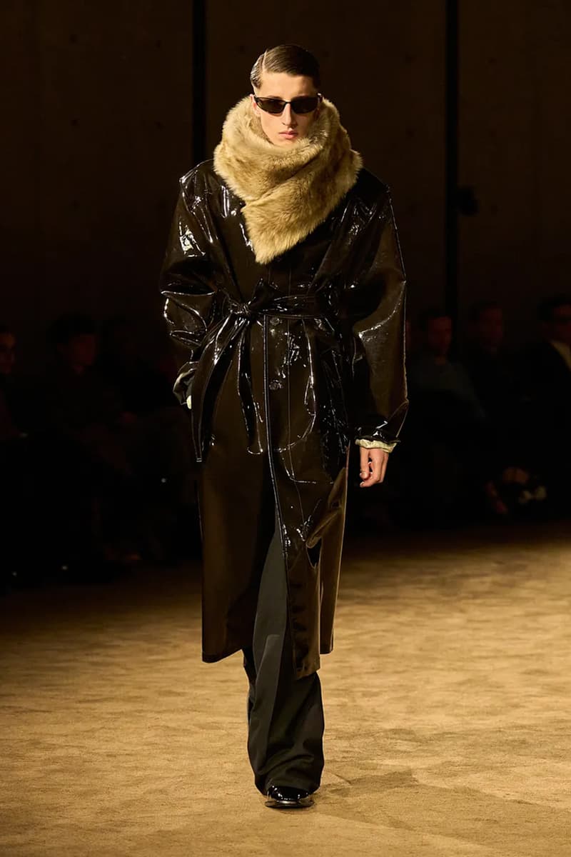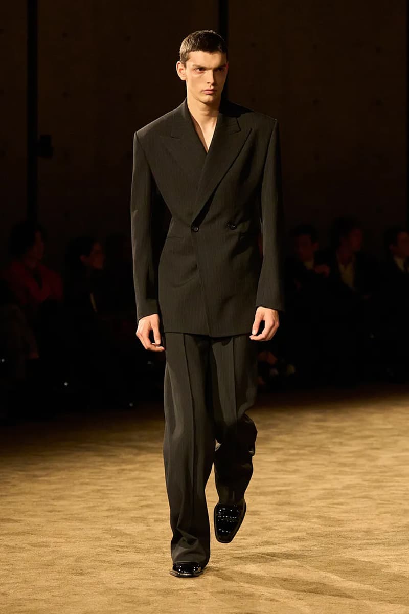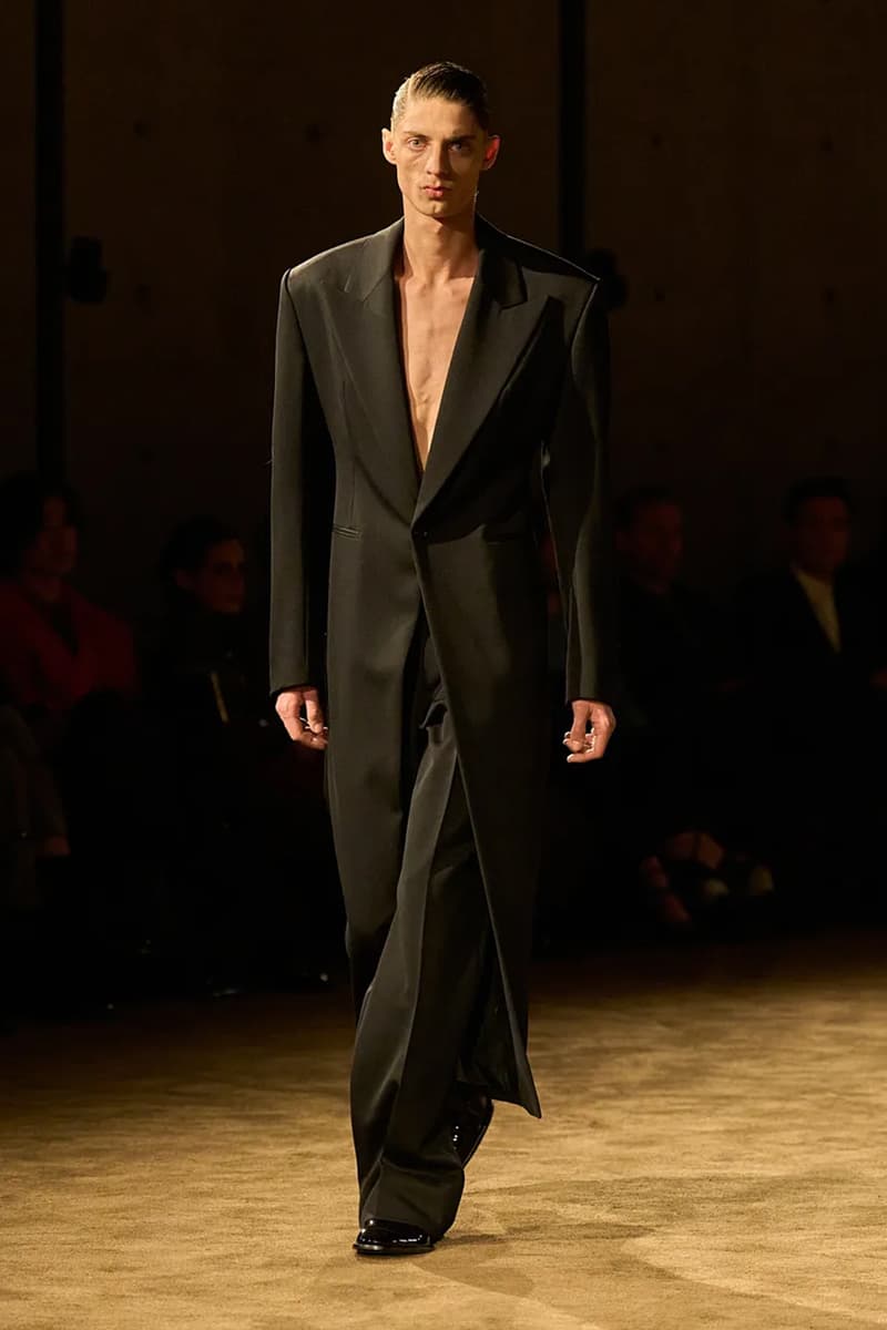 整体轮廓以修长流线与尖挺肩线为核心,营造出近乎披风般的守护感。柔软、略带褶皱的面料暗示被时间与情感刻下的痕迹,而锋利的结构则成为抵御外界目光的「铠甲」。Vaccarello 在纤细与力量之间取得平衡,重新思考男性气质在当代语境中的多重面向。